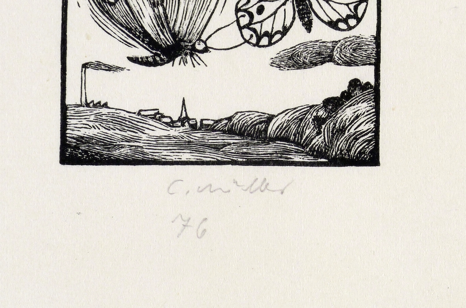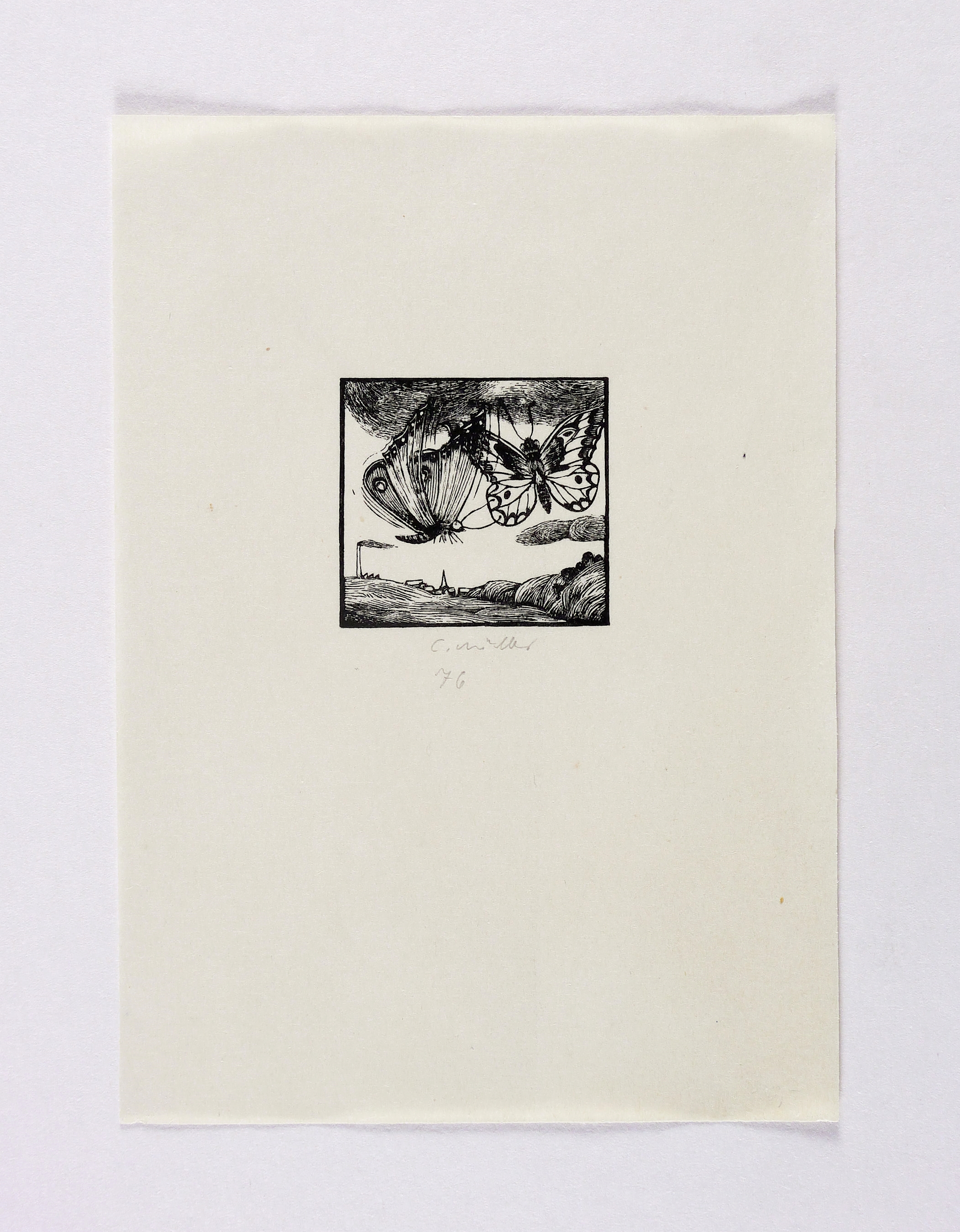 1976. Holzschnitt, in Schwarz, auf leichtem halbtransparentem Velin. – Originale Künstlergrafik, von Claus Müller-Schloen. – 3,7 x 3,9 cm (Darstellung / Einfassungslinie), 15 x 11 cm (Blatt).