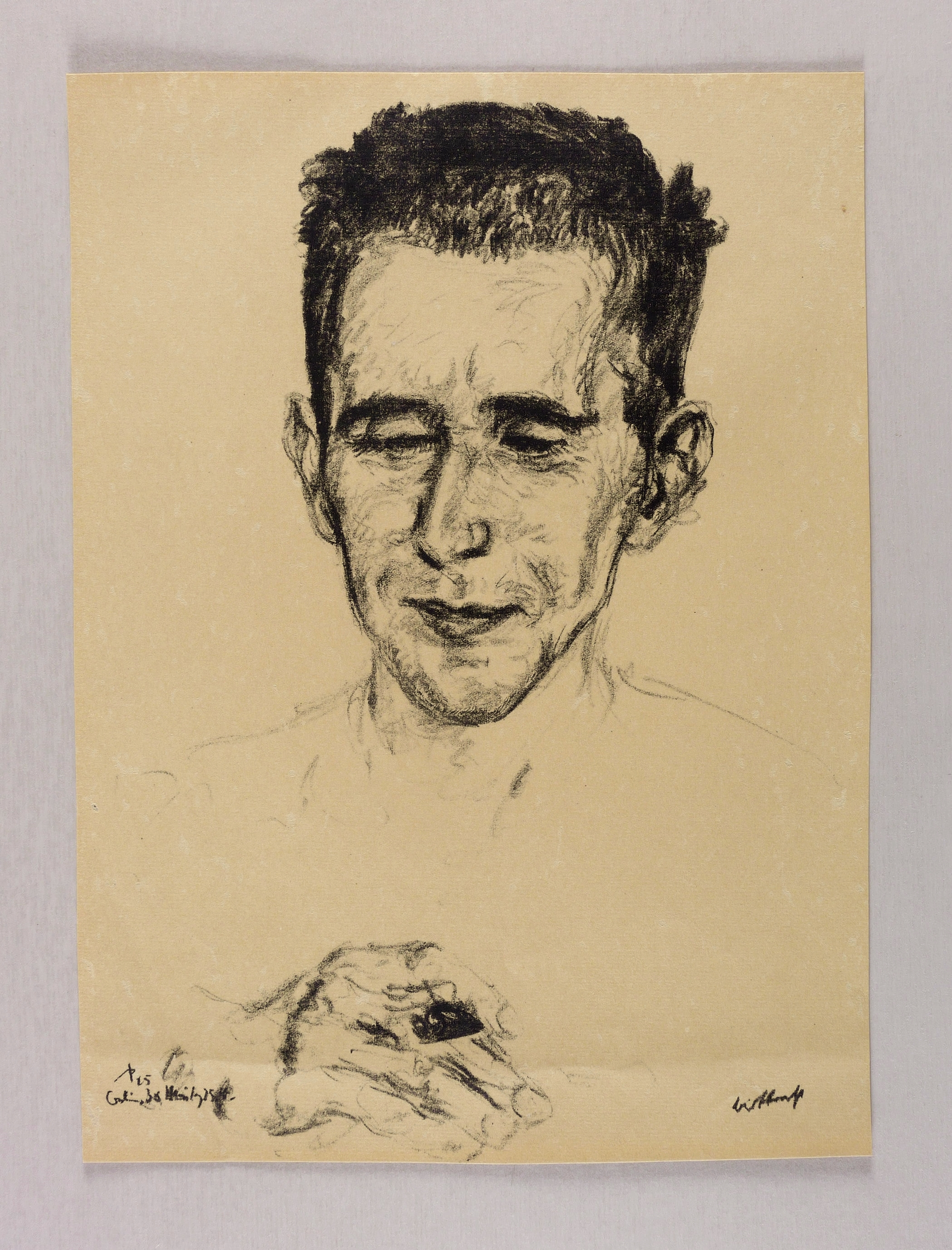 Nicht handsigniert. Im Stein rechts und links unten signiert, datiert und bezeichnet: ″EST 25 / (...) Montag 25.4. // bert brecht″. – Selten. – Ein Exemplar in der Sammlung des Deutschen Historischen Museums Berlin (Inv.- Nr. Gr 64/372). – Bertolt Brecht selbst soll diese Lithografie von Emil Stumpp als das beste Porträt, das je von ihm gezeichnet worden sei, hervorgehoben haben. – Provenienz: Sammlung Erhard Frommhold, Dresden. – Blatt wohl umlaufend beschnitten. Oberflächlich und dem Augenschein nach kaum merklich Wurmfraß. Im unteren Bereich leichte Knickspuren. Insgesamt mäßig guter Zustand.