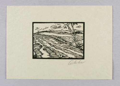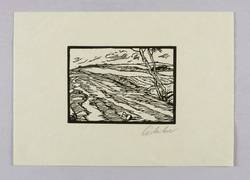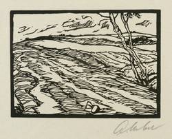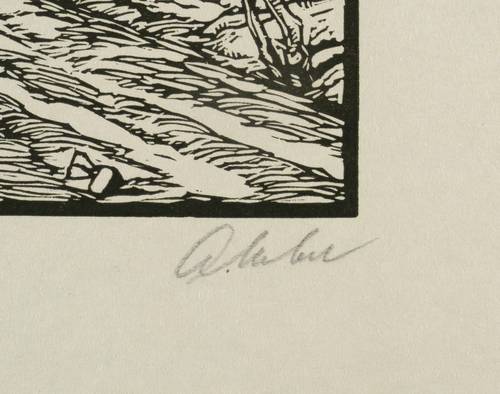 Um 1930. Linolschnitt, in Schwarz, auf leichtem gelbem Velin. – Originale Künstlergrafik, von Alfred Uebel. – Unikat. – 9,4 x 13,3 cm (Darstellung / Druckstock), 19 x 27 cm (Blatt).