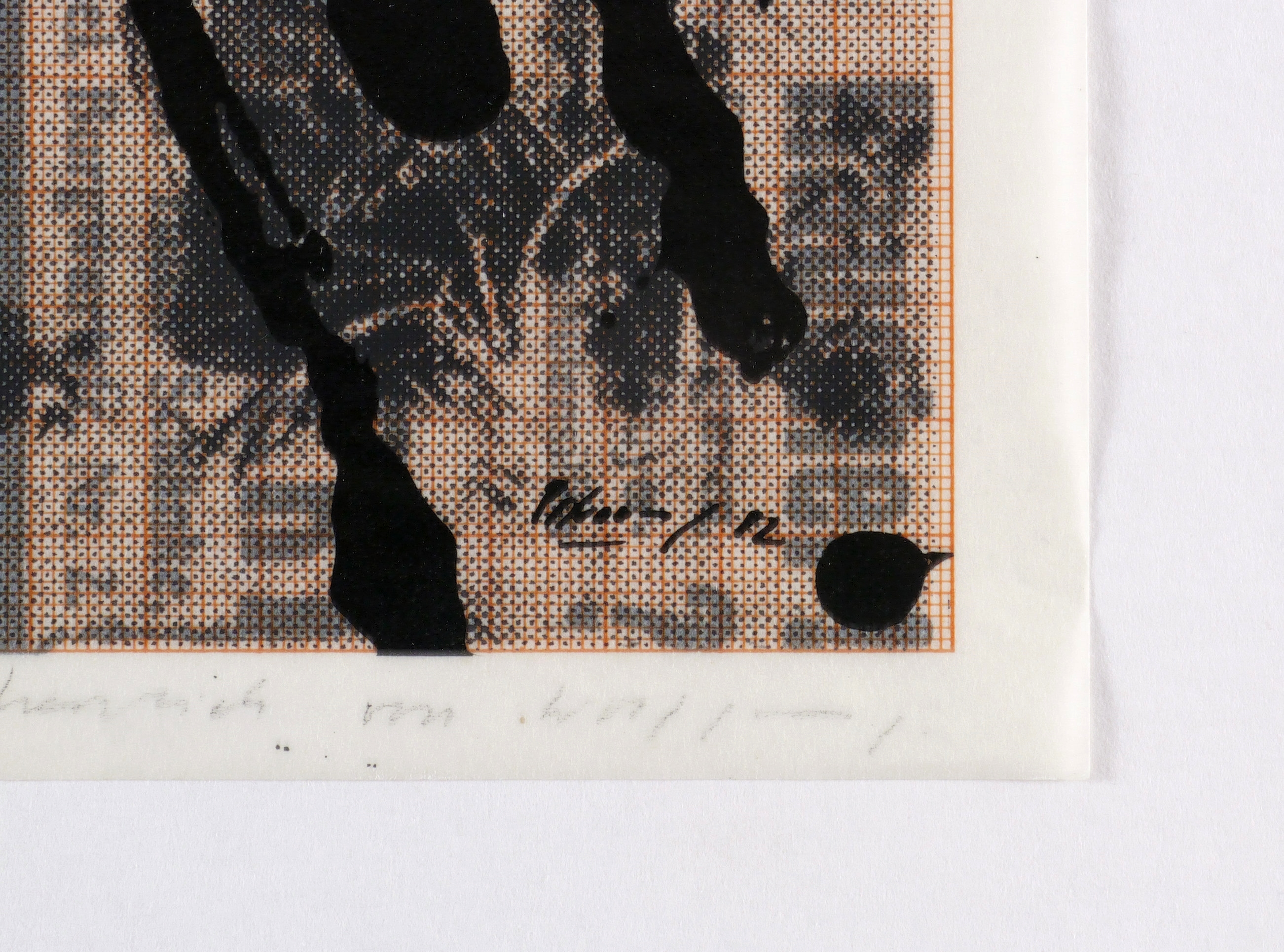 1982. Farbsiebdruck / Farbserigrafie, mit Fotomontage, in 2 Farben, mit Tusche überarbeitet, auf Transparentpapier. – Originale Künstlergrafik, von Wolfgang Petrovsky. – Probedruck. – 30 x 21 cm (Blatt), 28,1 x 19,0 cm (Darstellung / Druckbild).
