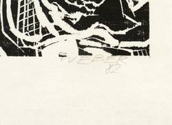 1982. Holzschnitt, in Schwarz, auf hellchamois Similijapan. – Originale Künstlergrafik, von Horst Weber. – 23,8 x 11,0 cm (Darstellung / Druckstock), 33 x 21 cm (Blatt).