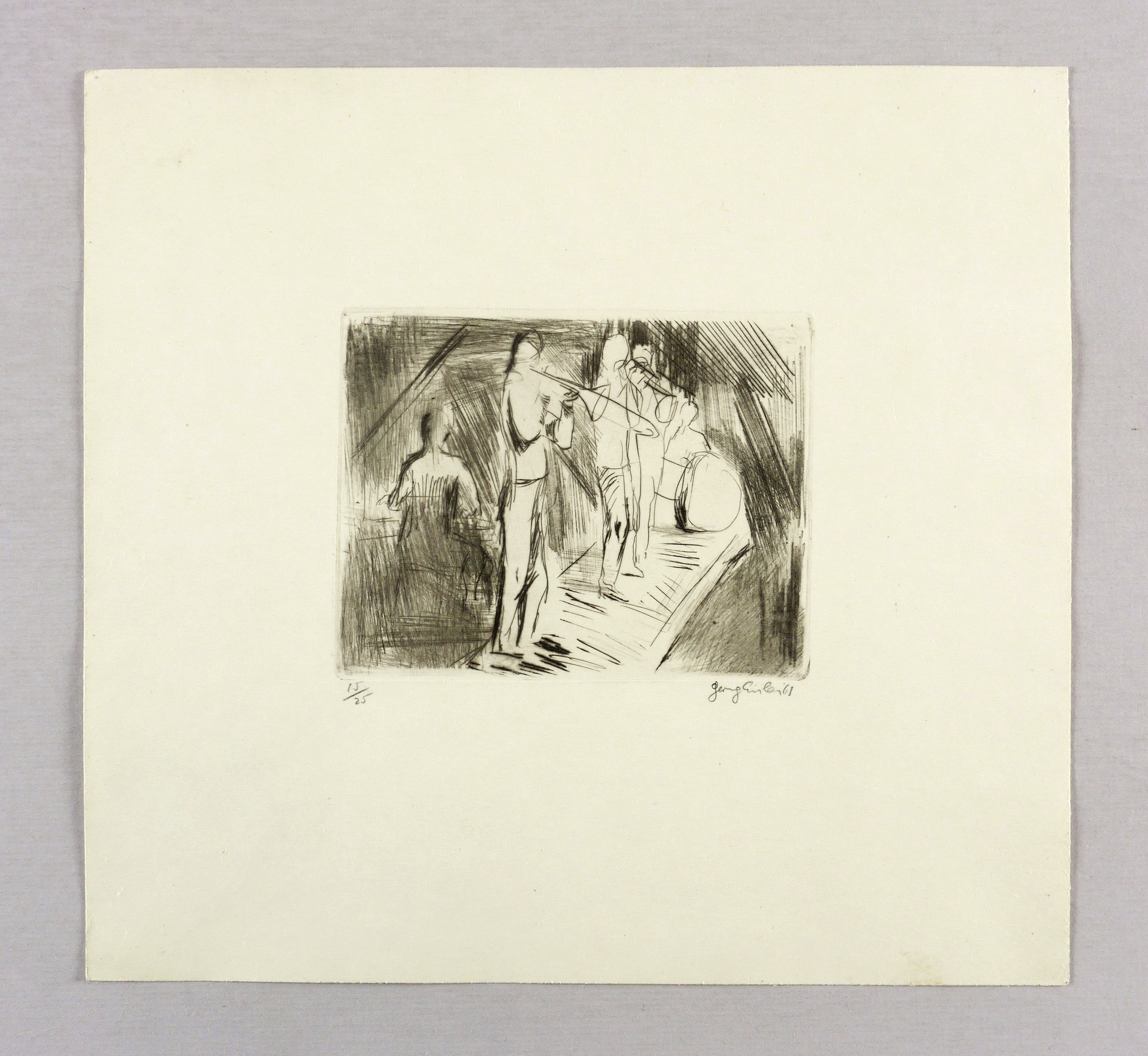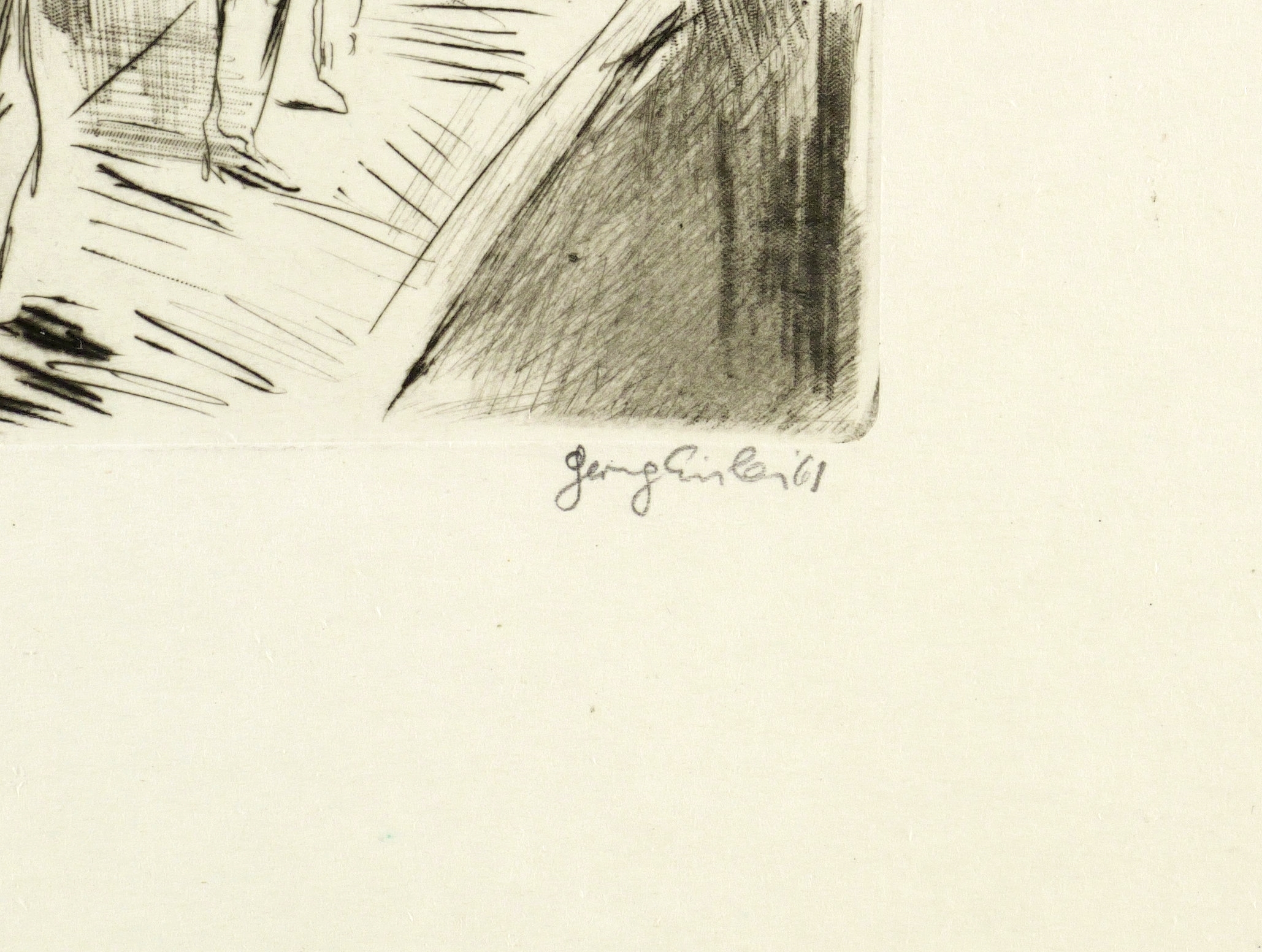 1961. Radierung / Kaltnadel, in Schwarz, auf hellchamois Velinkarton. – Originale Künstlergrafik, von Georg Eisler. – Auflage Exemplar Nr. 15/25. – 11,1 x 14,2 cm (Darstellung / Platte), 28 x 30 cm (Blatt).