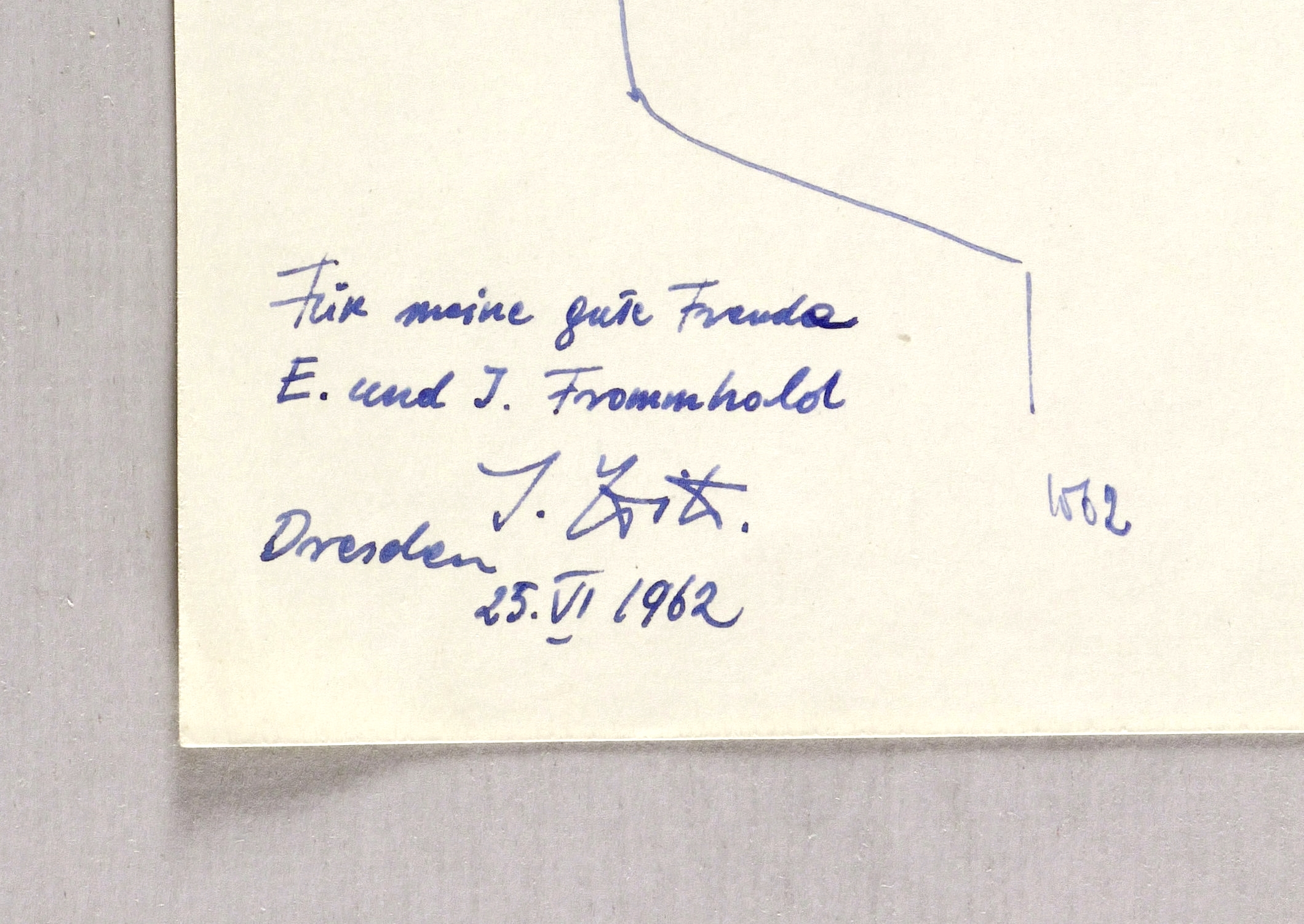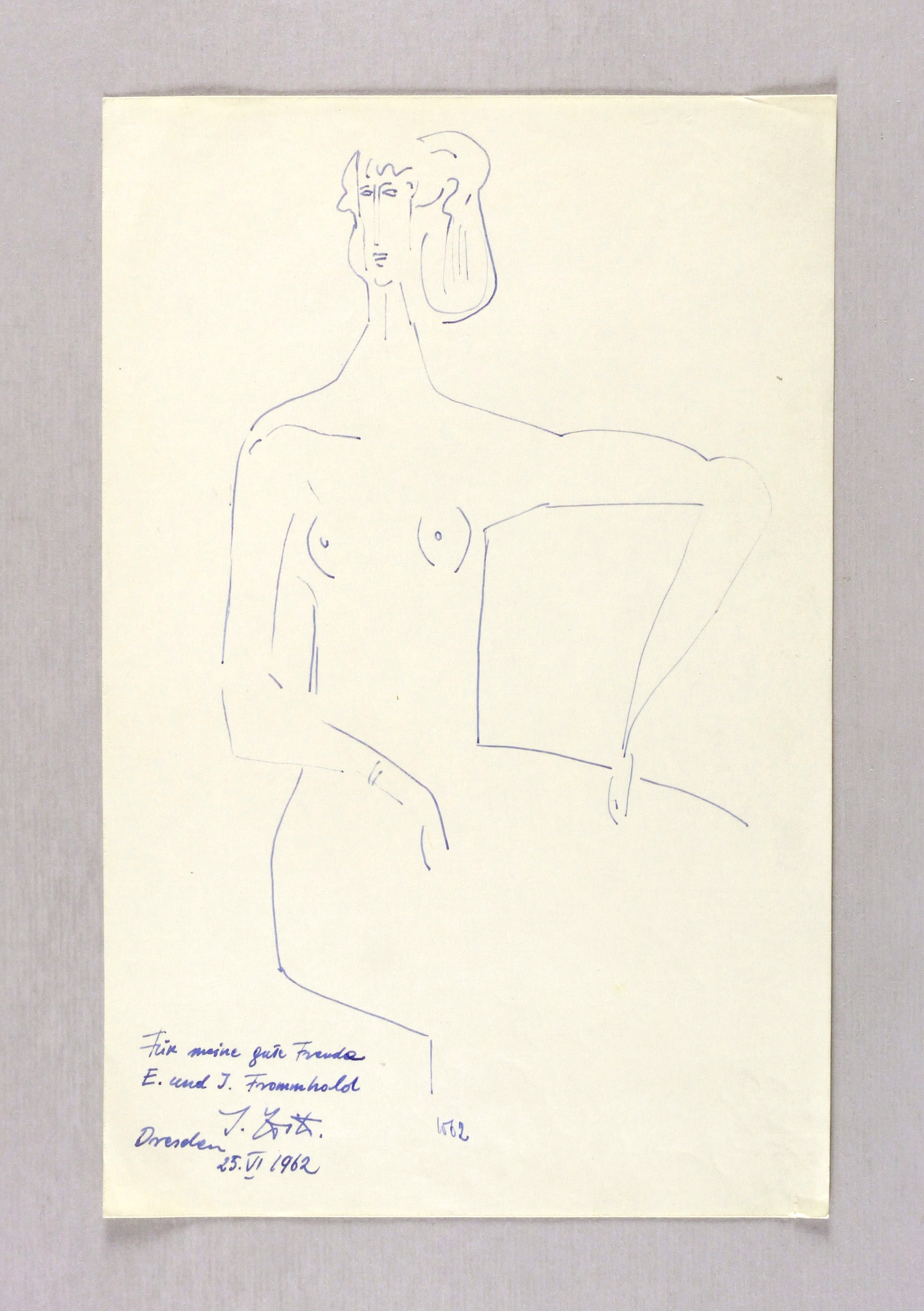 Links unten in blauer Feder signiert: ″I. Witz″. Dazu weiter bezeichnet: ″Für meine Freunde E. und I. Frommhold / Dresden 25.VI.1962″. – Provenienz: Sammlung Erhard Frommhold, Dresden. – Leichte Randmängel. Guter Zustand.