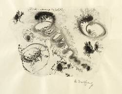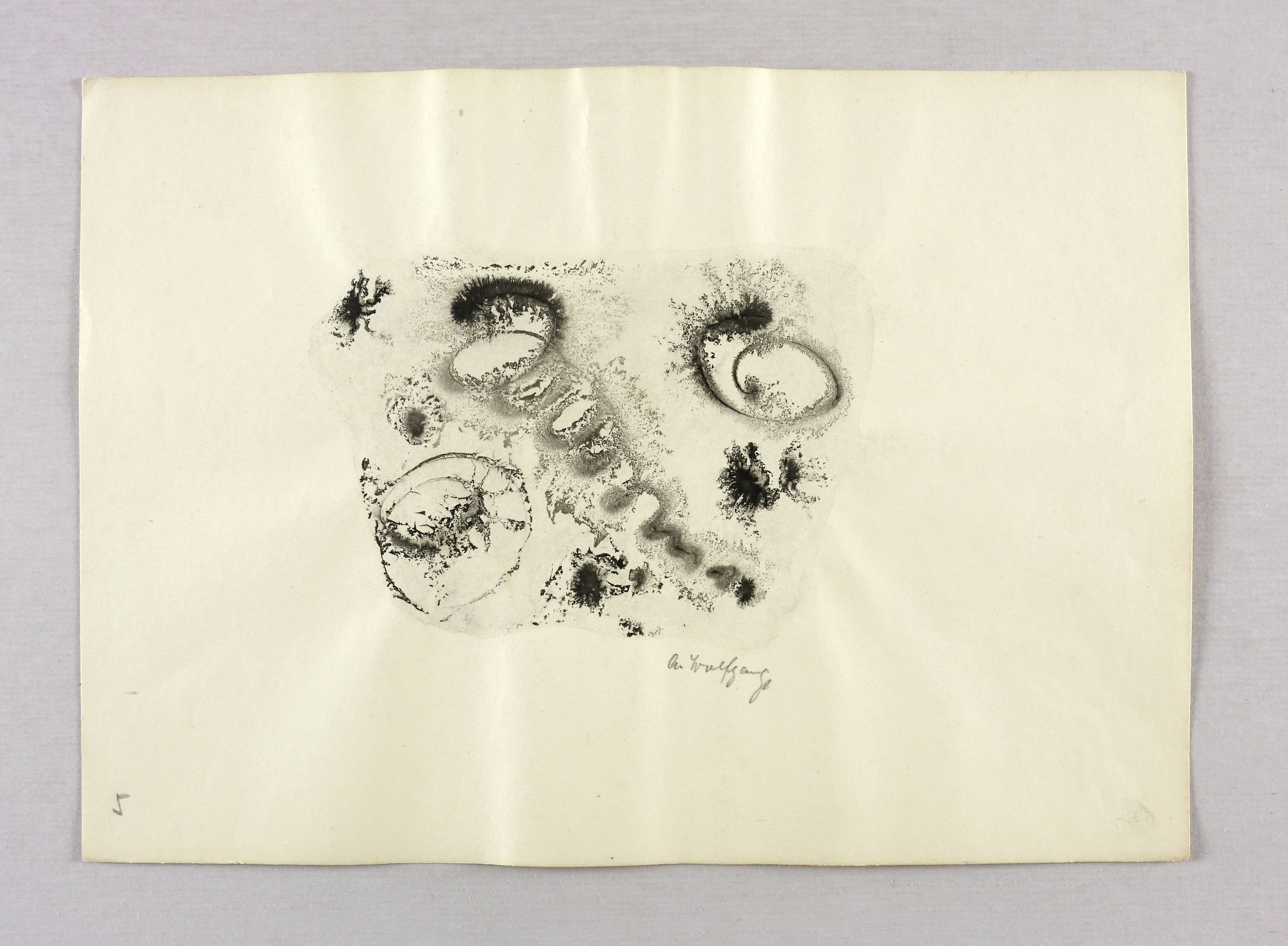 Rechts unten in Bleistift signiert: ″A. Wolfgang″. – Wie ein Aquarell sehr nass gearbeitet, mit häufig zufällig entstandenen Pigment- Verläufen. – Blattränder oben und unten durch den Herstellungsprozess leicht gewellt. Sonst sehr guter Zustand.
