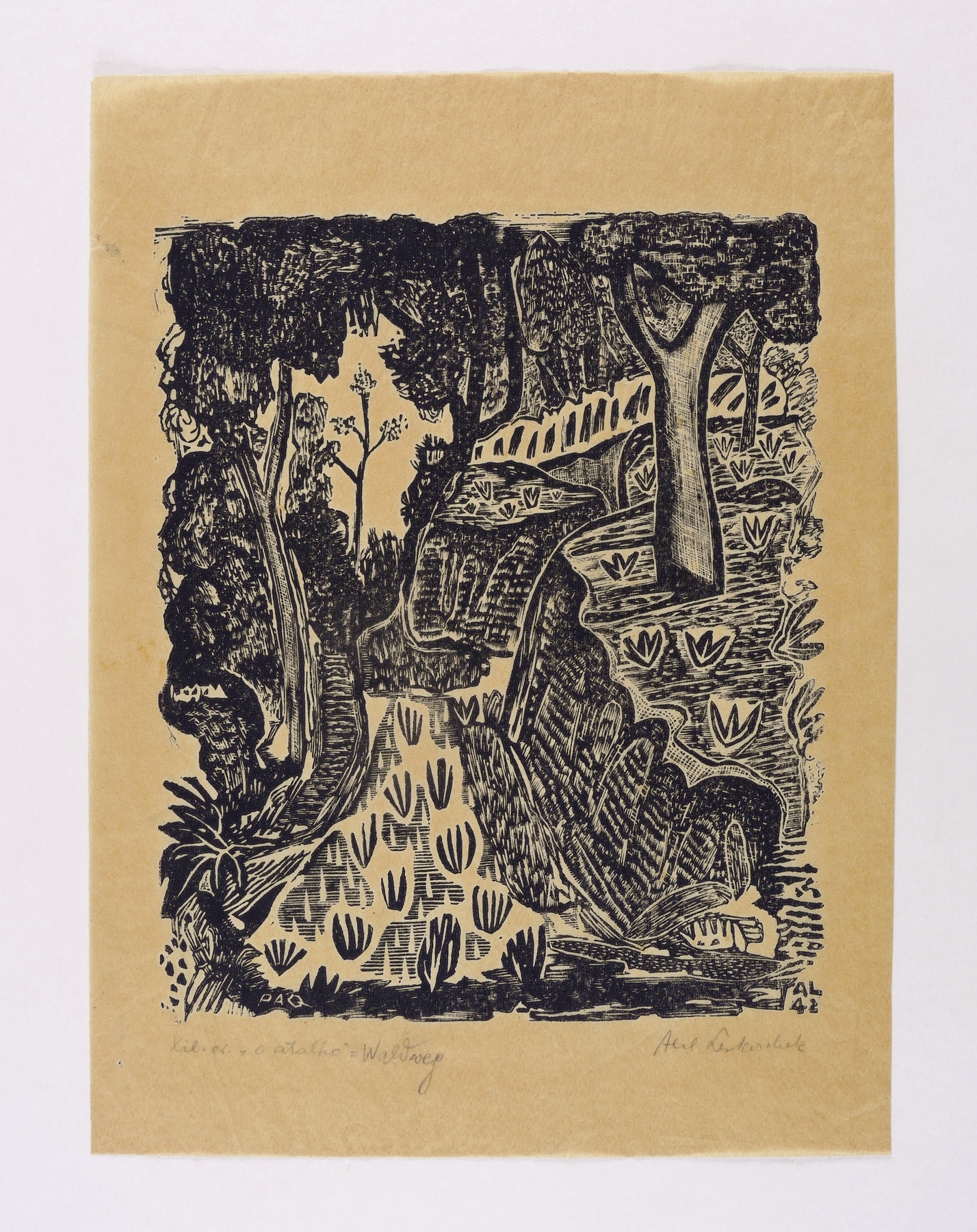 Rechts unten in Bleistift signiert: ″Axl Leskoschek″. Dazu links bezeichnet: ″Kil or - o atalho = Waldweg″. Im Druckstock rechts unten Monogramm und Jahr: ″AL 42″. – Abzug auf einem spezifischen Transparentpapier, das Leskoschek nachweislich für Drucke desselben Jahres nutzte. – Provenienz: Sammlung Erhard Frommhold, Dresden. Frommhold war langjähriger Lektor, Cheflektor und Verlagsleiter des Verlag der Kunst in Dresden. Hier erschien 1961 das Buch ″Der Illustrator Axl Leskoschek″ (Dresden: Verlag der Kunst 1961) mit einer Einführung von Ina Jun-Broda. – Sehr guter Zustand.