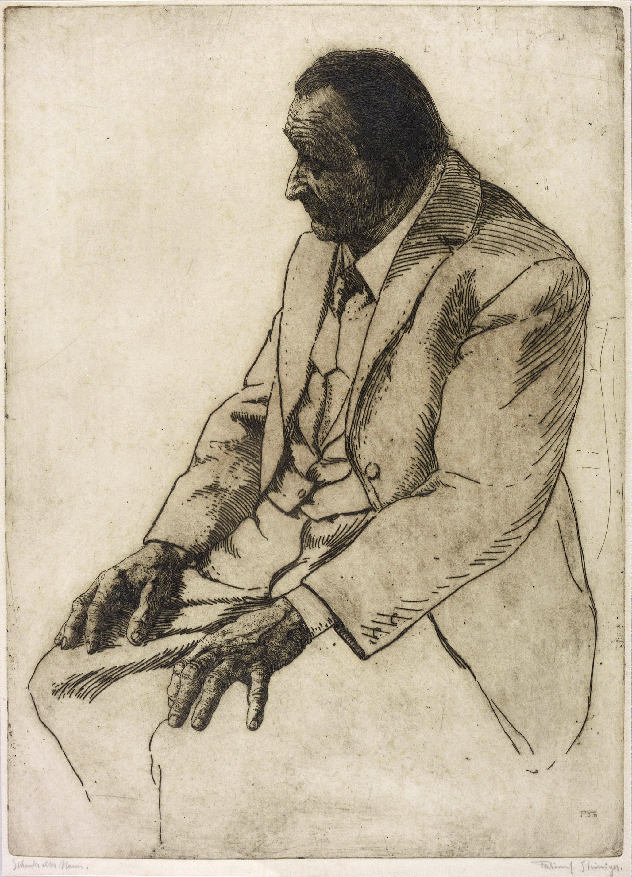 Rechts unten in Bleistift signiert: ″Ferdinand Steiniger.″ Links bezeichnet: ″Sitzender alter Mann″. In der Platte rechts unten Monogramm und Jahr: ″FST 11″. – Sehr guter Zustand.