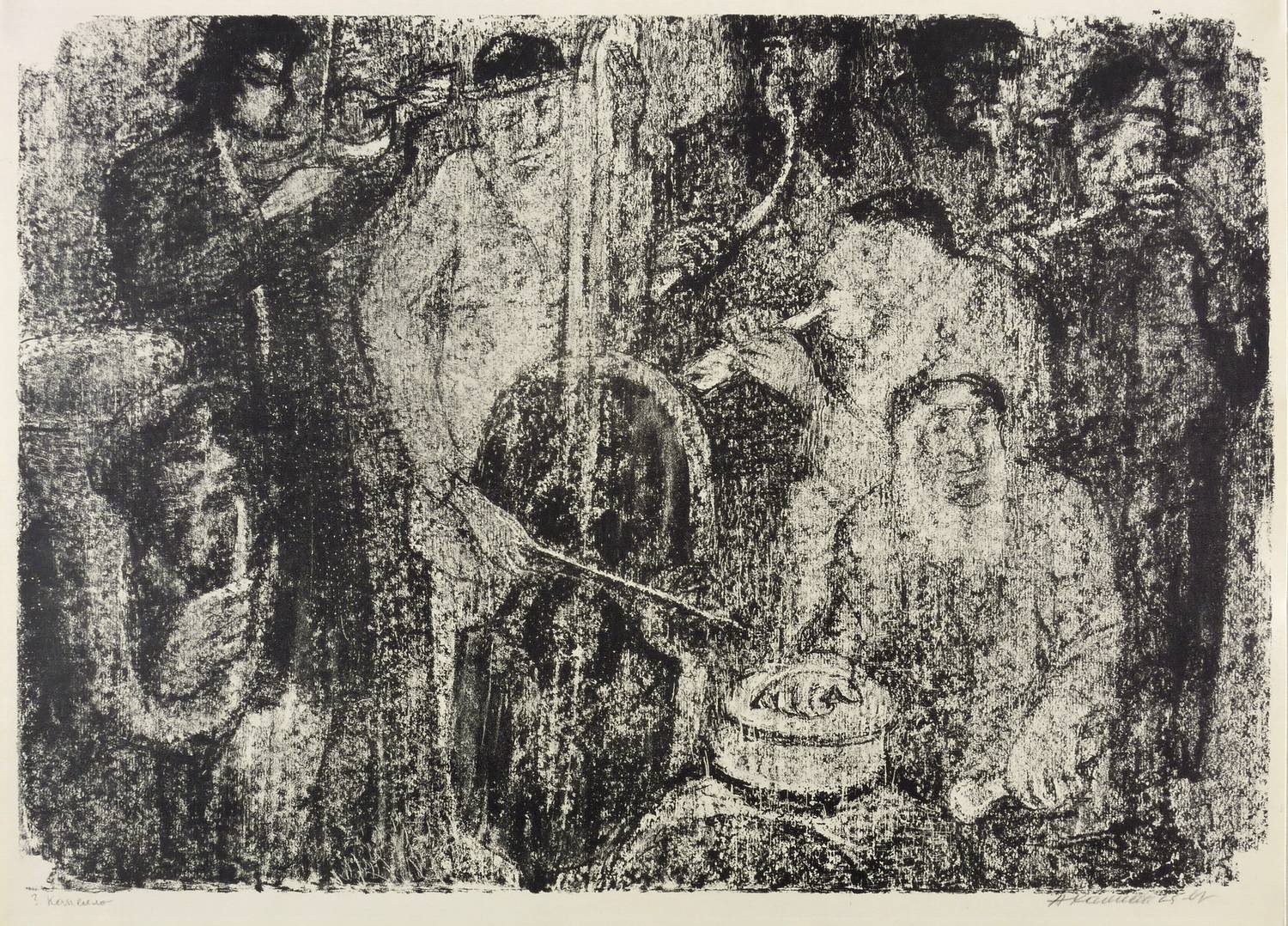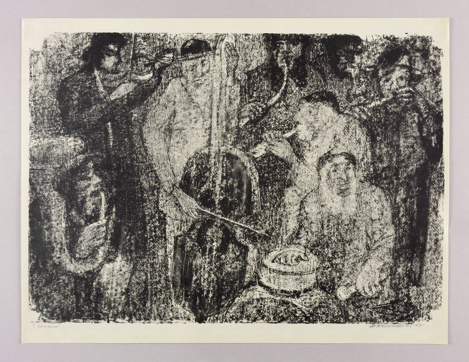 1965-1967. Lithografie / Pinsel- & Kreidelithografie, partiell gespritzt & geschabt, in Schwarz, auf gelbem Velin. – Originale Künstlergrafik, von Anatoli Kaplan. – 42,1 x 60,0 cm (Darstellung / Druckbild), 48 x 62 cm (Blatt).