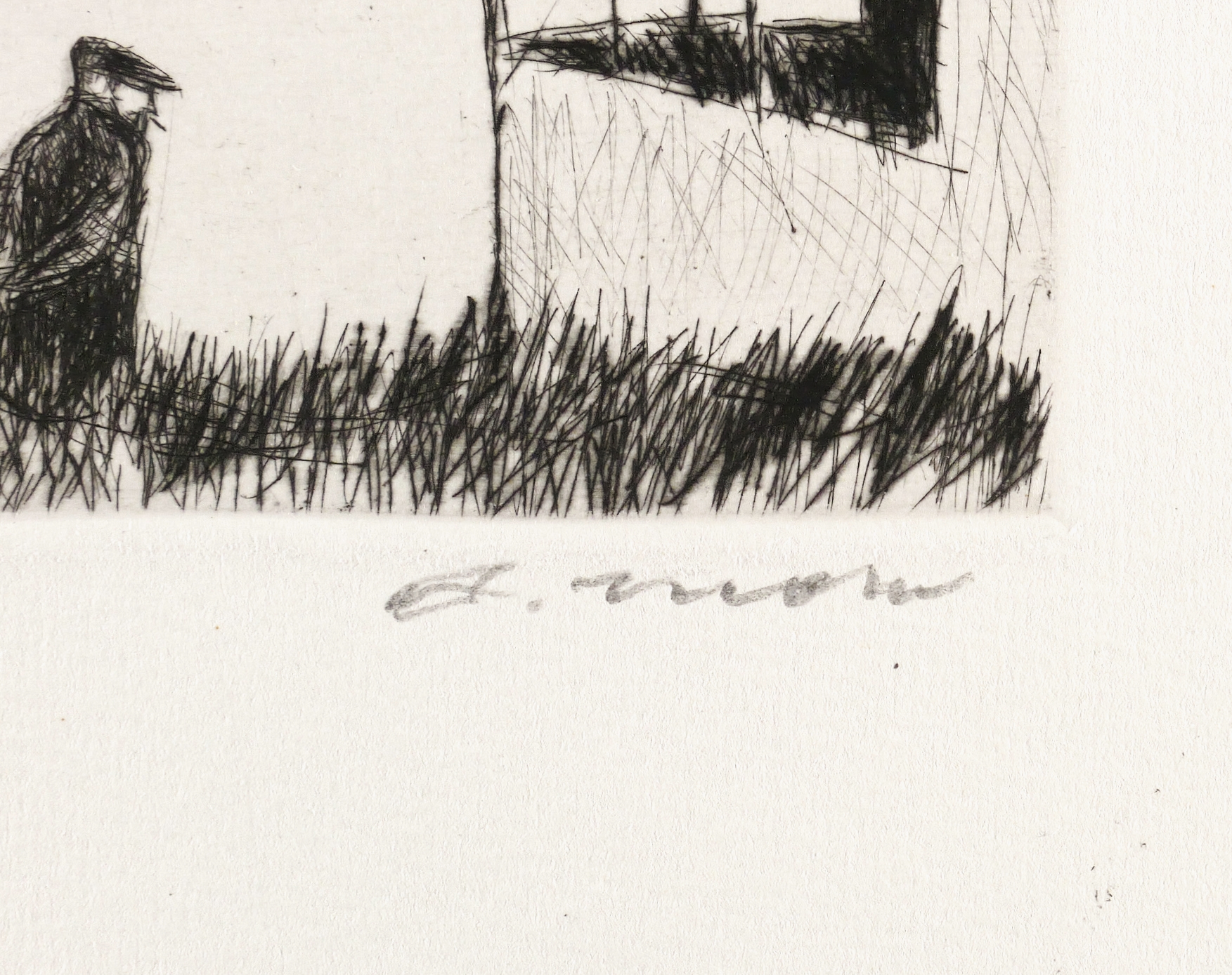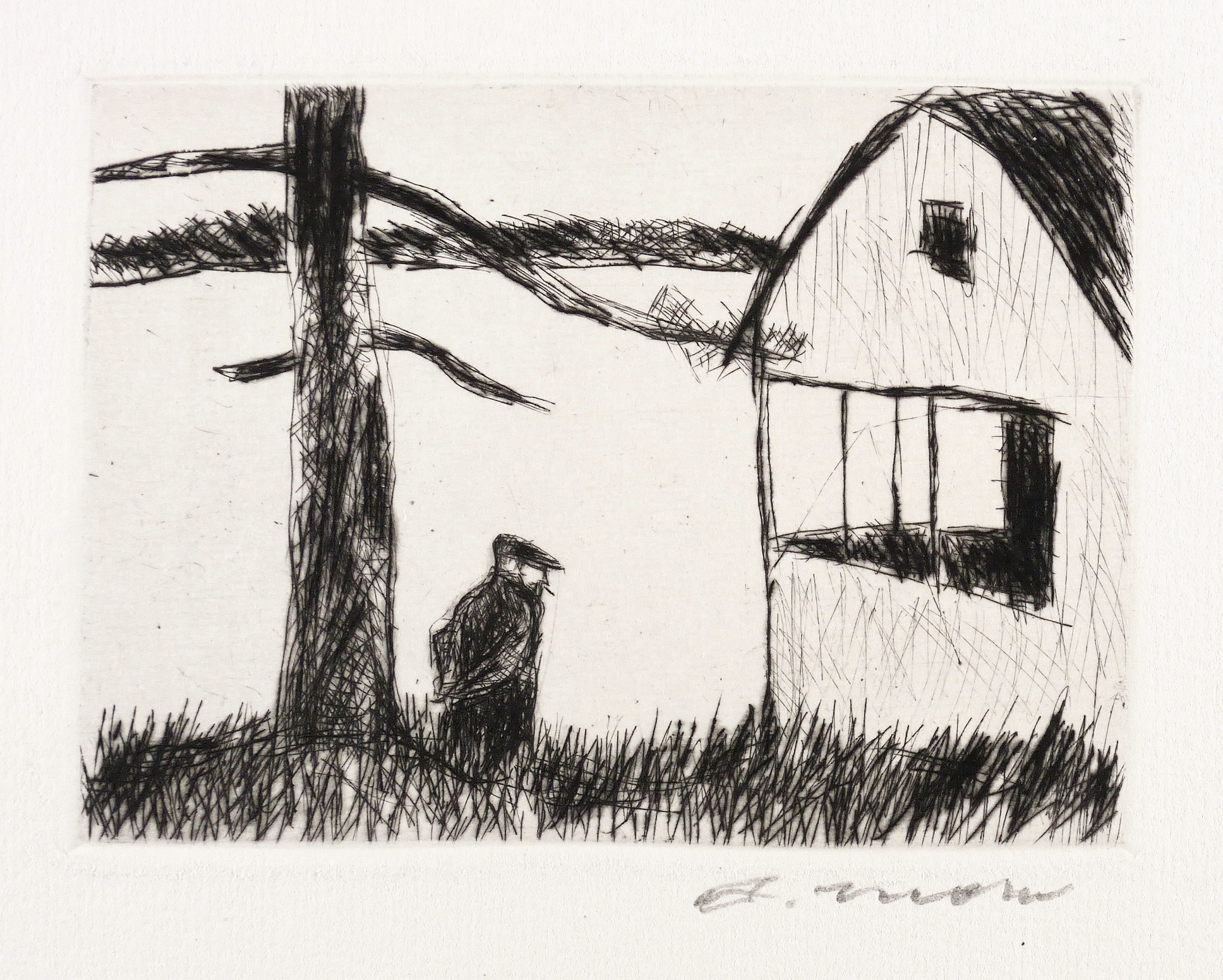 1960. Radierung / Kaltnadel, in Schwarz, auf hellchamois Weißenborn. – Originale Künstlergrafik, von Arno Mohr. – 10,0 x 13,5 cm (Darstellung / Platte), 22 x 31 cm (Blatt).