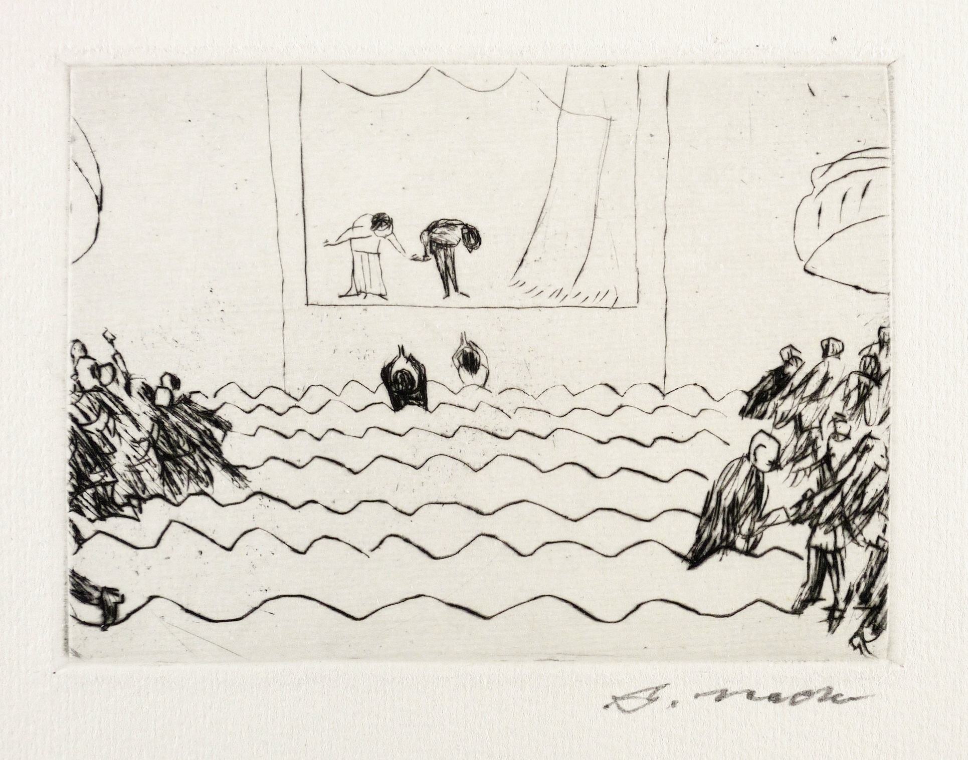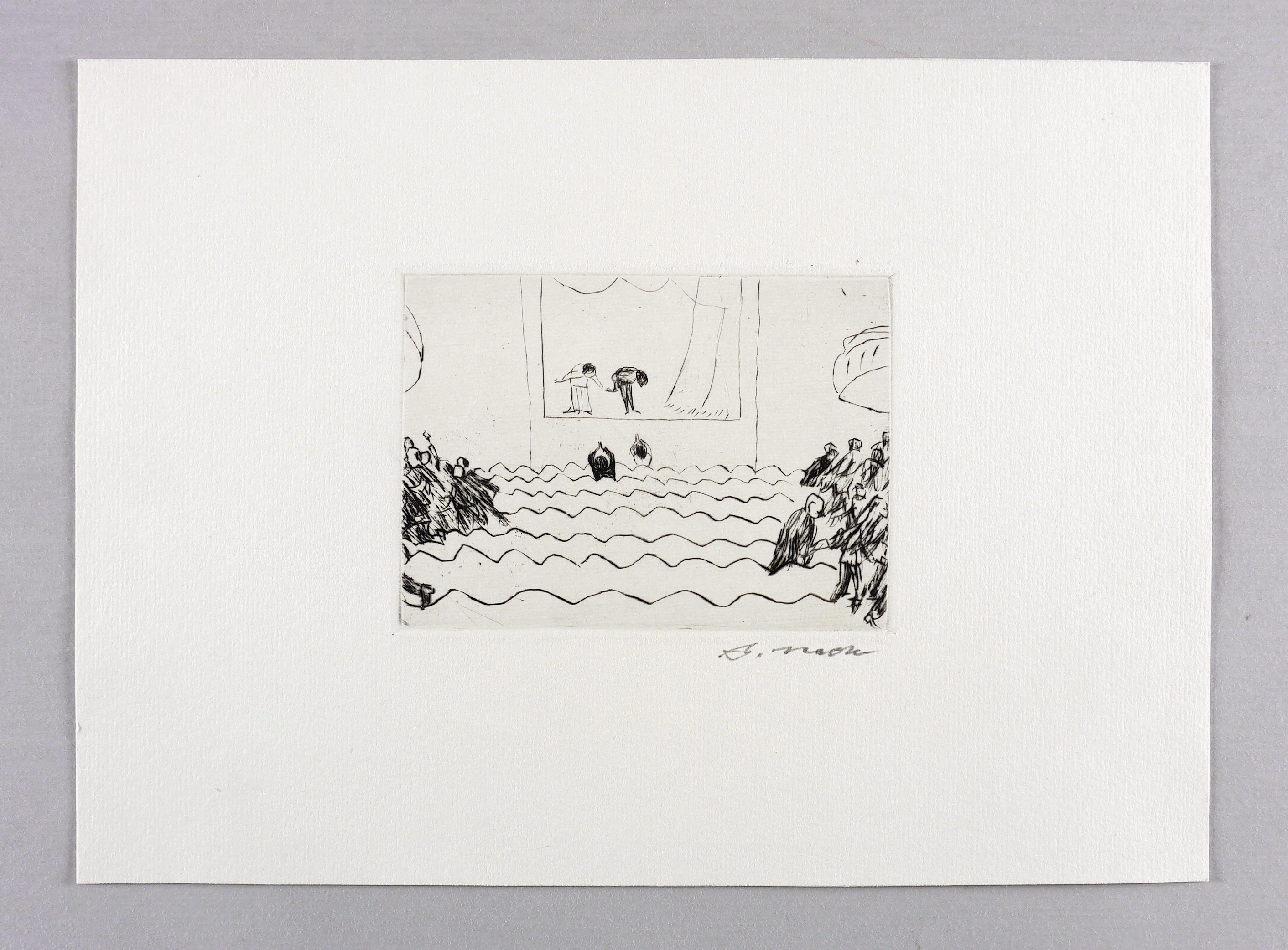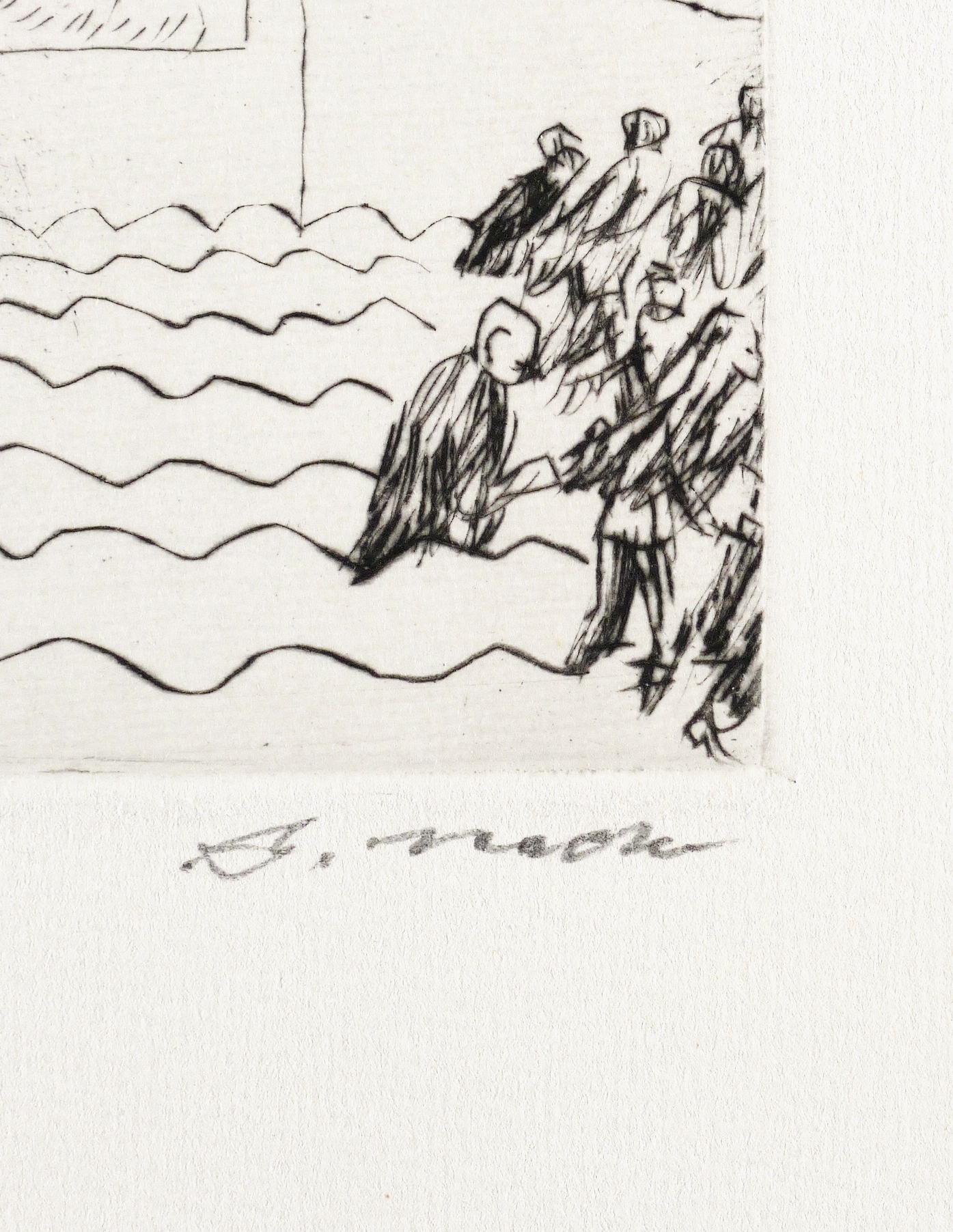 Um 1960. Radierung / Kaltnadel, in Schwarz, auf hellchamois Weißenborn. – Originale Künstlergrafik, von Arno Mohr. – 10,2 x 13,7 cm (Darstellung / Platte), 23 x 31 cm (Blatt).