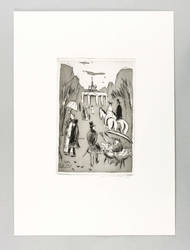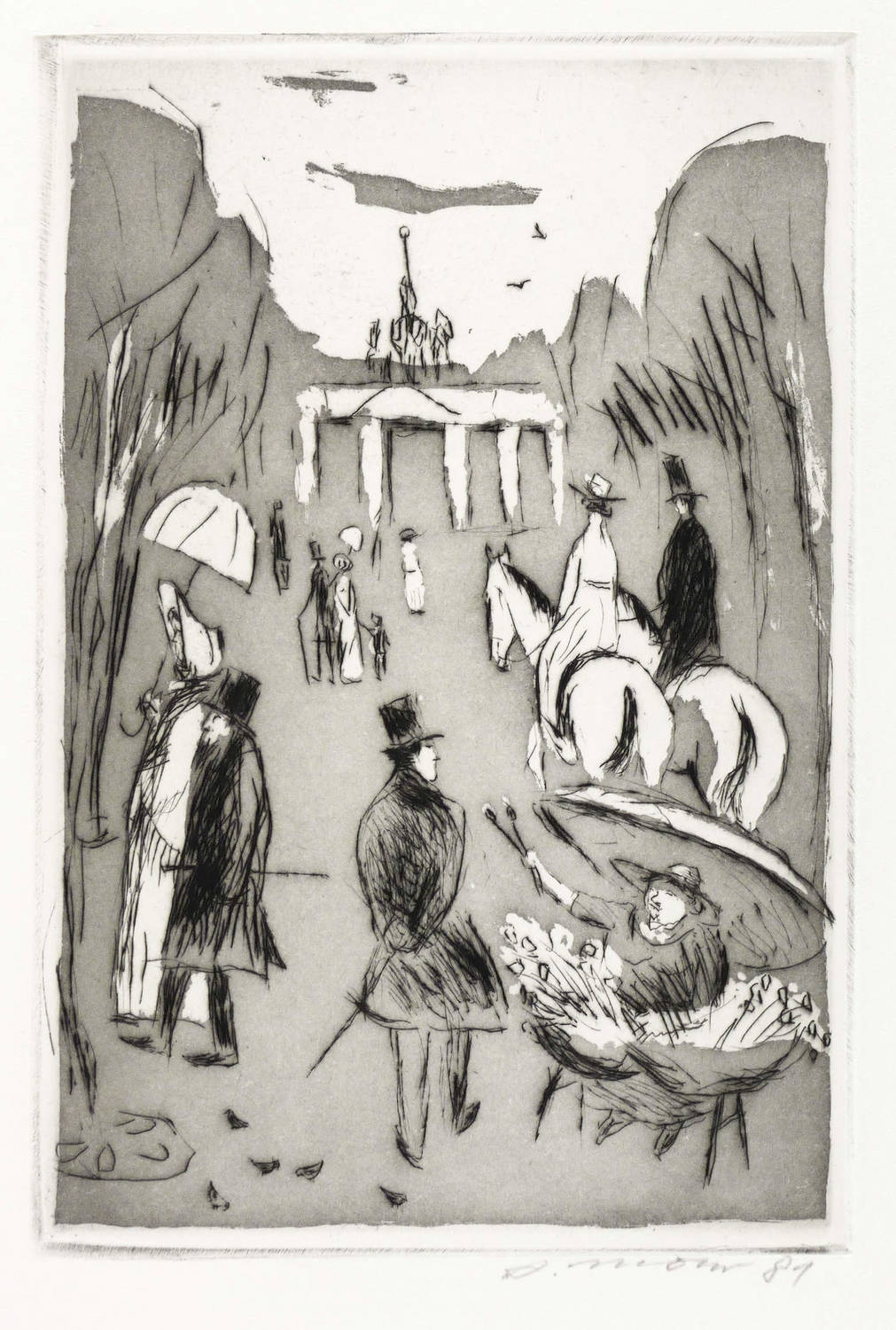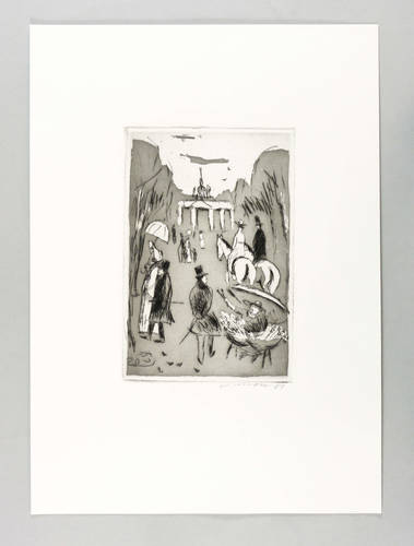 Aus: Grafik zu Heinrich Heine (Leipzig: Verband Bildender Künstler & Hochschule für Grafik und Buchkunst 1981). – Rechts unten in Bleistift signiert und datiert: ″A. Mohr 81″. Verso Auflagenbezeichnung. – Gedruckt bzw. abgezogen vom Künstler selbst. – Bildfindung zu Heinrich Heine: ″Ja, das sind die berühmten Linden, wovon Sie soviel gehört haben. Mich durchschaudert's, wenn ich denke: Auf dieser Stelle hat vielleicht Lessing gestanden, unter diesen Bäumen war der Lieblingsspaziergang so vieler großer Männer, die in Berlin gelebt; hier ging der große Fritz, hier wandelte - Er! Aber ist die Gegenwart nicht auch herrlich? Es ist just zwölf und die Spaziergangszeit der schönen Welt. Die geputzte Menge treibt sich die Linden auf und ab ...″ – Vorzüglich erhalten. Sehr guter Zustand.