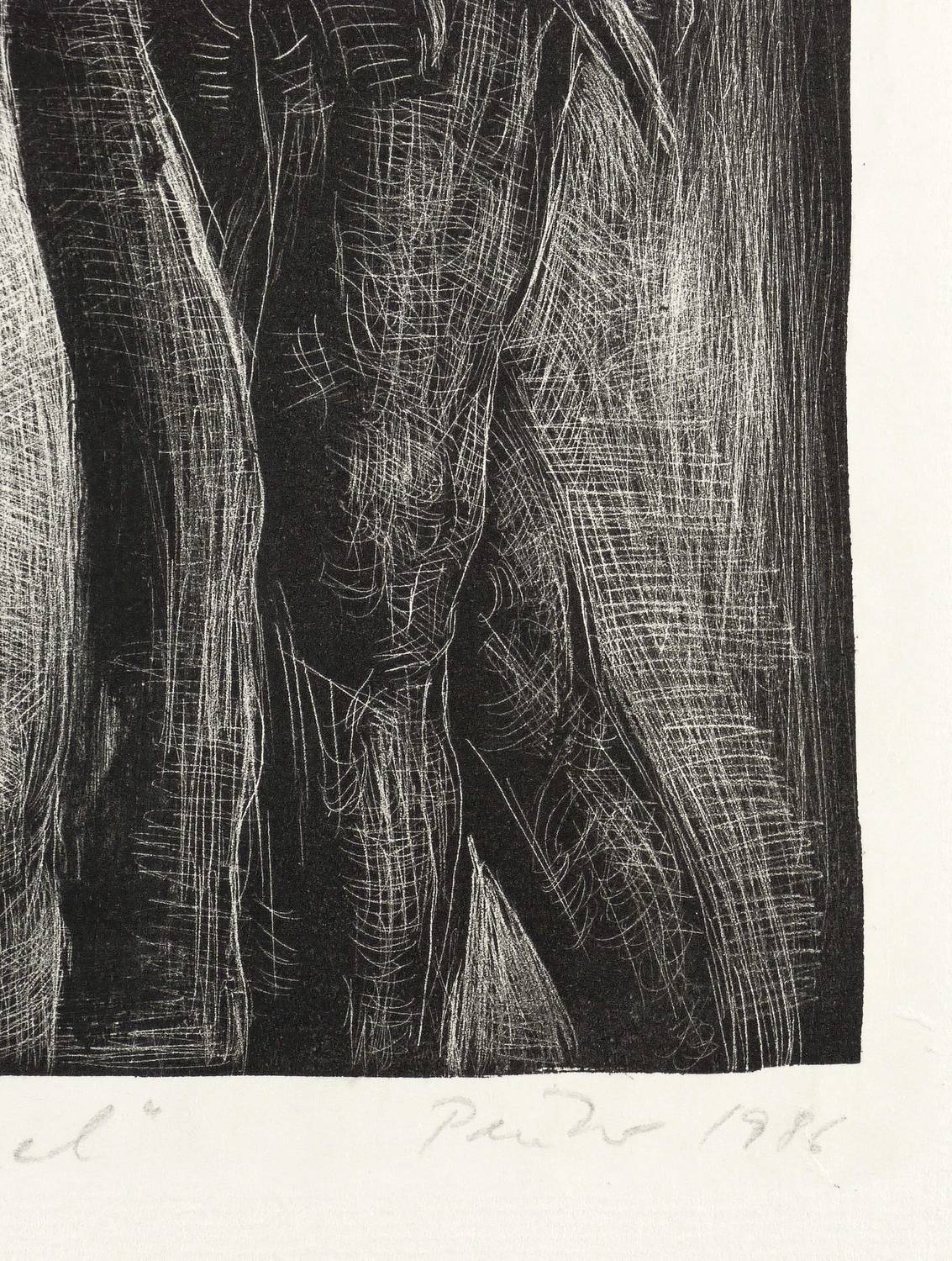 1986. Lithografie / Schablithografie, in Schwarz, auf hellchamois Maschinenbütten. – Originale Künstlergrafik, von Wolfgang Peuker. – Künstlerexemplar (e.a.). – 29,1 x 20,8 cm (Darstellung / Druckbild), 31,5 x 23 cm (Stein), 42 x 33 cm (Blatt).