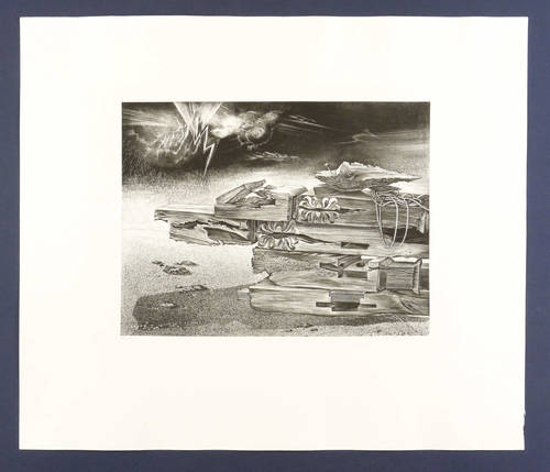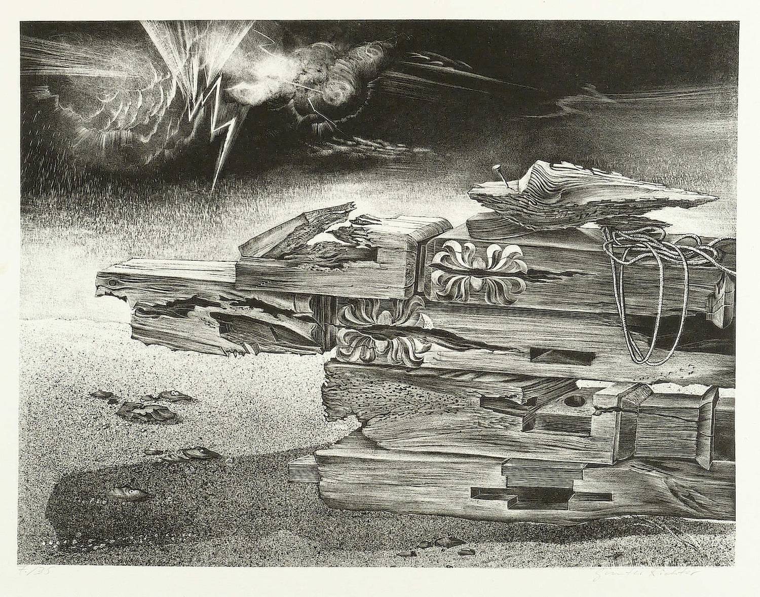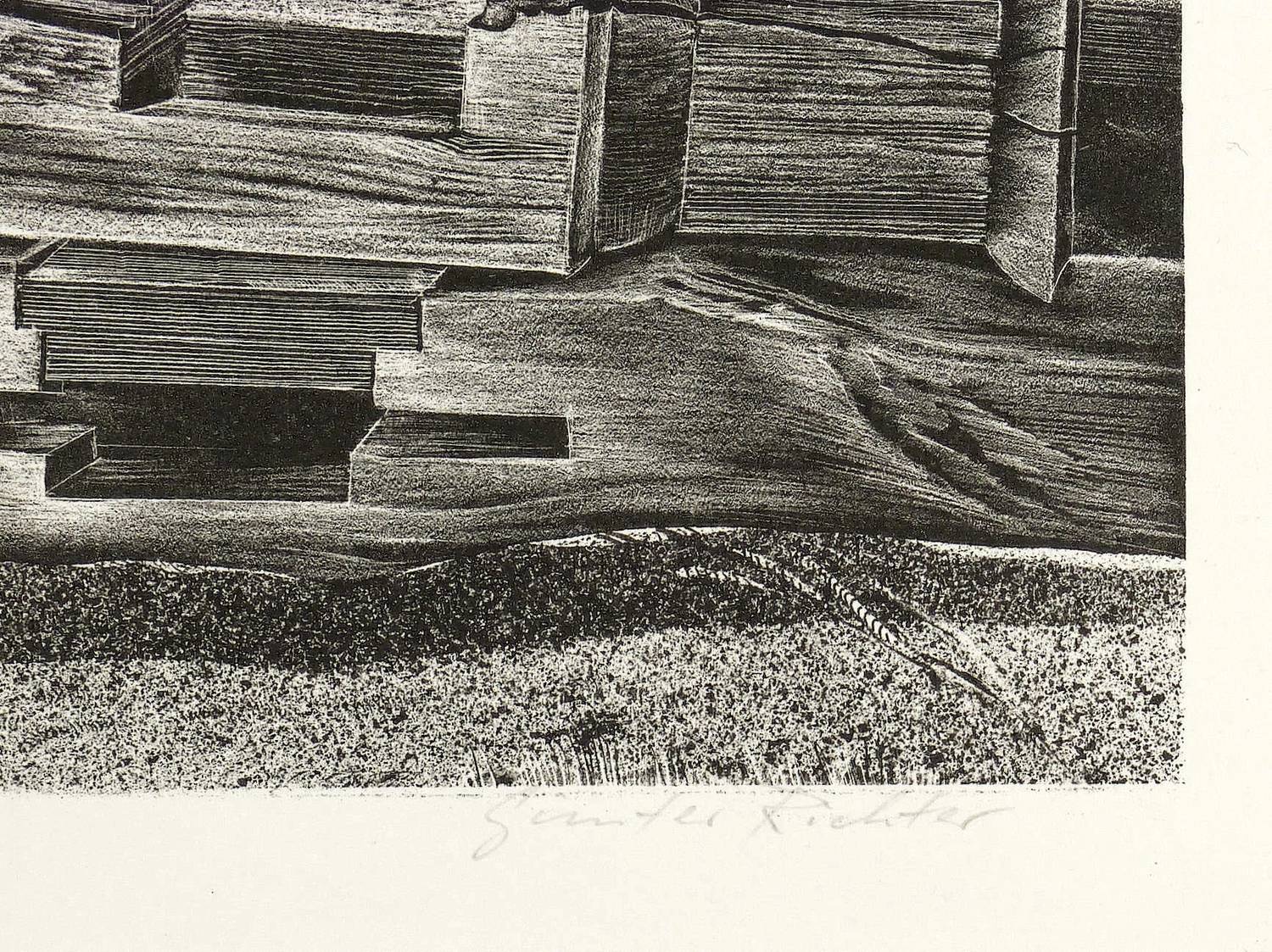 Um 1975. Lithografie / Schablithografie, in Schwarz, auf schwerem hellchamois Hahnemühle. – Originale Künstlergrafik, von Günter Richter. – Künstlerexemplar (e.a.). – 25,8 x 35,3 cm (Darstellung / Druckbild), 40 x 53 cm (Blatt).