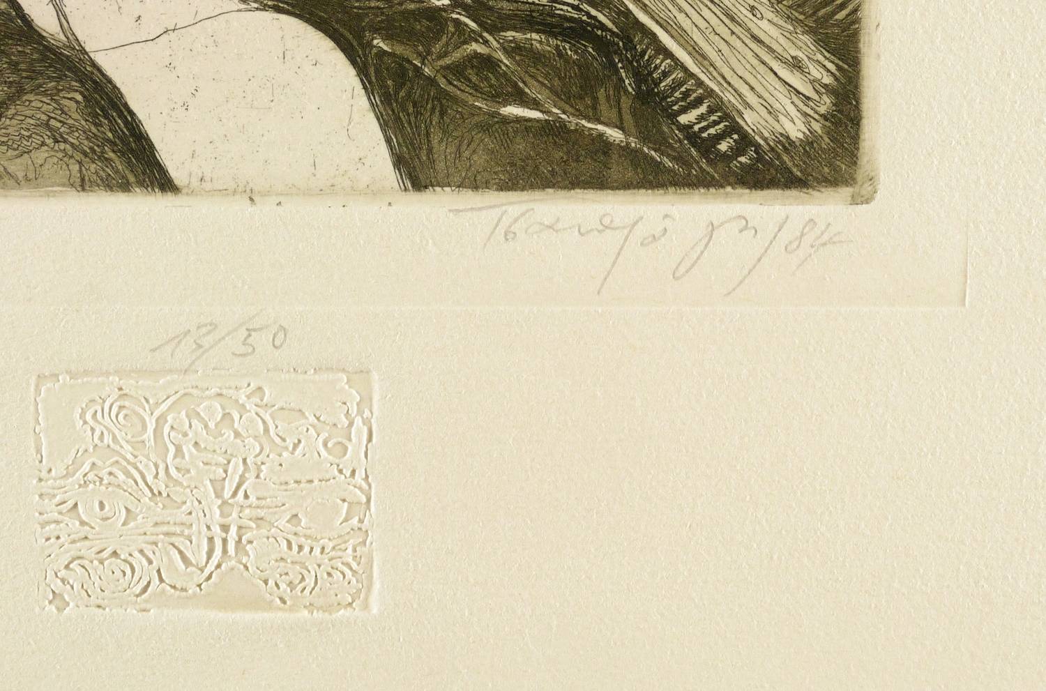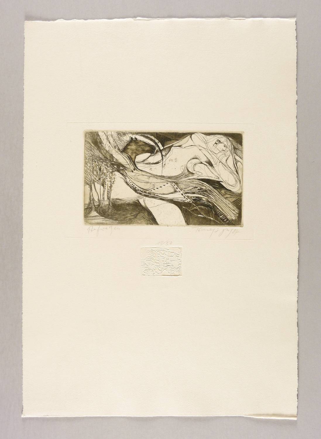 1984. Radierung / Strichätzung & Aquatinta, in Schwarz, auf chamois Velinkarton. – Originale Künstlergrafik, von Fotis Zaprasis. – Auflage Exemplar Nr. 13/50. – 11,5 x 19,5 cm (Darstellung / Platte), 49 x 34 cm (Blatt).