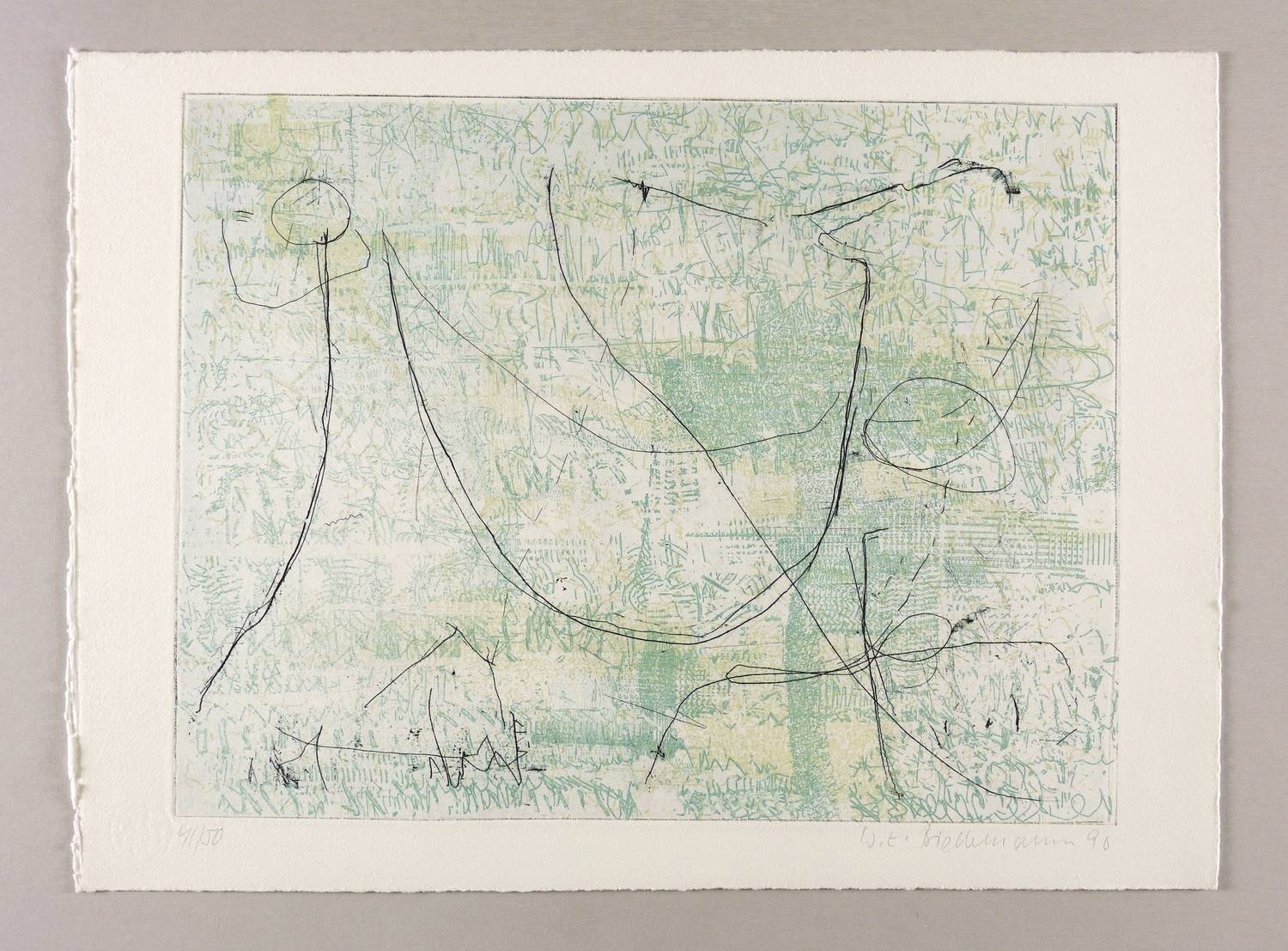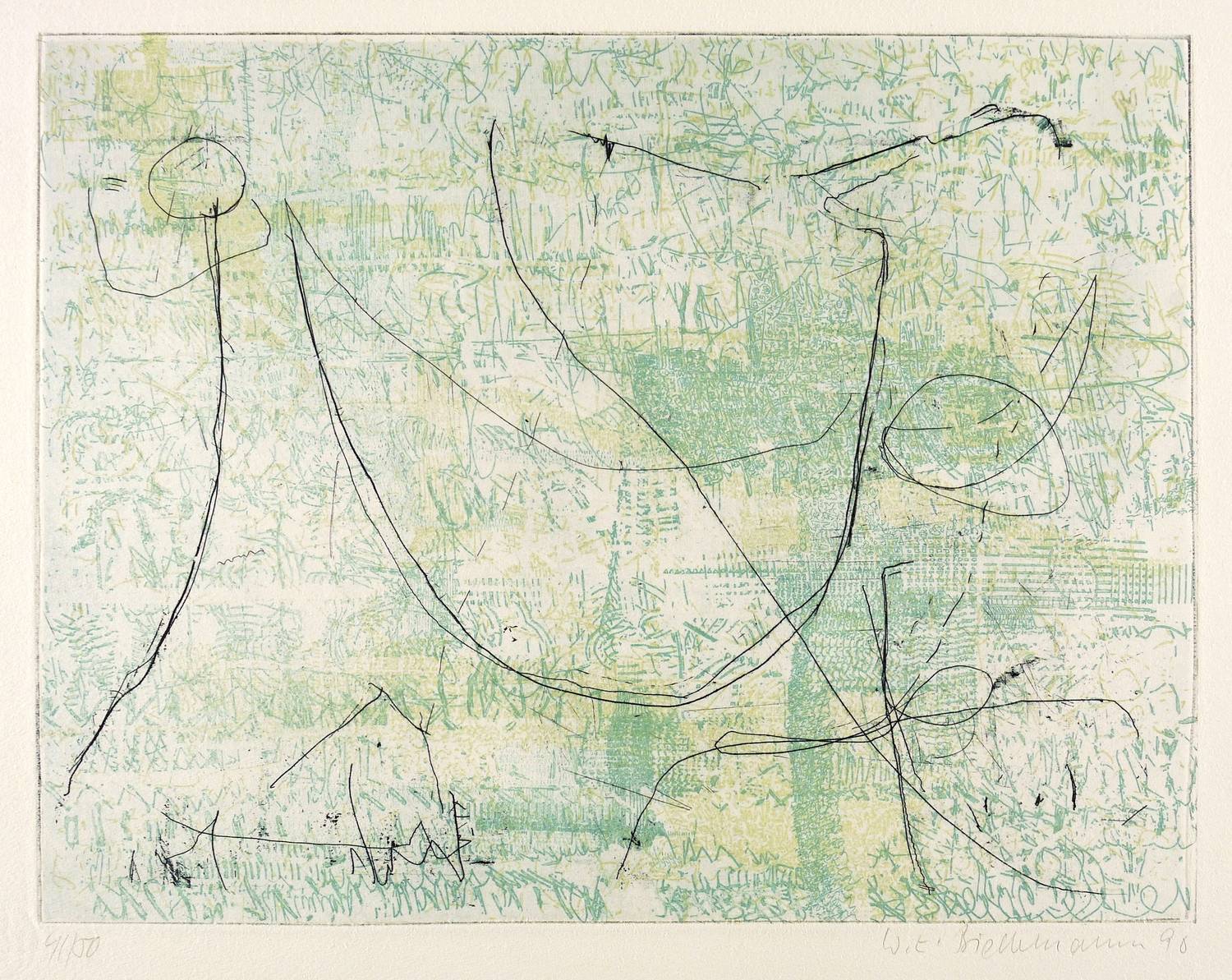 1990. Farbradierung / Strichätzung, in Lindgrün, Türkis & Schwarz, auf schwerem hellchamois Hahnemühle. – Originale Künstlergrafik, von Wolfgang E. Biedermann. – Auflage Exemplar Nr. 41/50. – 33,8 x 44,3 cm (Darstellung / Platte), 40 x 54 cm (Blatt).