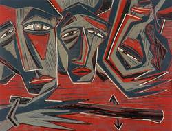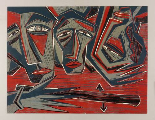 1989. Farbholzschnitt, in Grau, Petrol, Rotbraun & Schwarz, auf Velinkarton. – Originale Künstlergrafik, von Klaus Süß. – Auflage Exemplar Nr. VIII/X. – 49,2 x 64,0 cm (Darstellung / Blatt).