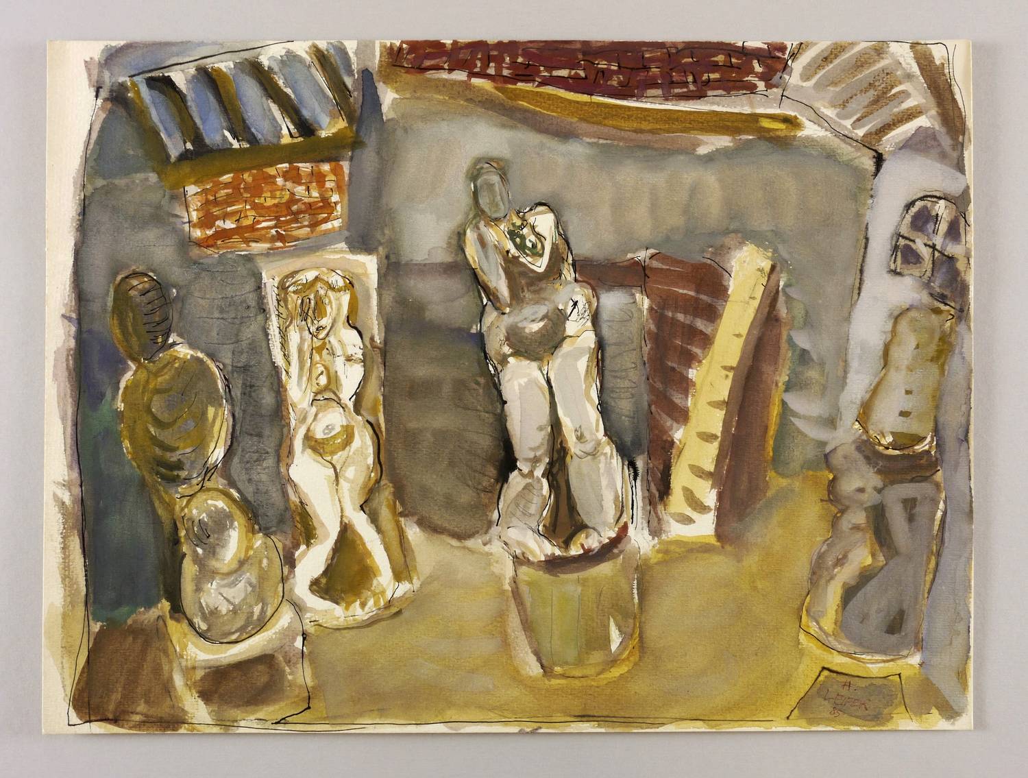 1985. Mischtechnik / Aquarell, Tusche & Gouache, auf hartem hellchamois Velin. – Originale Künstlergrafik, von Horst Leifer. – Unikat. – 36,0 x 47,9 cm (Darstellung / Blatt).
