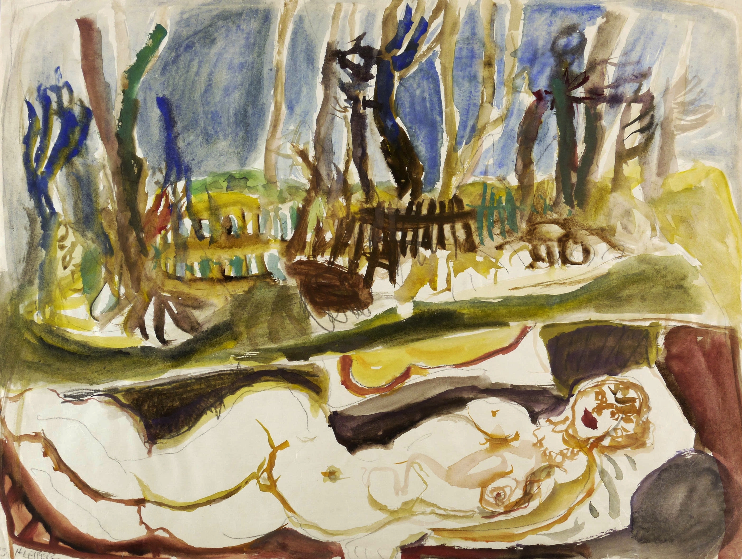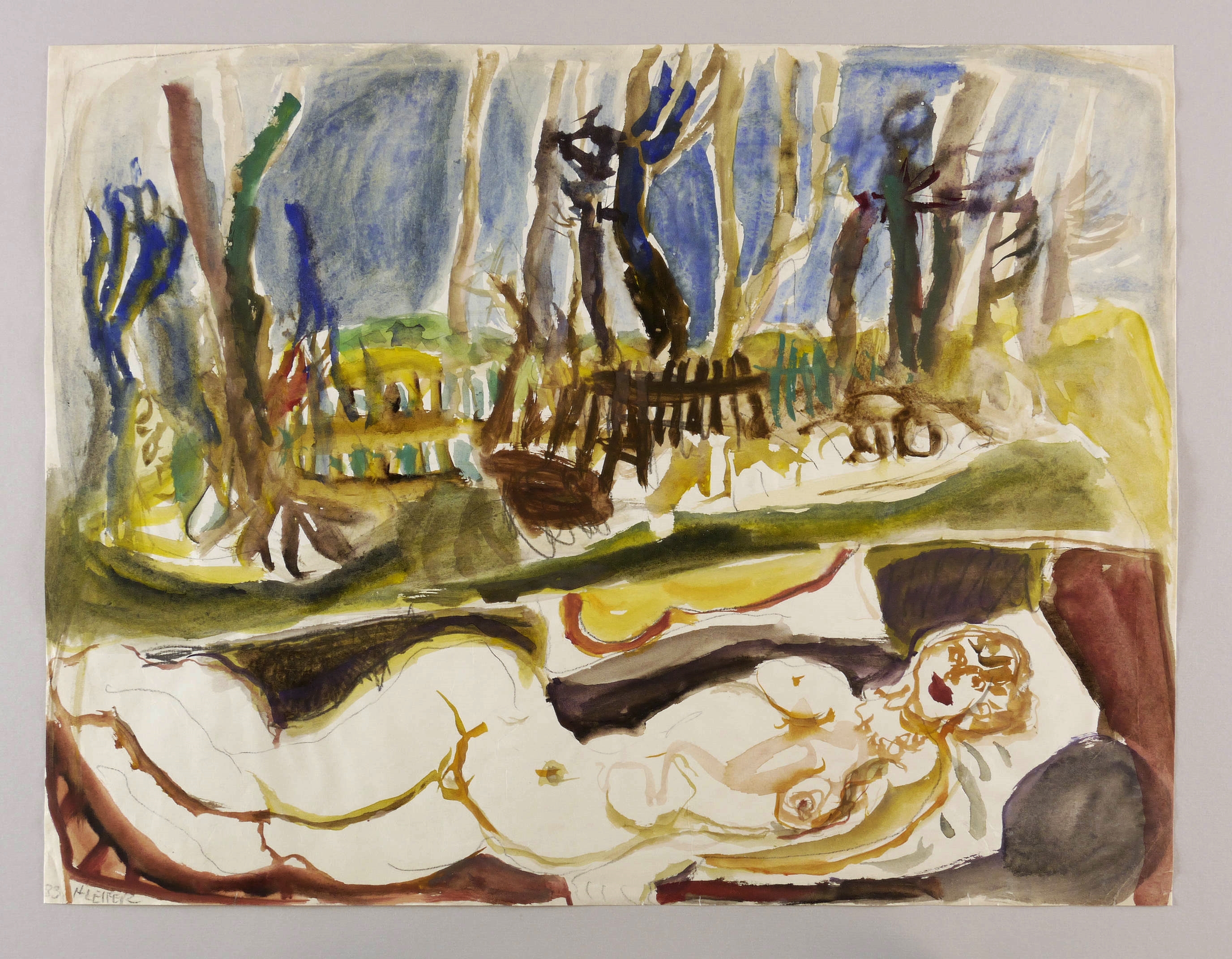 1983. Aquarell, auf leichtem hellgelbem Maschinenbütten. – Originale Künstlergrafik, von Horst Leifer. – Unikat. – 47,6 x 62,1 cm (Darstellung / Blatt).