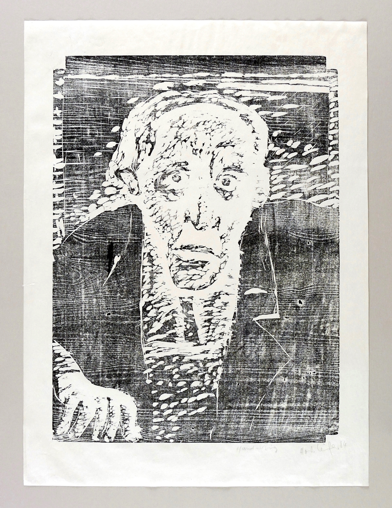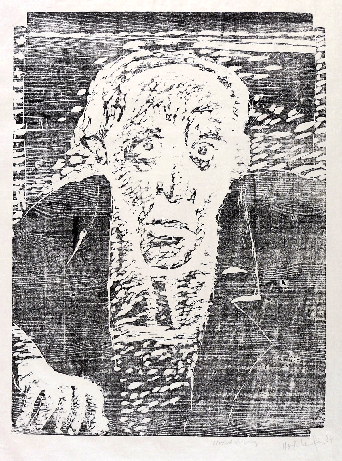 1984. Holzschnitt, in Schwarz, auf leichtem hellgelbem Maschinenbütten. – Originale Künstlergrafik, von Horst Leifer. – 52,4 x 38,7 cm (Darstellung / Druckstock), 63 x 47 cm (Blatt).
