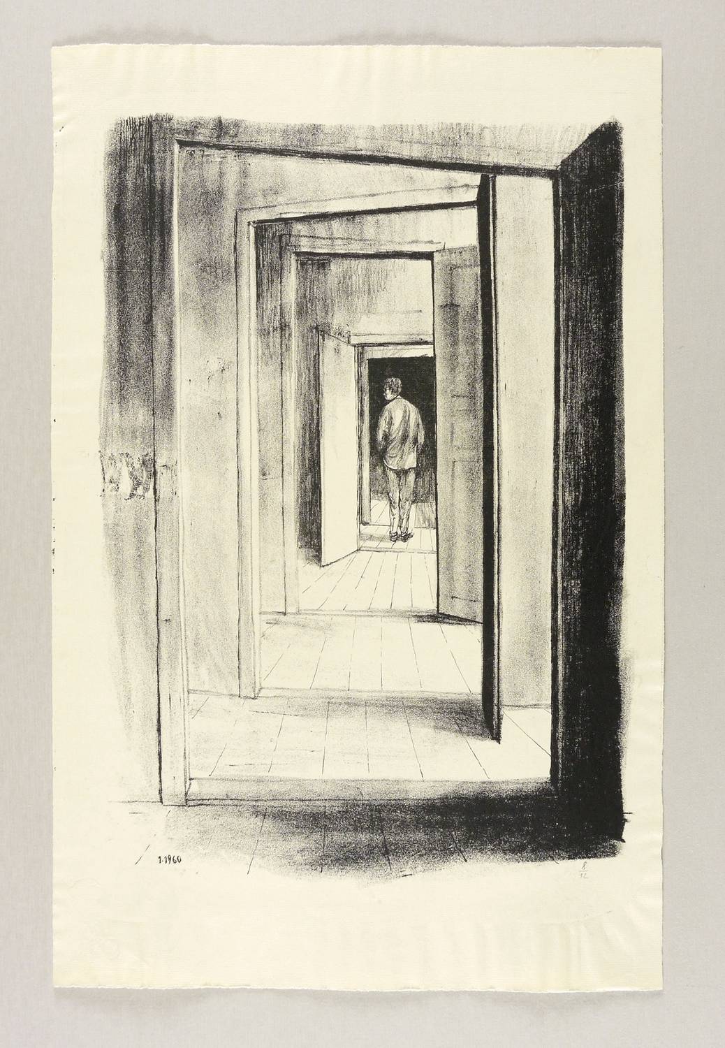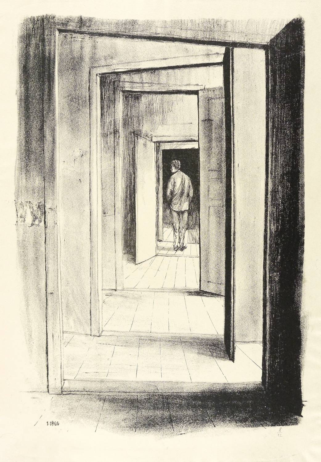 Nicht handsigniert. Rechts unten in Bleistift Auflagenbezeichnung: ″8/12″. Im Stein rechts unten datiert: ″1.1960″. Verso von fremder Hand bezeichnet: ″hans escher″. Wasserzeichen der Hahnemühle. – Provenienz: Sammlung Erhard Frommhold, Dresden. Frommhold war Cheflektor und Verlagsleiter des Verlag der Kunst in Dresden. – Tadelos erhalten. Sehr guter Zustand.