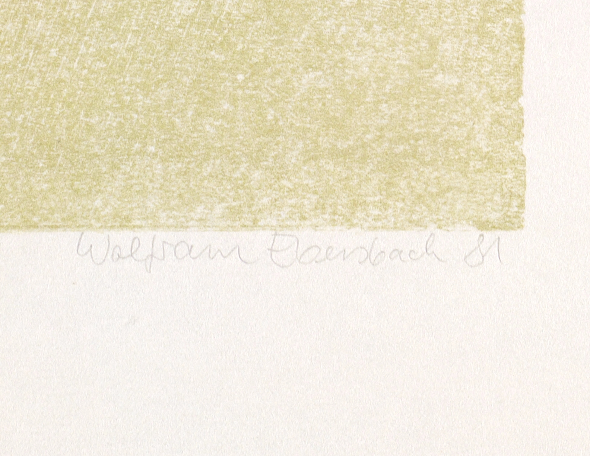 1981. Farbholzschnitt, in 4 Farben, auf leichtem hellchamois Maschinenpapier. – Originale Künstlergrafik, von Wolfram Ebersbach. – Auflage Exemplar Nr. 36/200. – 17,8 x 24,0 cm (Darstellung / Druckstock), 36 x 35 cm (Blatt).