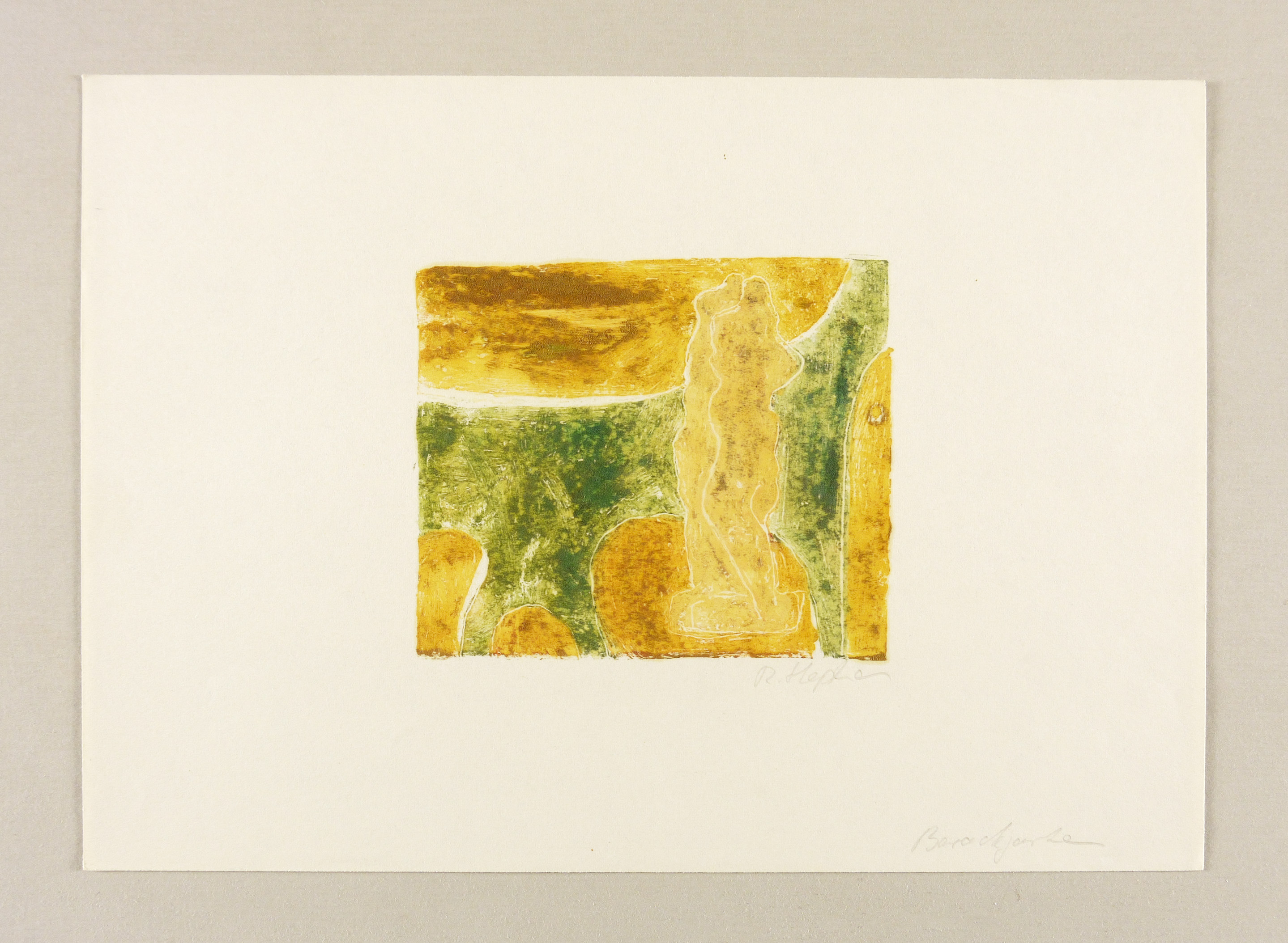 Um 1980. Farbmonotypie, in 5 Farben, auf hellchamois Velin. – Originale Künstlergrafik, von Rosemarie Stephan (Julia). – Unikat. – 22 x 30 cm (Blatt), 10,6 x 12,5 cm (Darstellung / Druckbild).