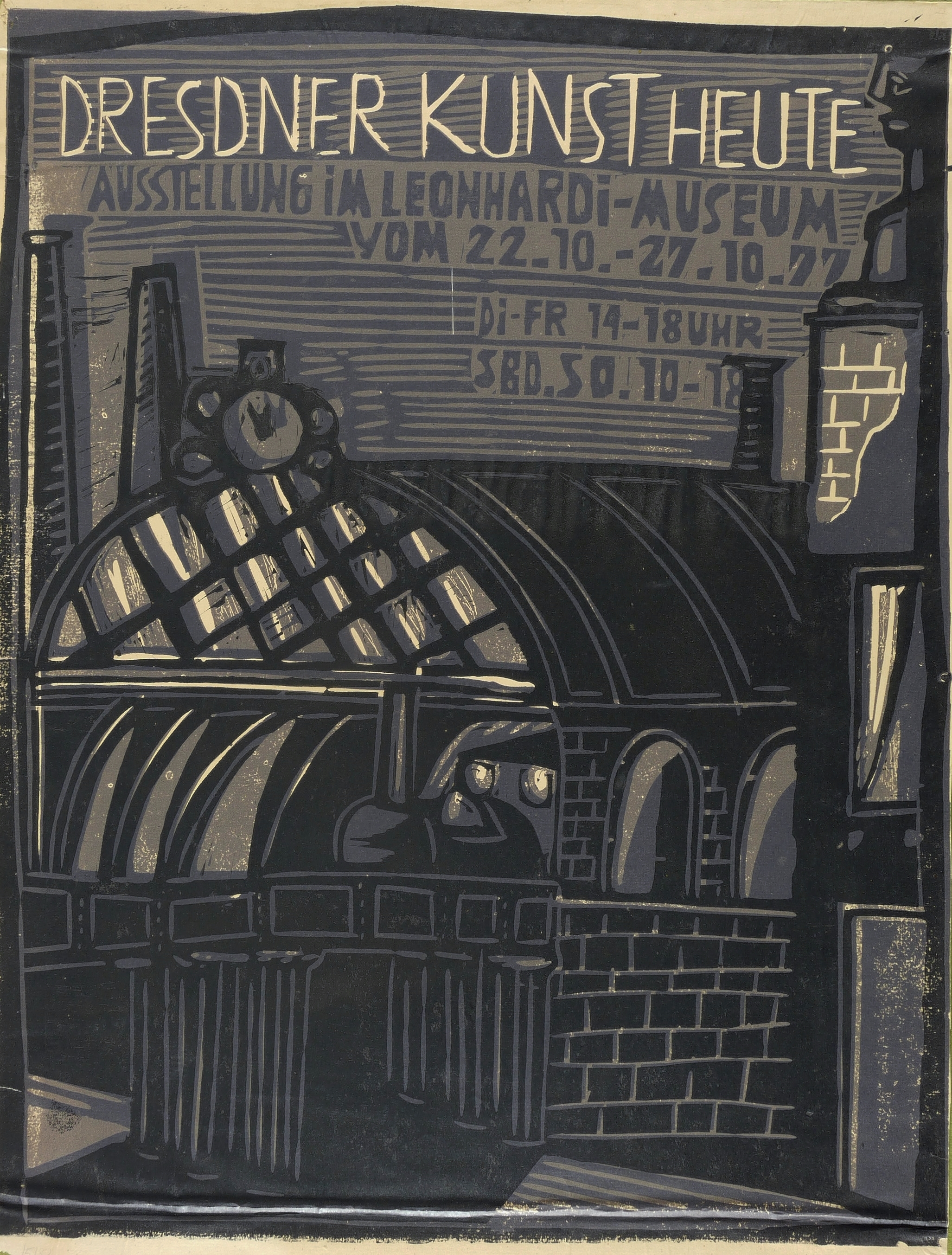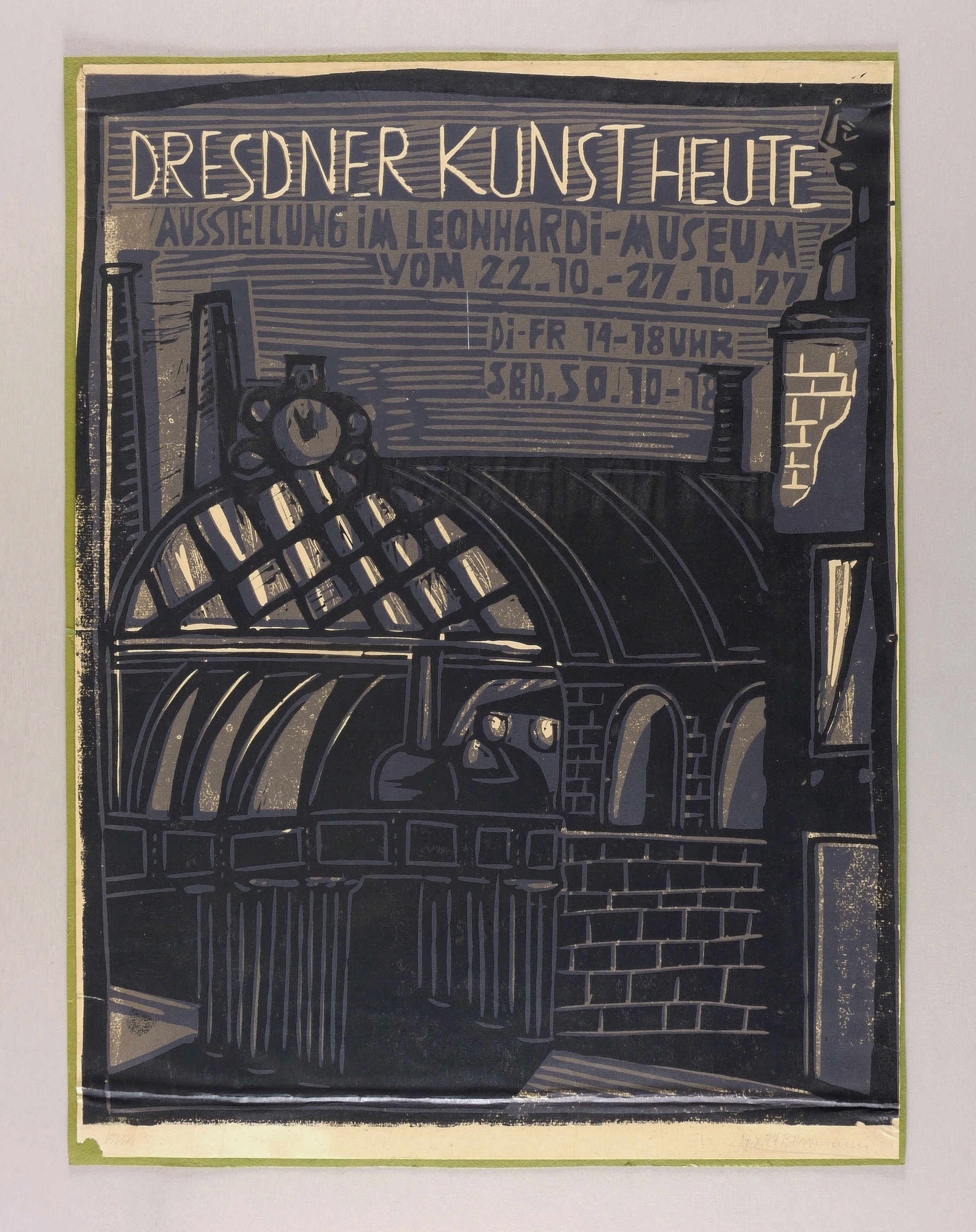 Rechts unten in Bleistift signiert und datiert: ″14.X.77 P. Herrmann″. Links Auflagenbezeichnung: ″15/32″. – Originalgrafisches Künstlerplakat zur Ausstellung ″Dresdner Kunst heute″ im Leonhardimuseum in Dresden 22.10.-27.10.1977. – Provenienz: Sammlung Gerlint und Gert Söder, Dresden. – Alt auf farbigem Trägerkarton aufgezogen. Blattecke links unten mit leichtem Materialverlust. Insgesamt noch guter Zustand.