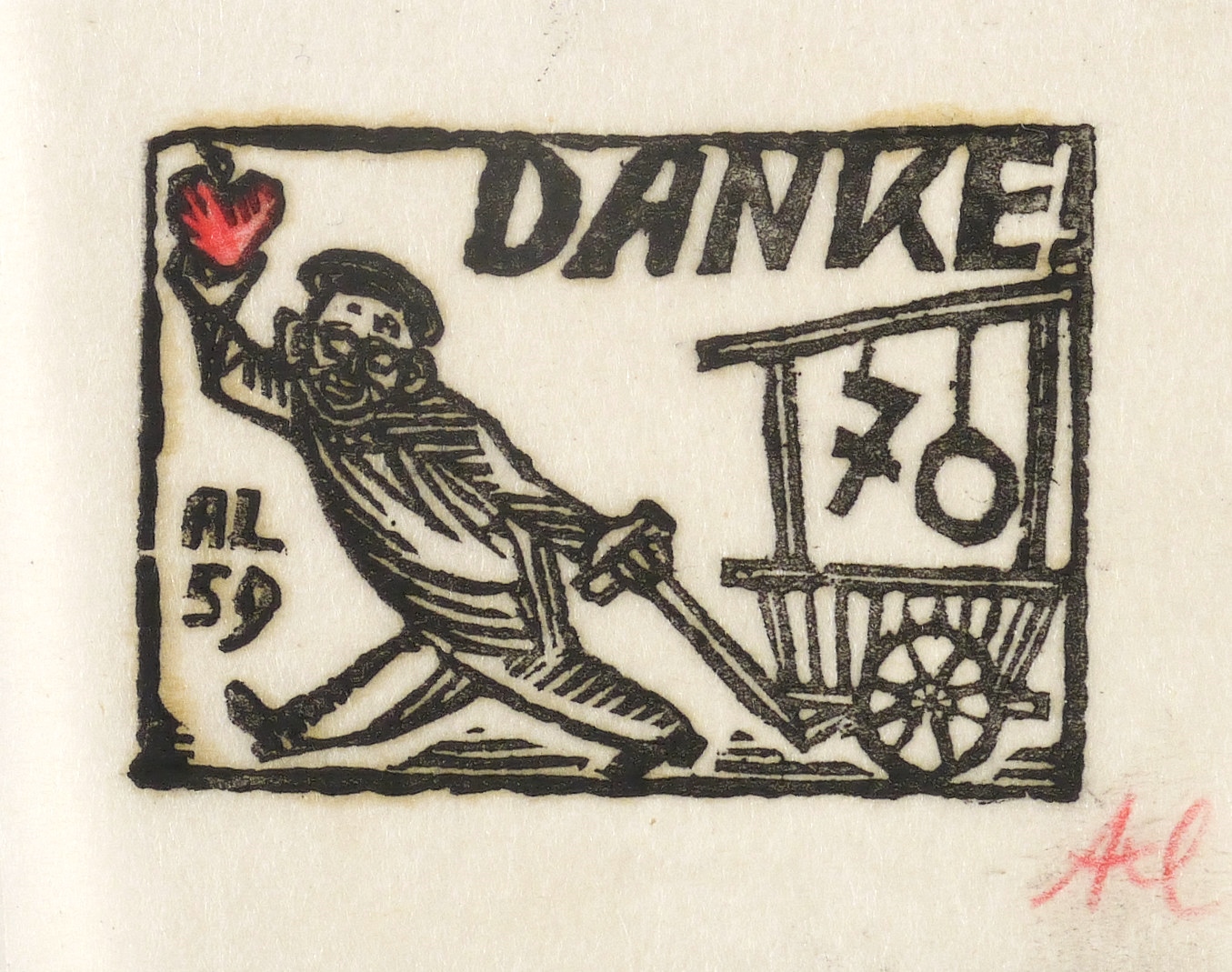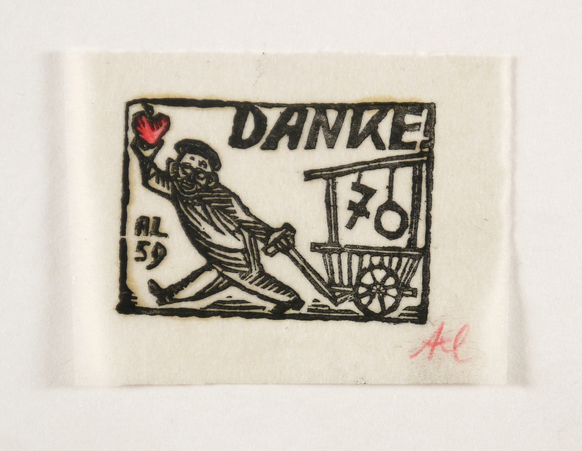 Rechts unten in rotem Kreidestift signiert: ″Axl″. Im Druckstock links unten Monogramm und Jahr: ″AL 59″. – Sehr guter Zustand.