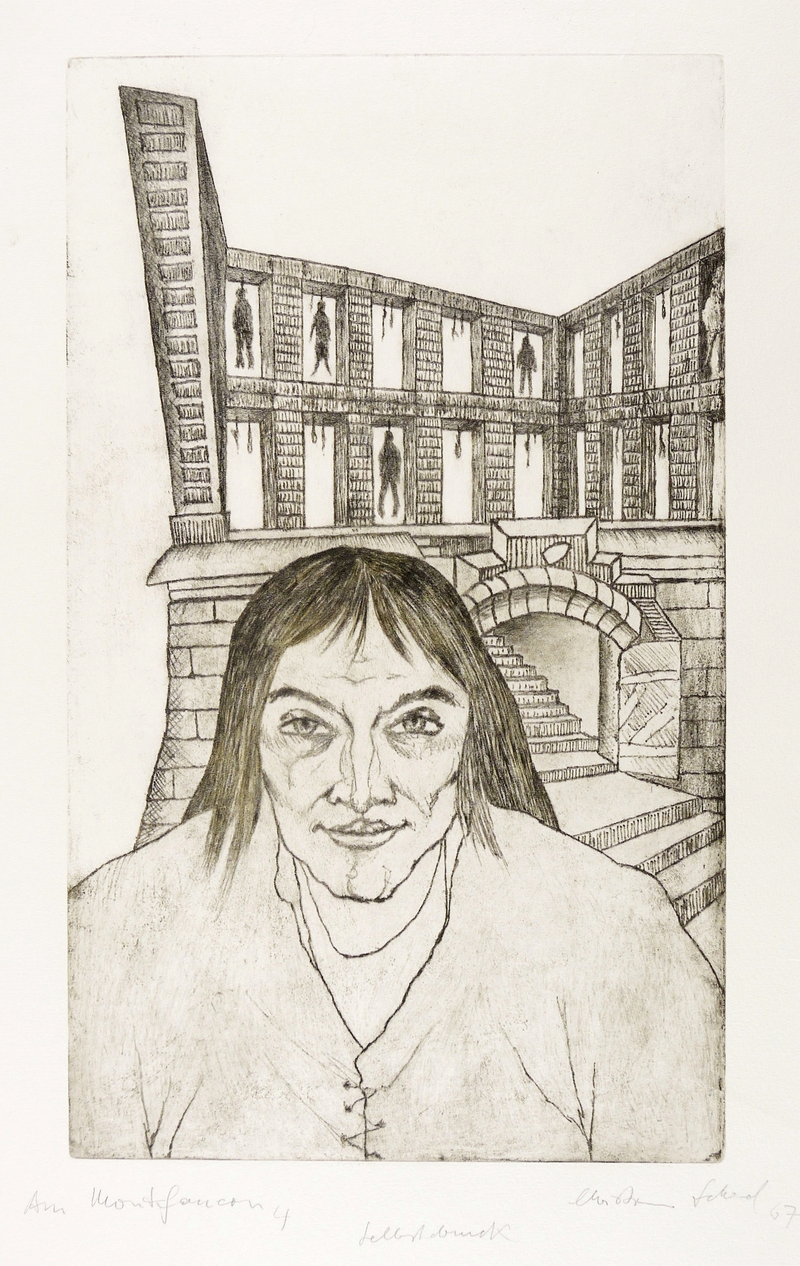 Richter 62. – Rechts unten in Bleistift signiert und datiert: ″Christian Schad 67″. Links Titel: ″Am Montfaucon 4″. Mittig bezeichnet: ″Selbstdruck″. – Im rechten Blattrand zwei originale Quetschfalten aus dem Druckprozess. Sehr guter Zustand.