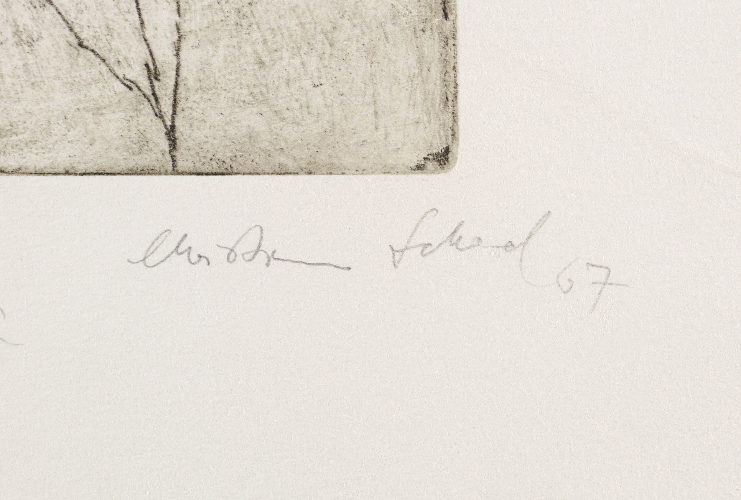 1967. Radierung / Vernis mou, in Schwarz, auf schwerem hellchamois BFK-Rives. – Originale Künstlergrafik, von Christian Schad. – 43,8 x 26,1 cm (Darstellung / Druckbild), 59 x 39 cm (Blatt).