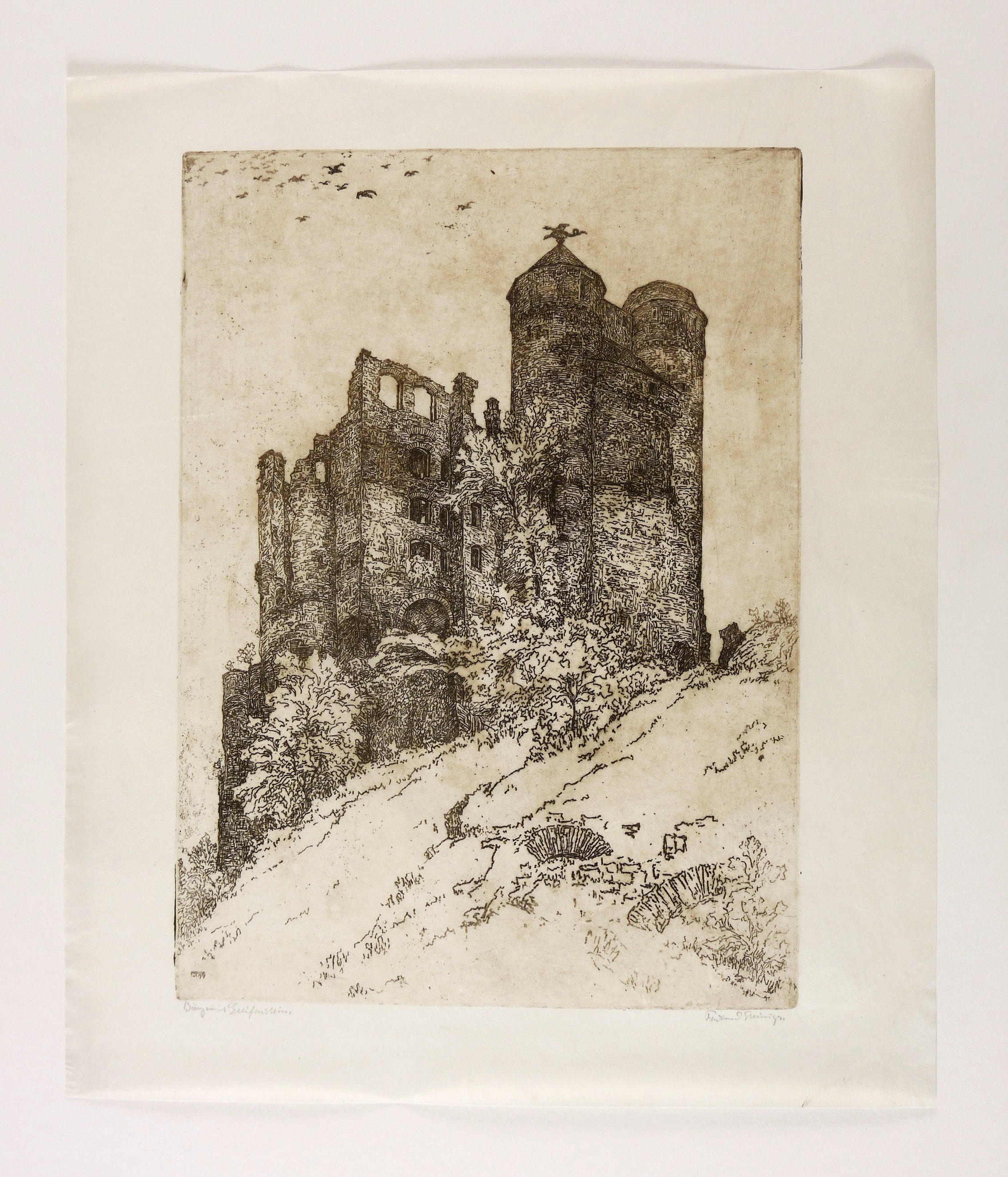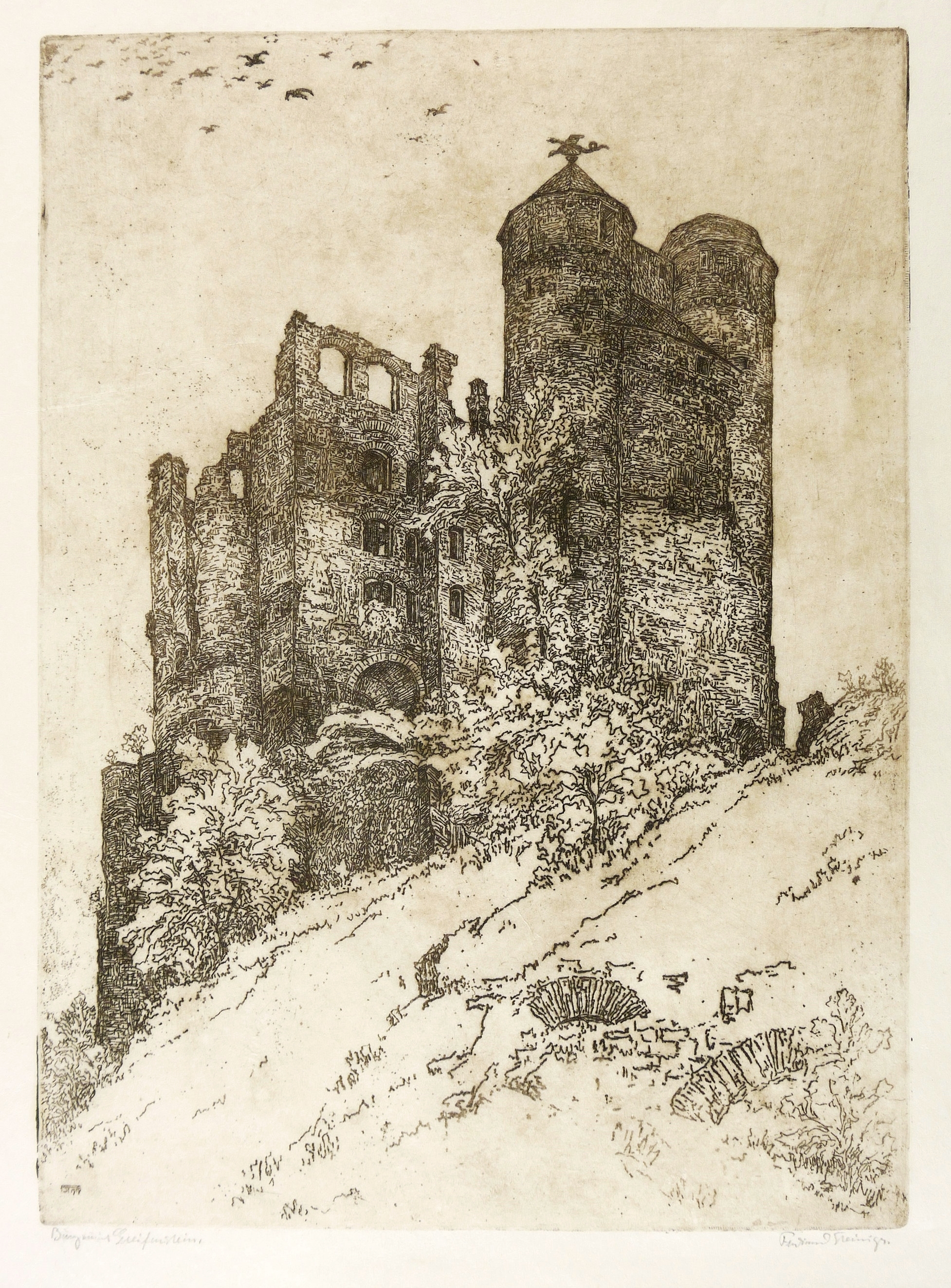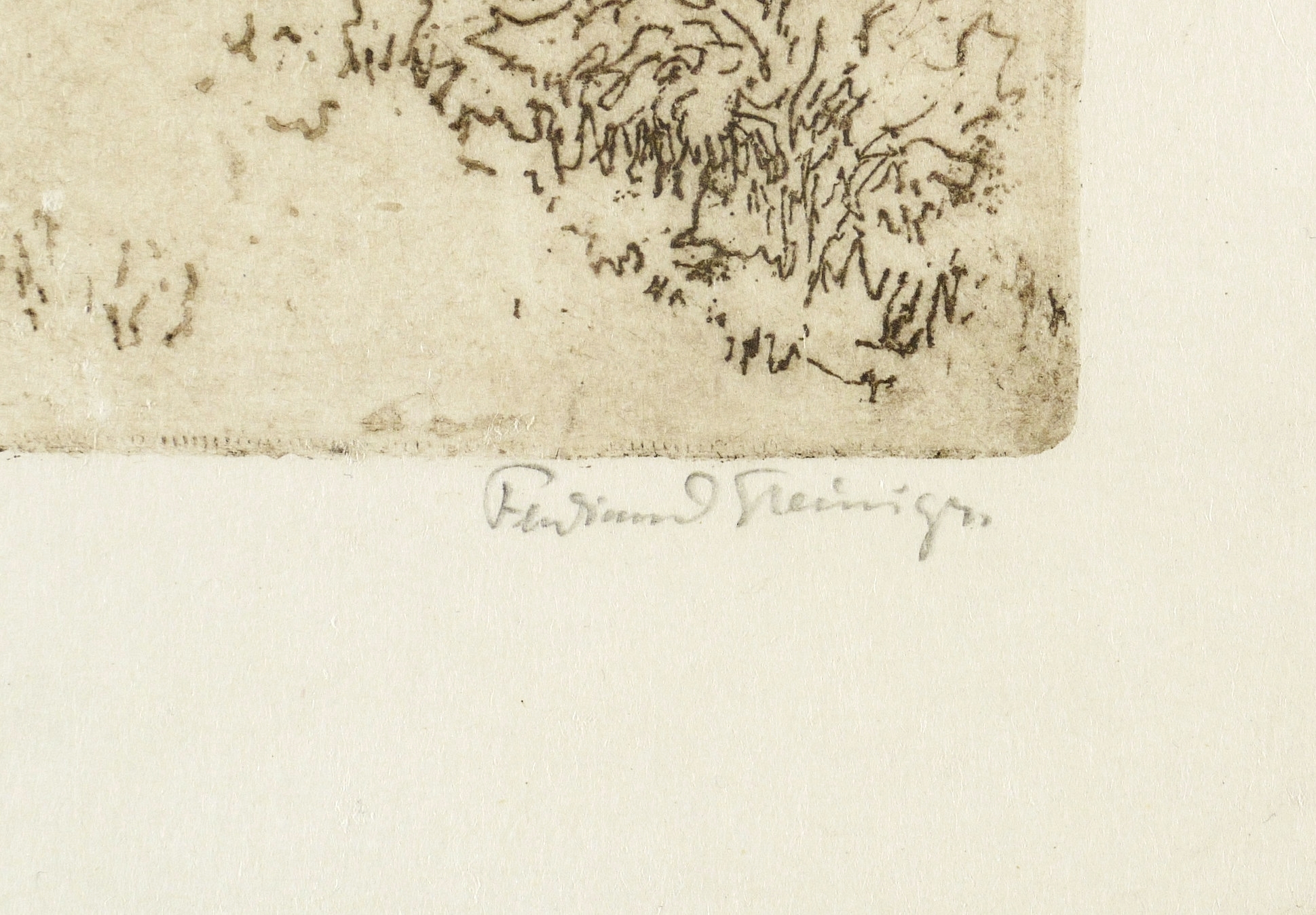 Rechts unten in Bleistift signiert: ″Ferdinand Steiniger.″ Links Titel: ″Burgruine Greifenstein″. In der Platte links unten Monogramm und Jahr: ″FSt 1917″. – Sehr guter Zustand.