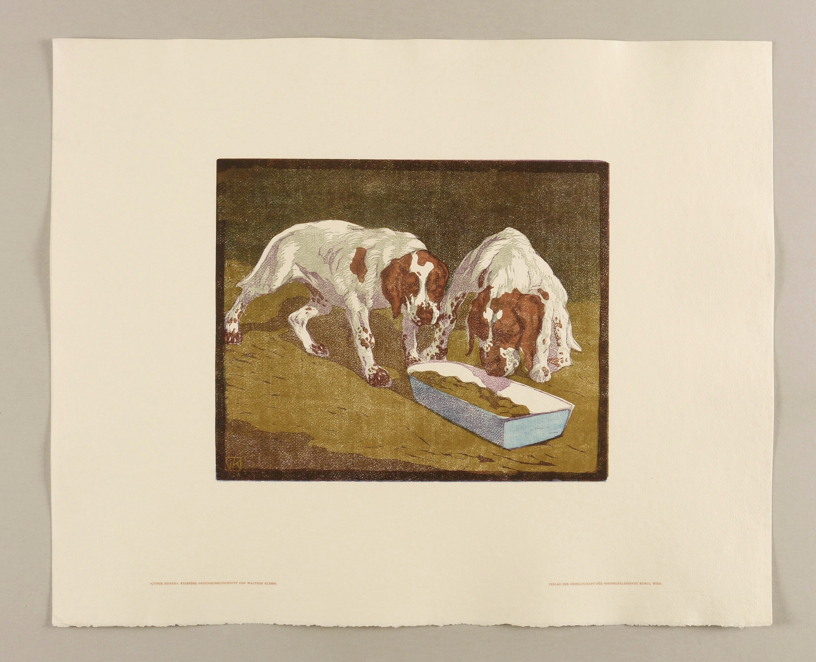 Aus: Jahresmappe der Gesellschaft für Vervielfältigende Kunst in Wien (Wien: Gesellschaft für Vervielfältigende Kunst 1908). – Nicht handsigniert. Im Blattrand links typografisch bezeichnet: ″JUNGE HUNDE. FARBIGER ORIGINALHOLZSCHNITT VON WALTHER KLEMM″. Rechts Verlagsadresse der Gesellschaft für vervielfältigende Kunst Wien. – Tadellos erhalten. Sehr guter Zustand.