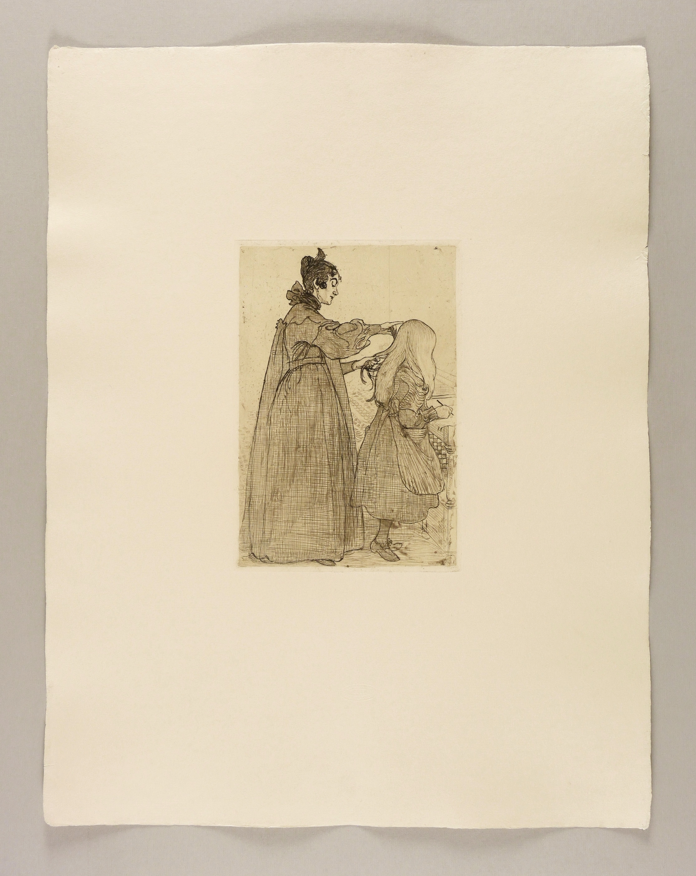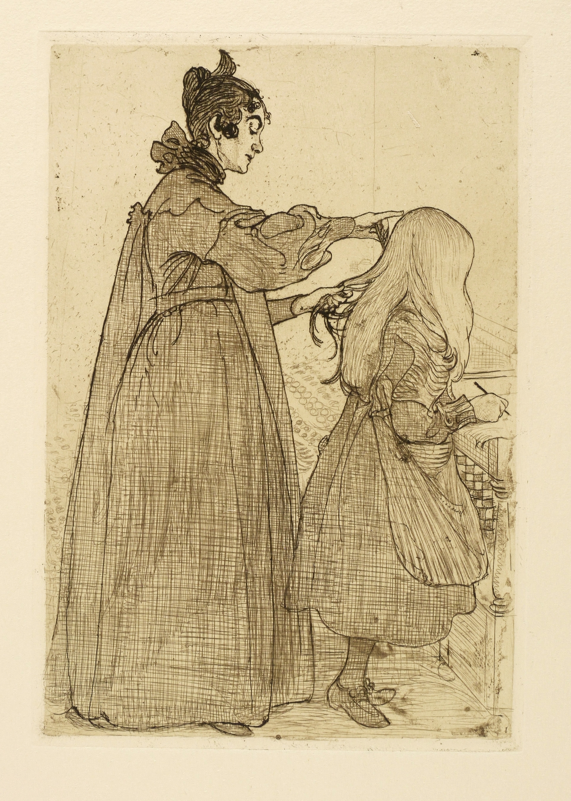 Hjert 47 II. – Nicht handsigniert. Ohne die in den unteren Rand der Platte gestochene Schrift des Auflagendrucks. Im unteren Blattrand Trockenstempel der Gesellschaft für vervielfältigende Kunst Wien (Lugt 1153). – Die Frau des Künstlers, beim Kämmen der Haare ihrer zeichnenden Tochter. – Nicht aus der 1905 gedruckten Auflage für ″Die Graphischen Künste″ der Gesellschaft für vervielfältigende Kunst in Wien (Jahrgang XXVIII). Laut Kunsthalle Bremen stattdessen Vorzugsdruck aus der ″Jahresmappe der Gesellschaft für vervielfältigende Kunst″, Gründer-Ausgabe, Wien 1906. – Originalrandiges unbeschnittenes Exemplar. Exzellent erhalten. Sehr guter Zustand.