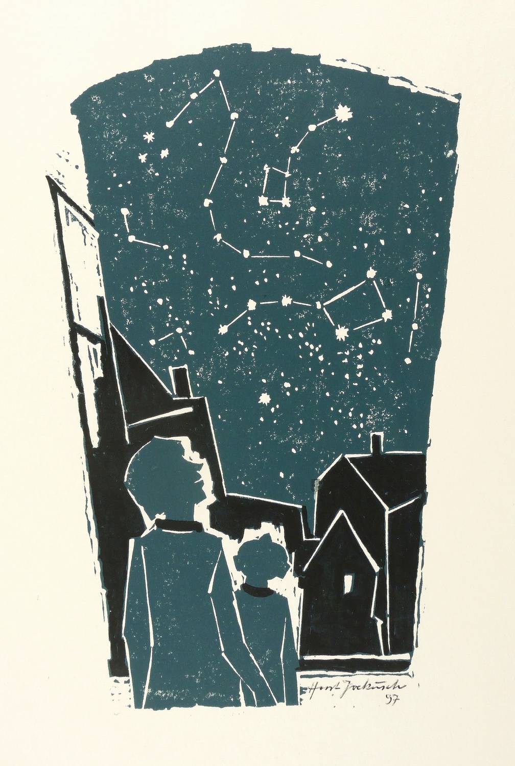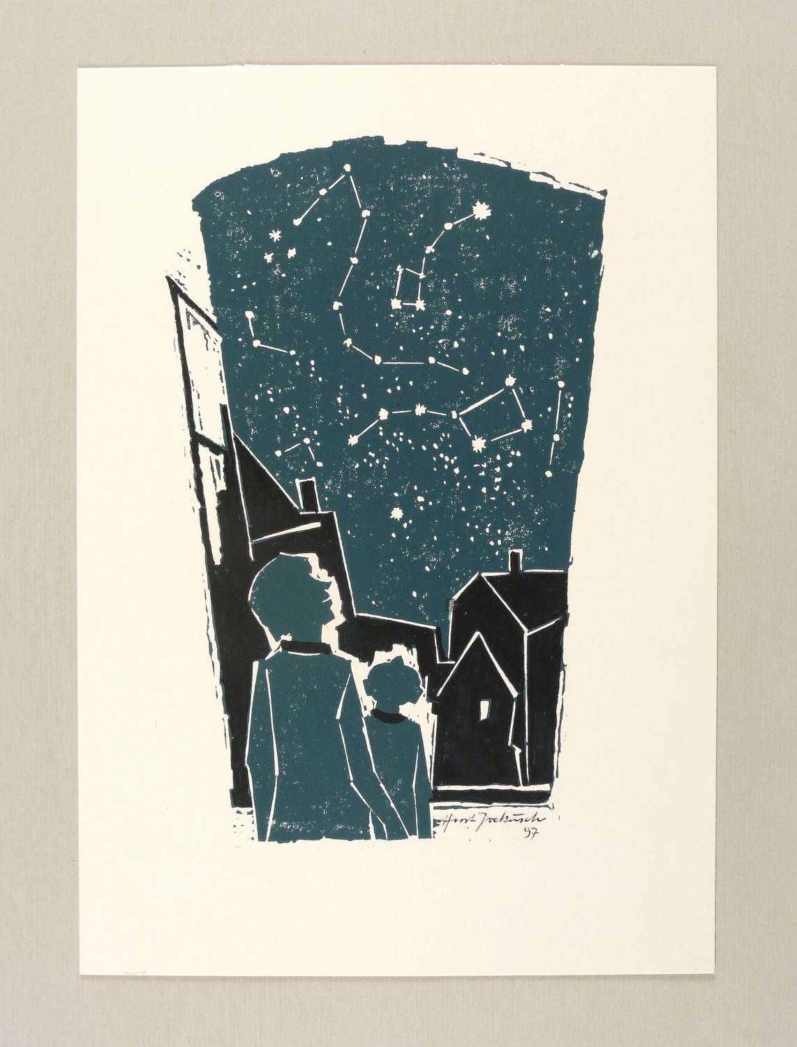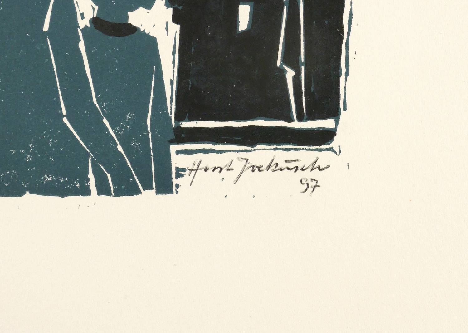 1997. Farbholzschnitt, in Dunkelblau & Schwarz, auf festem weißem Velin. – Originale Künstlergrafik, von Horst Jockusch. – 23,8 x 15,0 cm (Darstellung / Druckbild), 31 x 22 cm (Blatt).