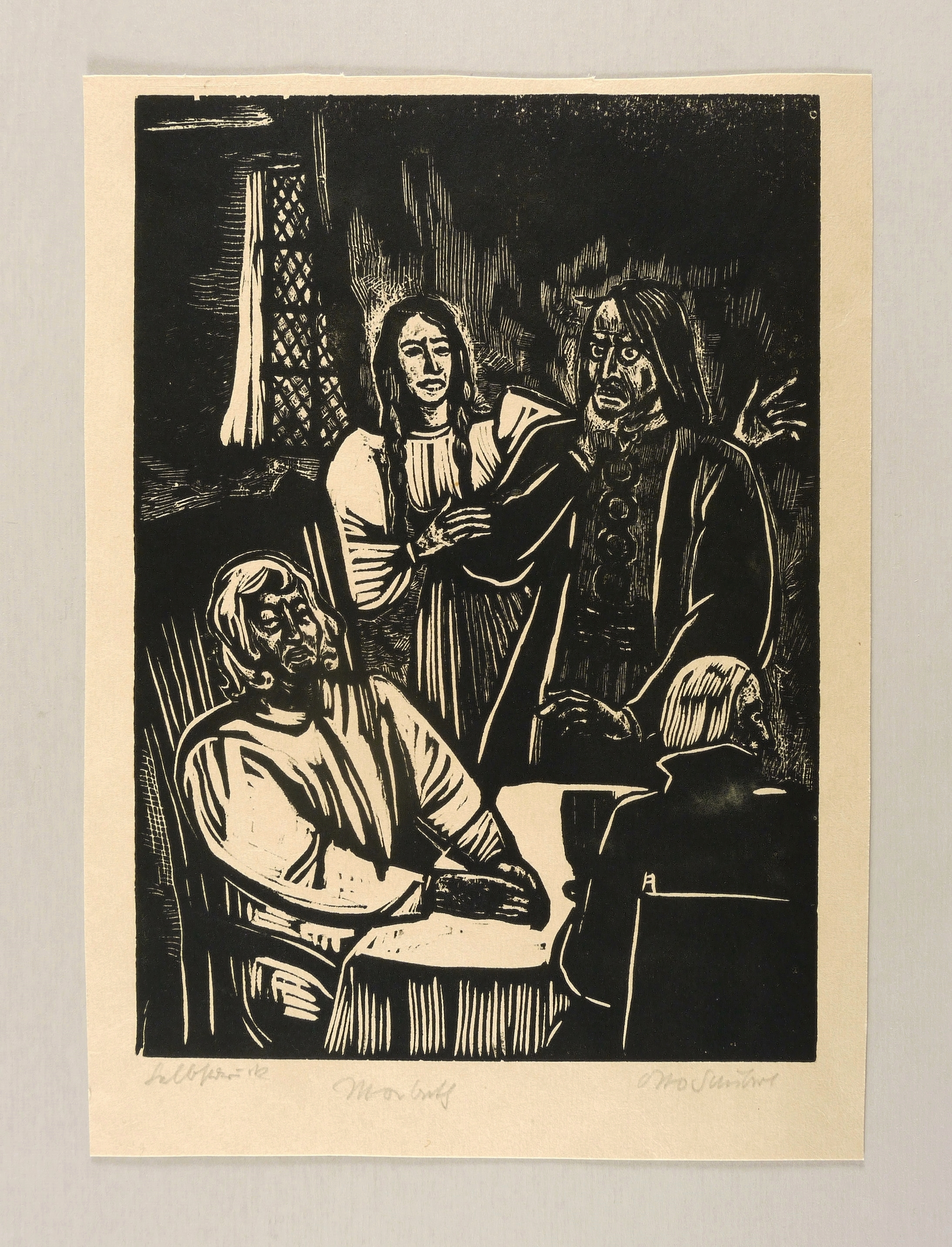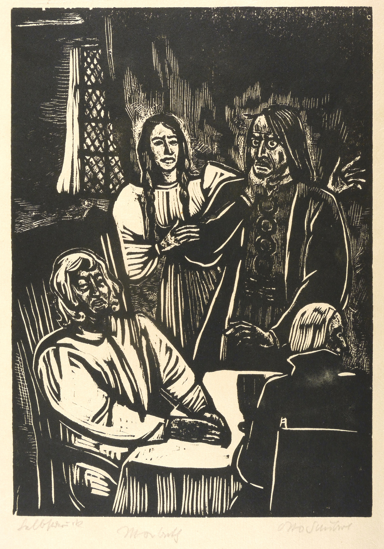 Rechts unten in Bleistift signiert: ″Otto Schubert″. Links bezeichnet: ″Selbstdruck″. Mittig Titel: ″Macbeth″. – Entstanden für die Grafik-Mappe ″Shakespeare-Gedenken″ von Otto Schubert. – Sehr guter Zustand.