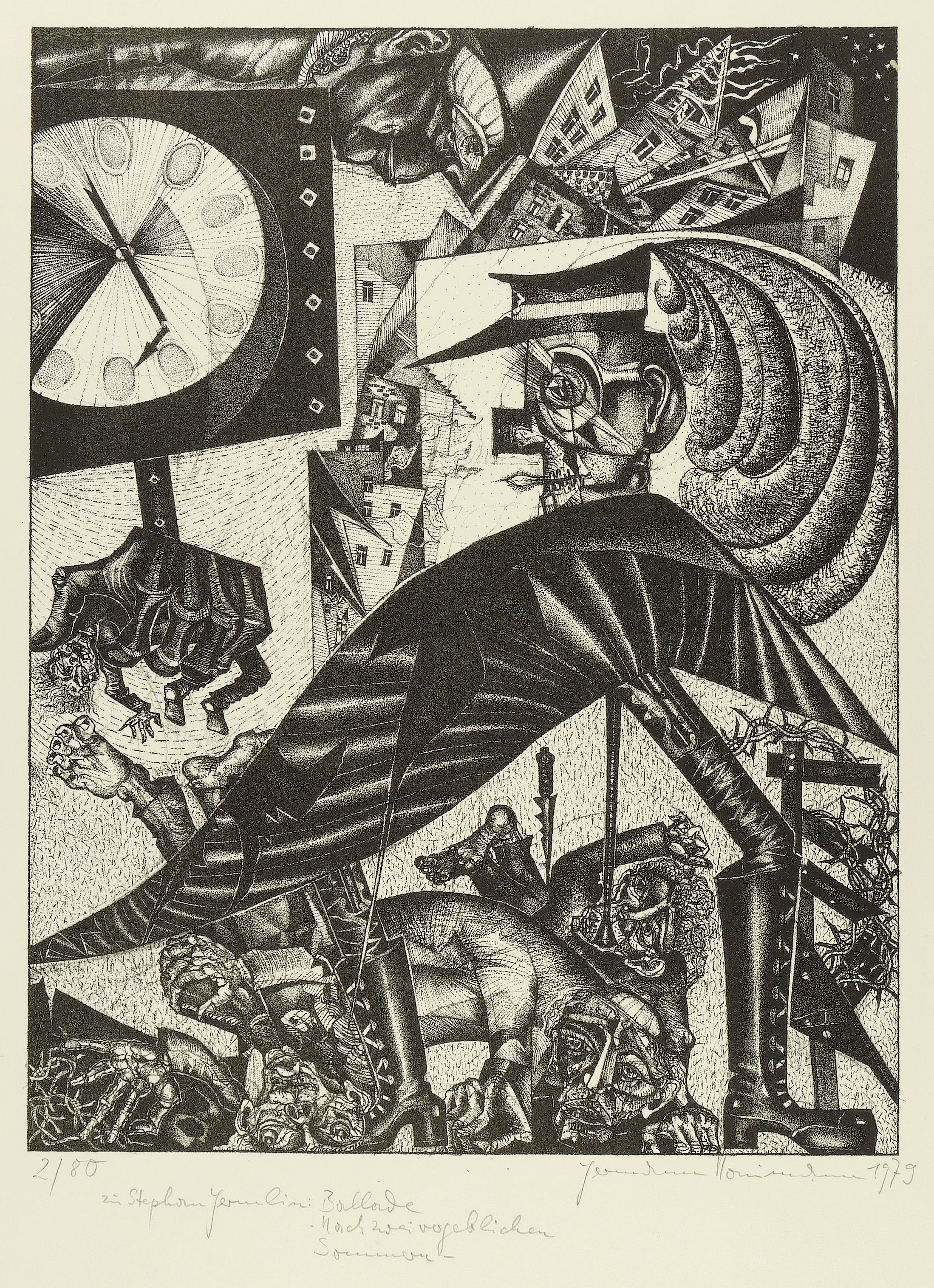 Außerhalb der Darstellung in Bleistift rechts unten signiert und datiert, links unten mit eigenhändiger Auflagenbezeichnung versehen und mittig betitelt. Am Blattrand unten mittig Trockenstempel ″HANDPRESSEN- DRUCK - SCHREITER-PRESSE DRESDEN″. – Papier leicht gegilbt. Blattrand rechts mit Quetschfalte. Sonst frisch erhalten.