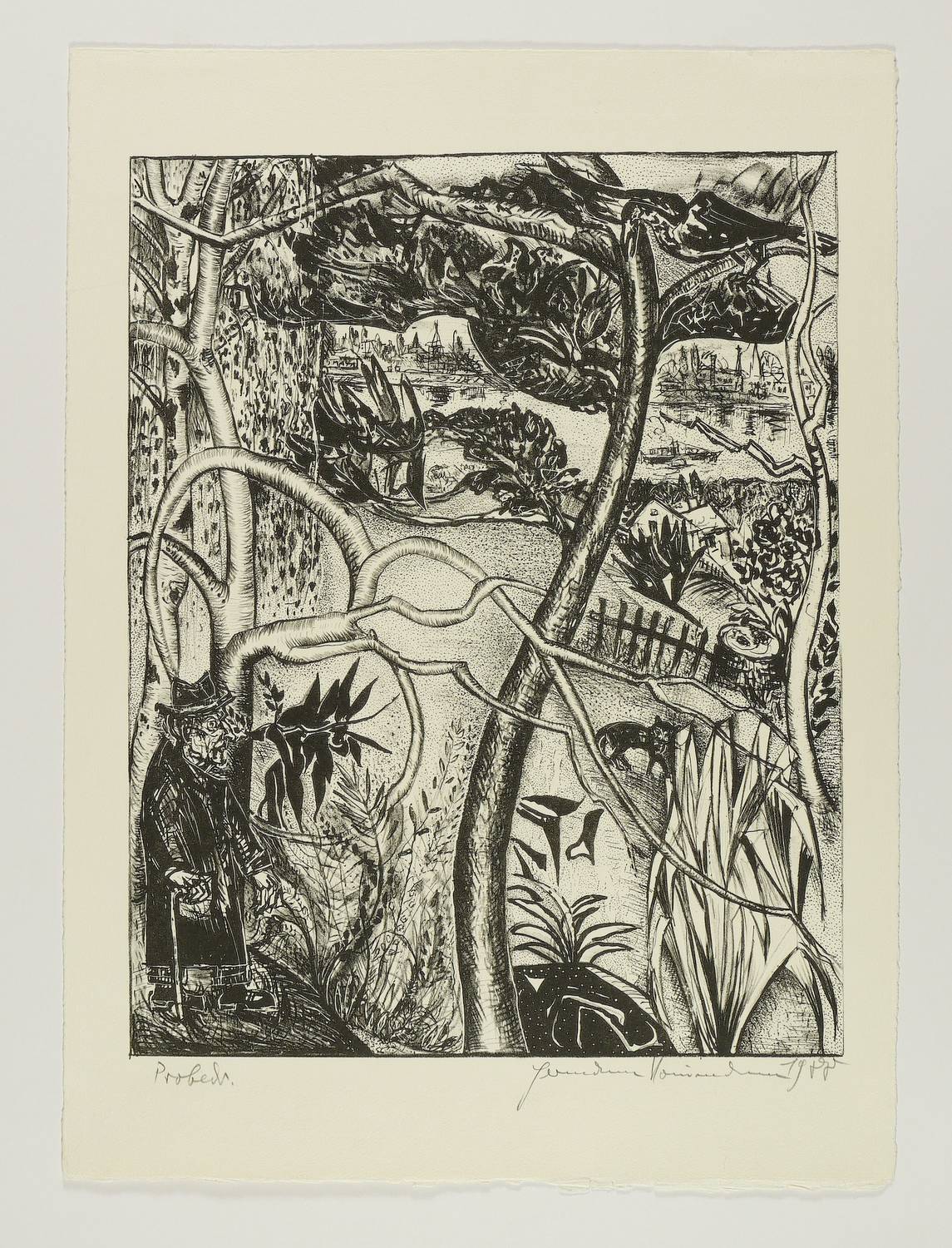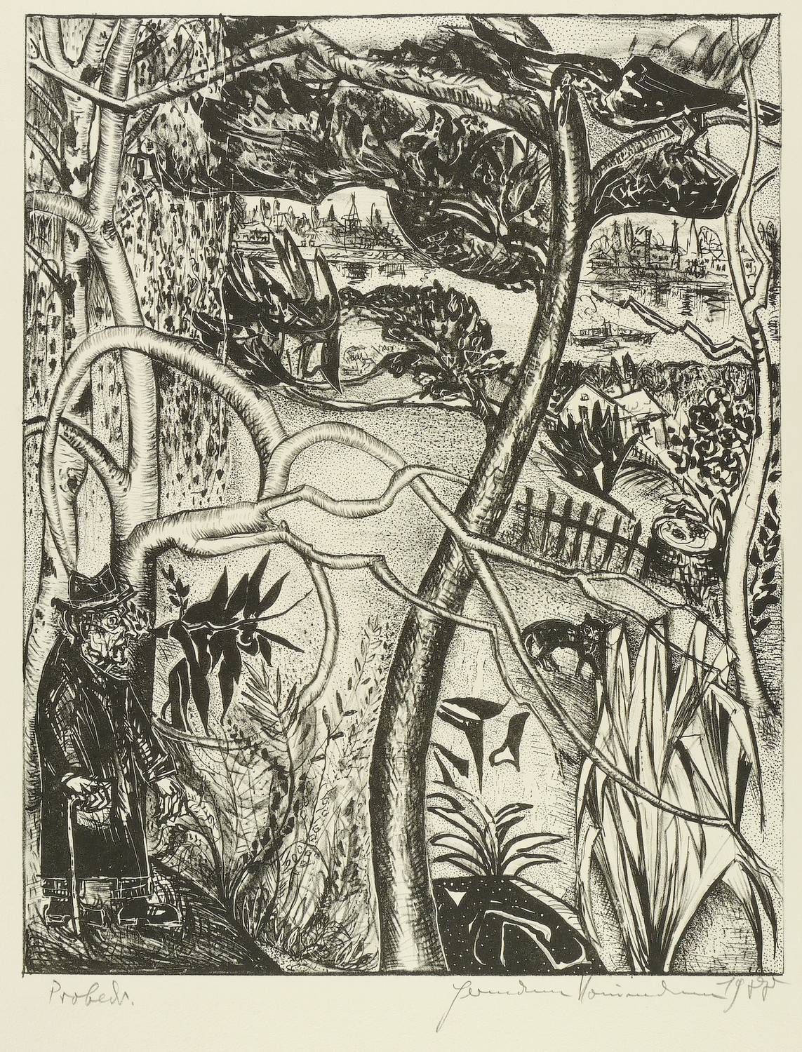 Rechts unter der Darstellung in Bleistift signiert und datiert und links bezeichnet ″Probedr.″ – Alter Mann und Katze in einem Garten am Loschwitzer Elbhang mit Blick auf die Elbe, einen Elbdampfer und das gegenüberliegende Blasewitzer Elbufer. – Im Passepartout montiert. Sehr schön erhalten.