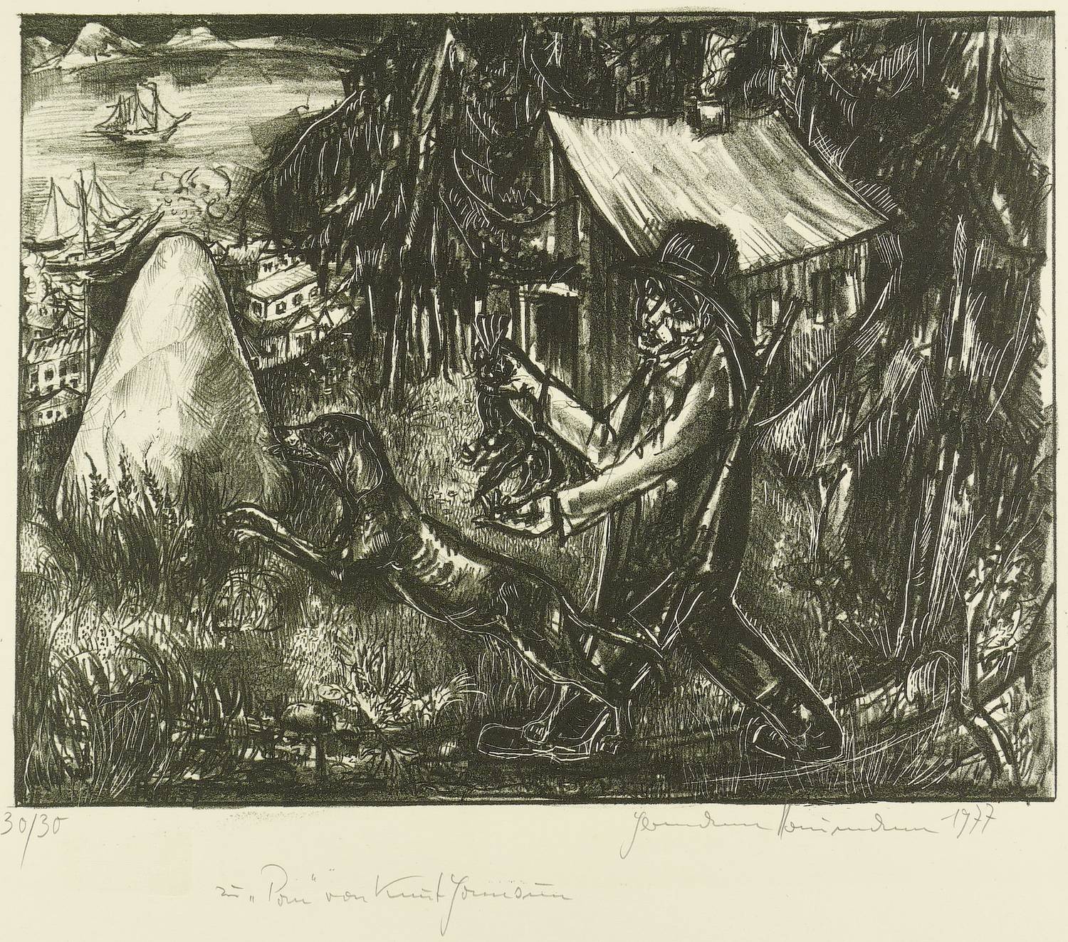 Außerhalb der Darstellung in Bleistift rechts unten signiert und datiert, links unten mit eigenhändiger Auflagenbezeichnung versehen und mittig betitelt. Im Stein unten links Trockenstempel: ″HANDPRESSENDRUCK - SCHREITER-PRESSE DRESDEN″. – Papier leicht gegilbt. Gut erhalten.