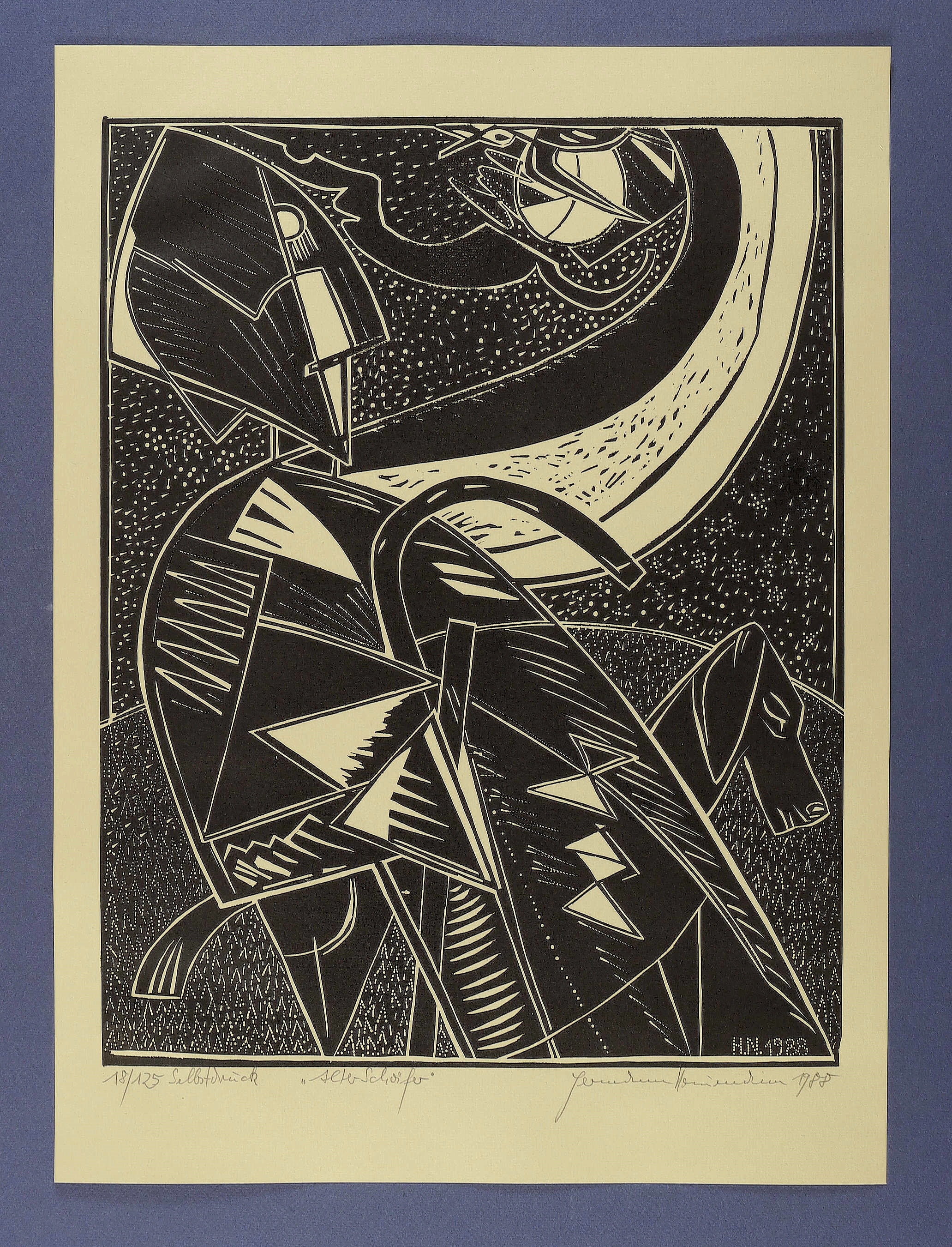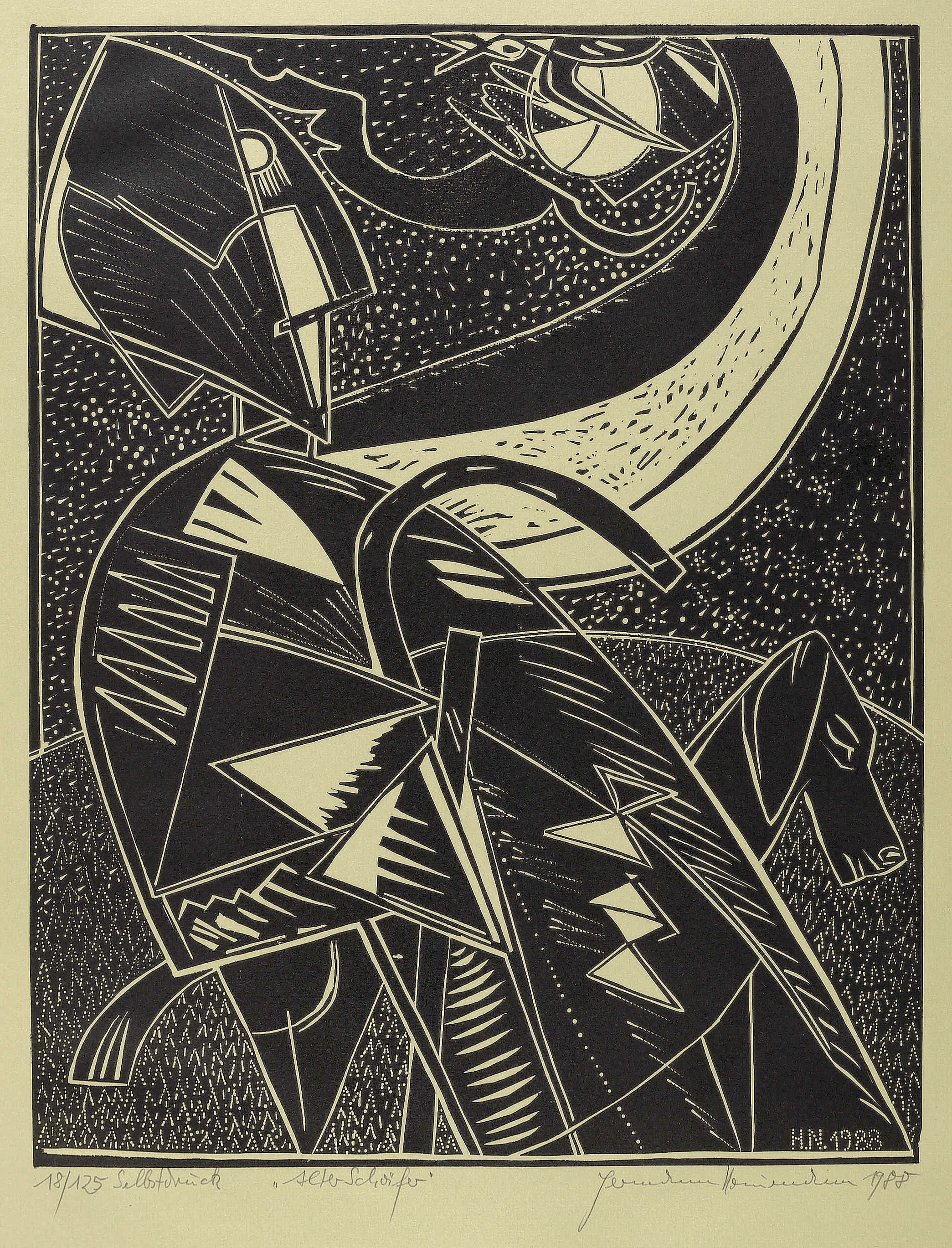1988. Holzschnitt / Weißlinienschnitt, in Schwarz, auf grünlich getöntem Maschinenbütten. – Originale Künstlergrafik, von Hermann Naumann. – Auflage Exemplar Nr. 18/125. – 44,2 x 34,7 cm (Darstellung / Druckstock), 53 x 39 cm (Blatt).