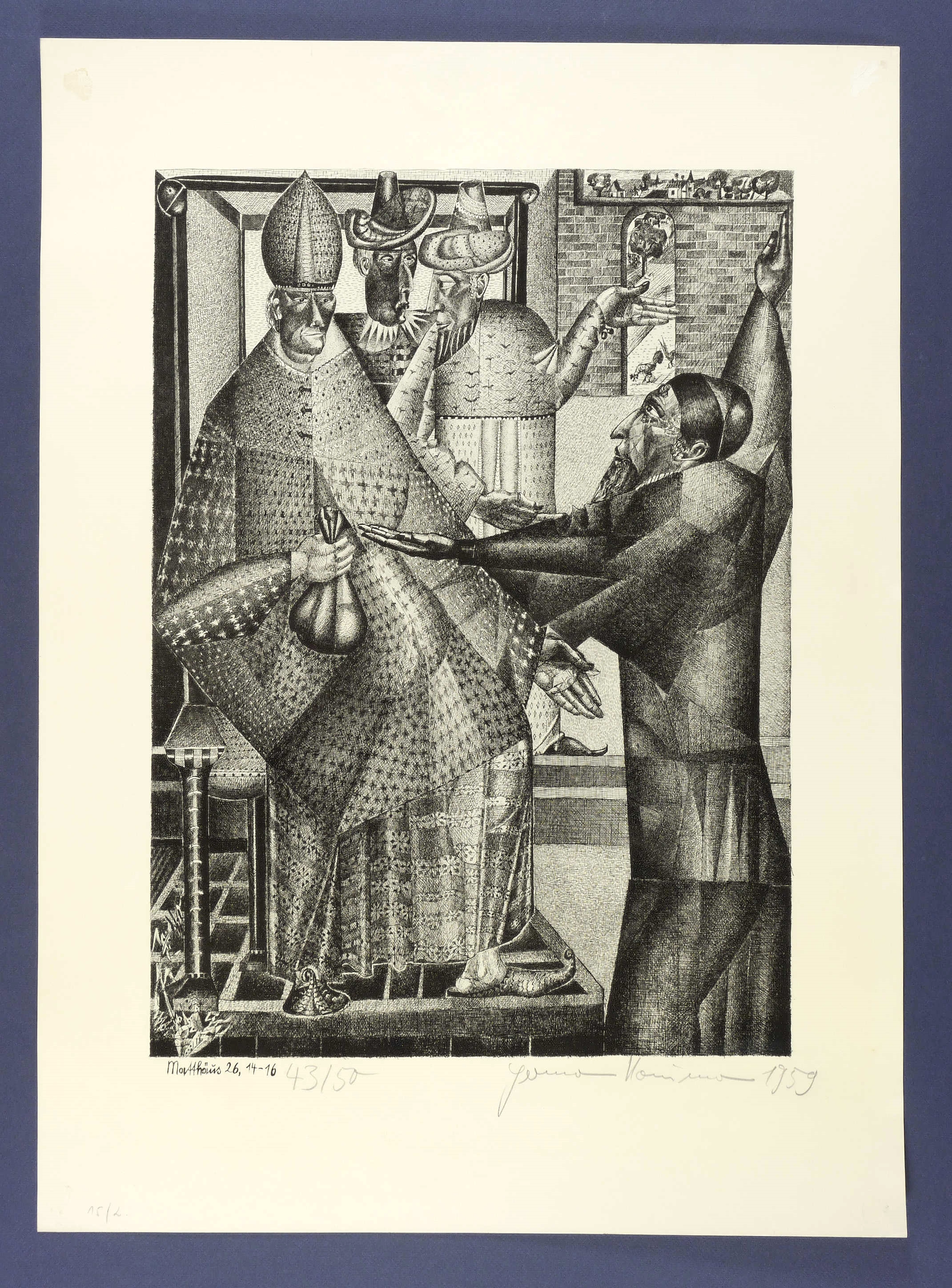 1959. Lithografie / Federlithografie, in Schwarz, über hellblauer Tonplatte, auf getöntem Karton. – Originale Künstlergrafik, von Hermann Naumann. – Auflage Exemplar Nr. 43/50. – 49,2 x 35,6 cm (Darstellung / Stein), 66 x 48 cm (Blatt).