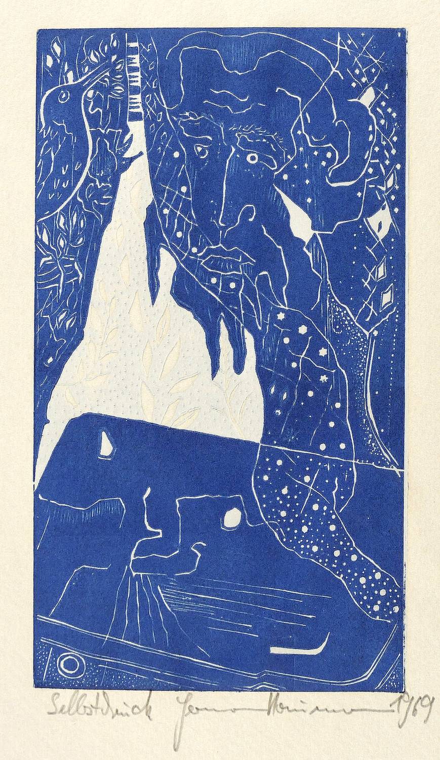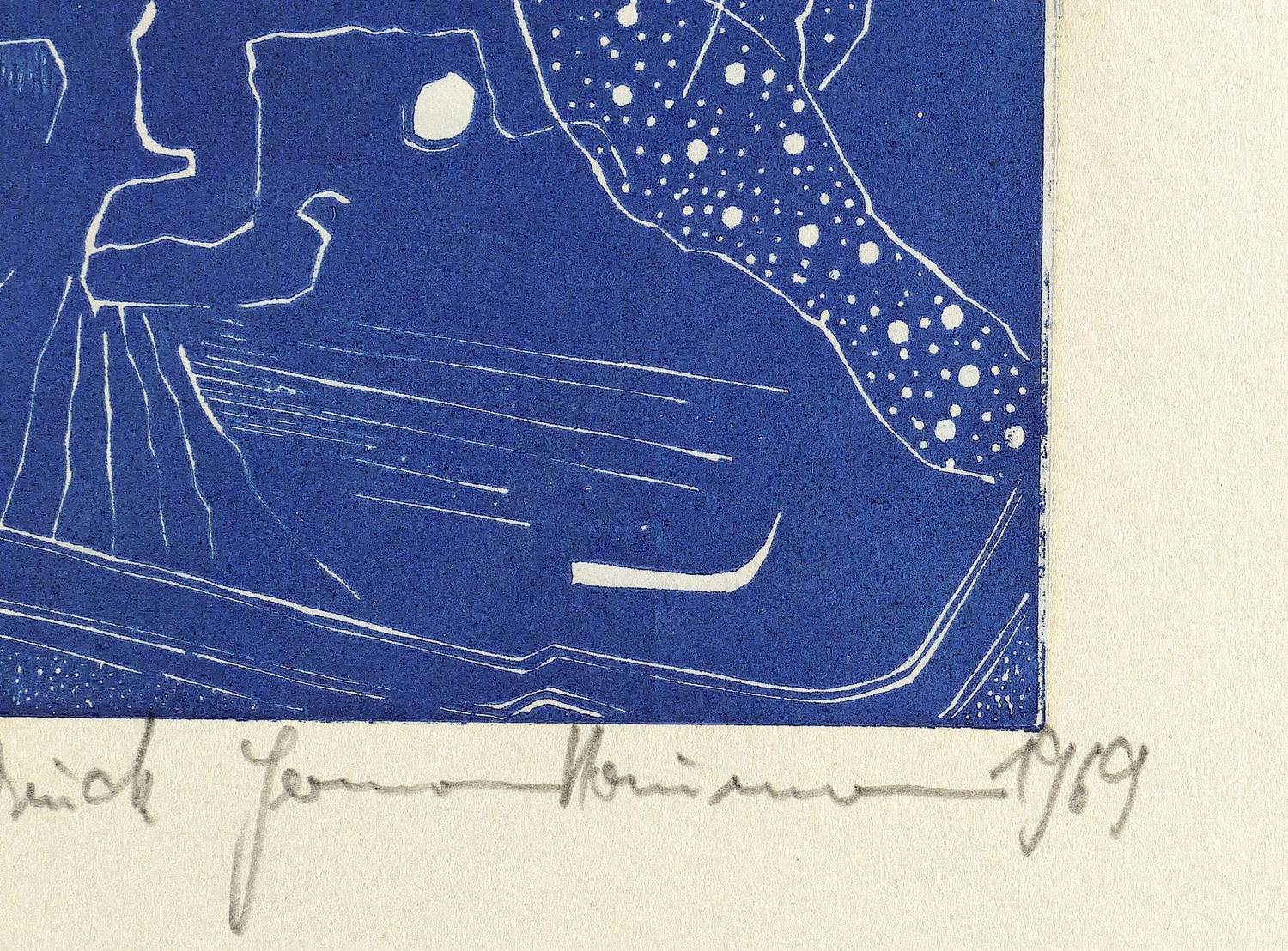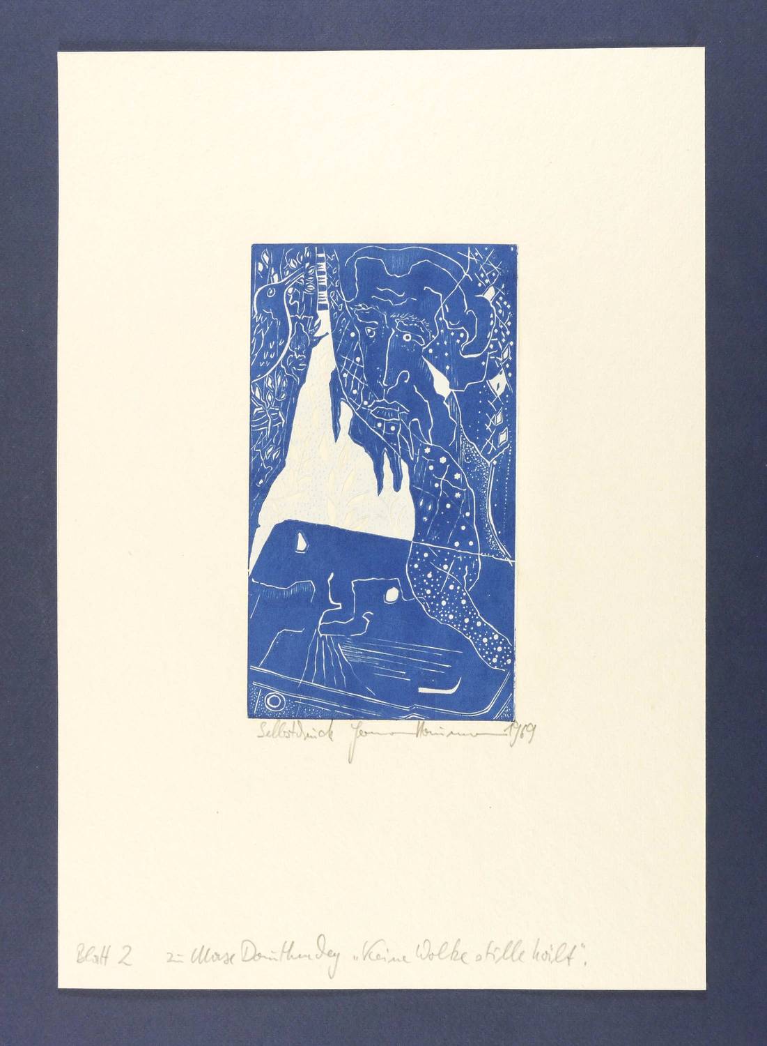 1969. Farbholzschnitt, in Hellblau & Blau, auf wolkigem Büttenkarton. – Originale Künstlergrafik, von Hermann Naumann. – 22,7 x 12,8 cm (Darstellung / Druckstock), 45 x 31 cm (Blatt).