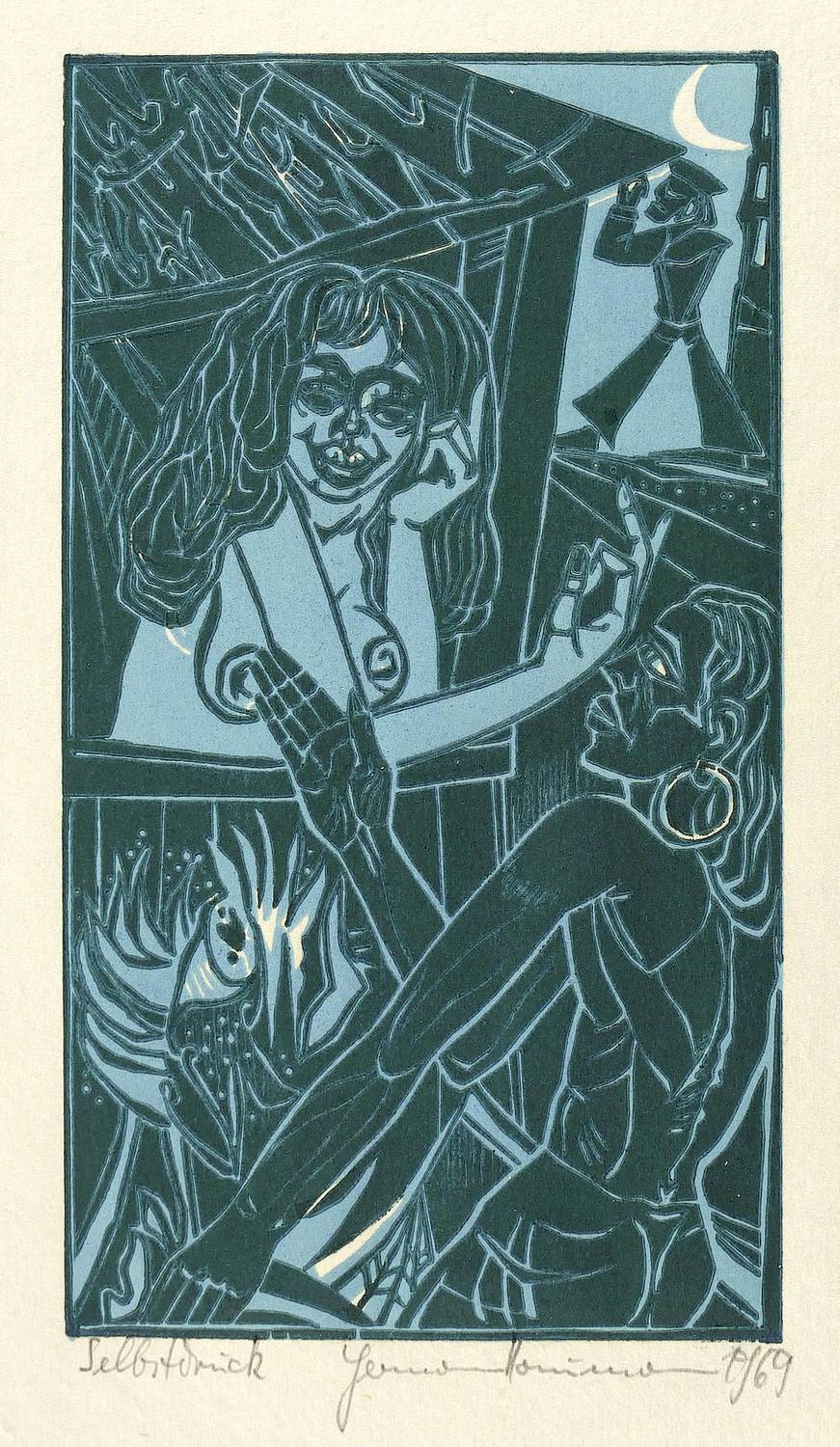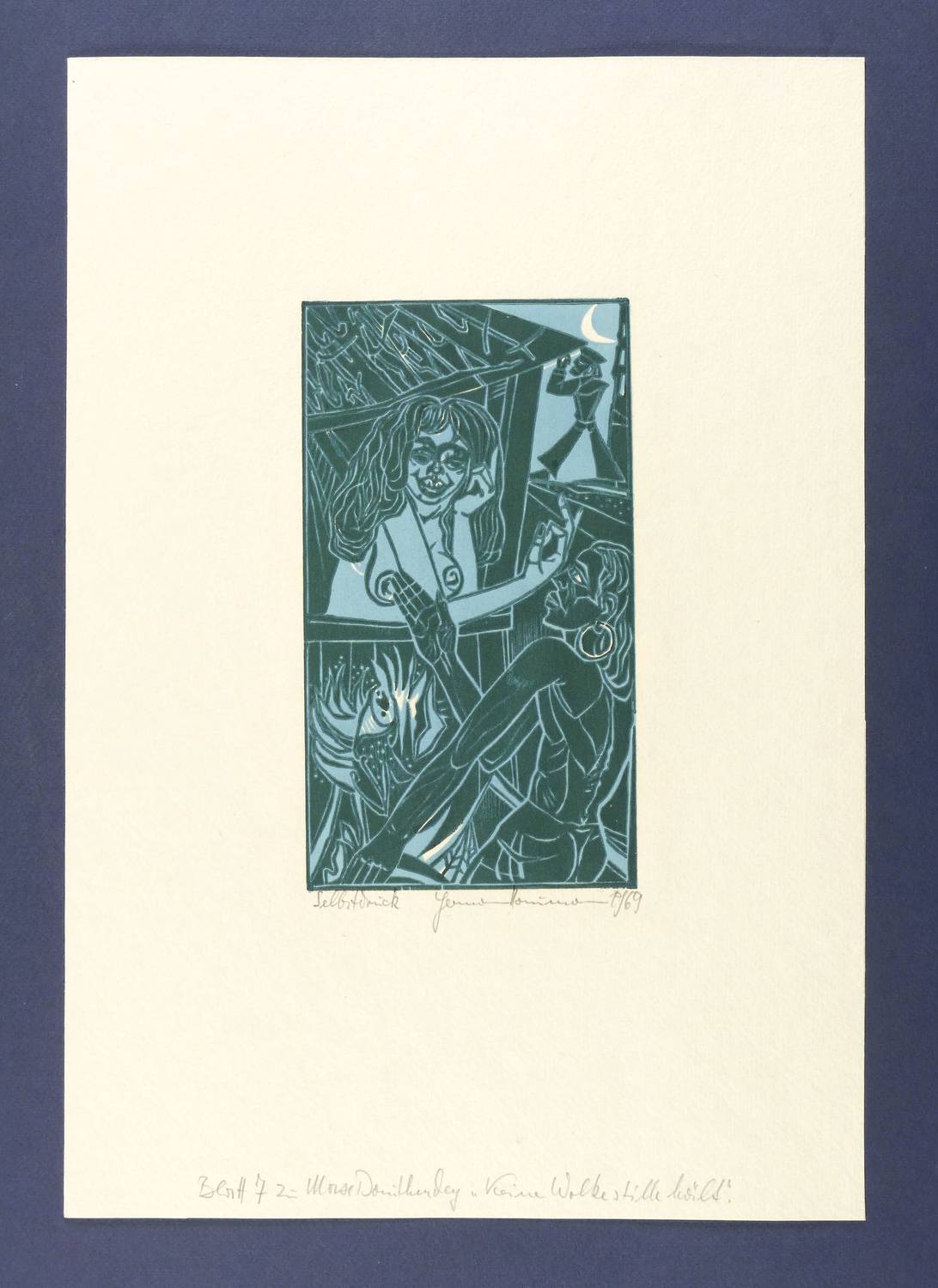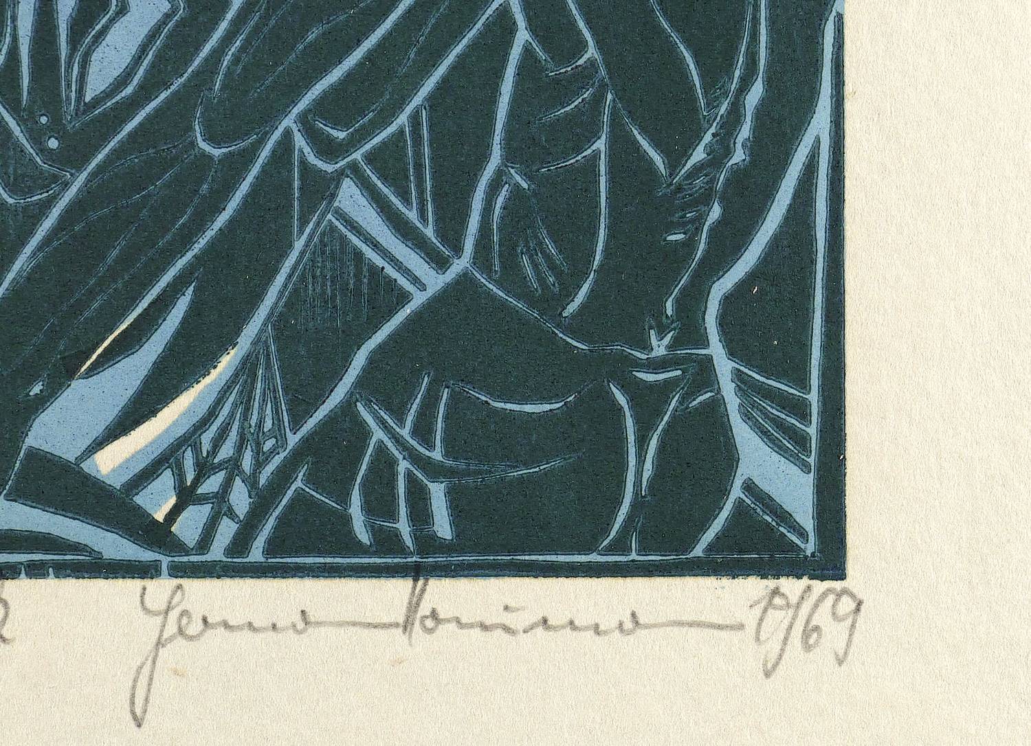 1969. Farbholzschnitt, in Hellblau & Schwarzblau, auf wolkigem Büttenkarton. – Originale Künstlergrafik, von Hermann Naumann. – 22,8 x 12,8 cm (Darstellung / Druckstock), 45 x 31 cm (Blatt).