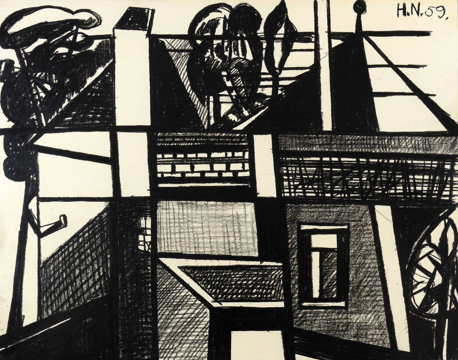 Rechts oben signiert und datiert: ″H.N. 59.″ – Aus der seltenen frühen Werkgruppe der 1959/1960 entstandenen, großformatigen und stark vom Gegenstand abstrahierenden Fettkreidezeichnungen des Künstlers. – Blattkanten minimal bestoßen. Verso Reste der originalen Montierung. Unscheinbare restaurierte Partie im oberen Bereich. Insgesamt guter Erhaltungszustand.