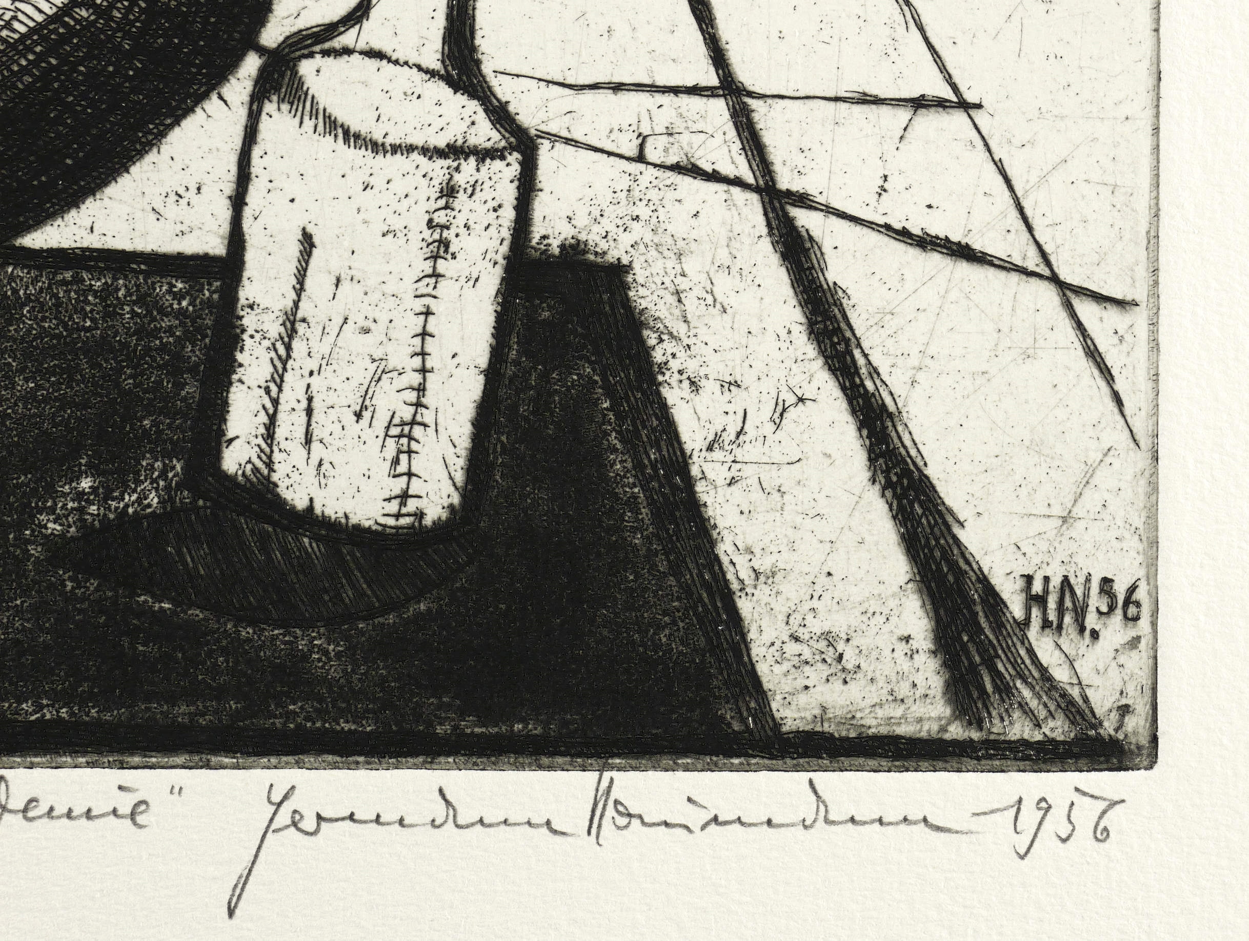 1956. Radierung / Strichätzung, Roulette & Punzenstich, in Schwarz, auf hellchamois Hahnemühle. – Originale Künstlergrafik, von Hermann Naumann. – Auflage Exemplar Nr. 76/100. – 39,5 x 29,7 cm (Darstellung / Platte), 50 x 39 cm (Blatt).