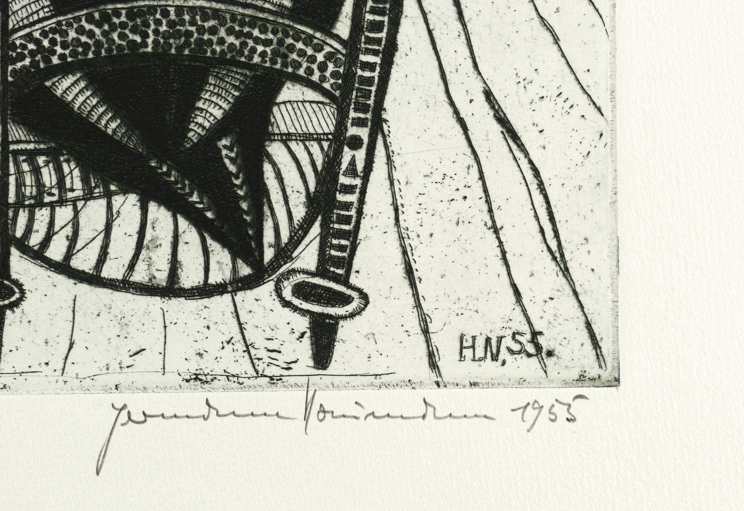 1955. Radierung / Strichätzung, in Schwarz, auf hellchamois Hahnemühle. – Originale Künstlergrafik, von Hermann Naumann. – Auflage Exemplar Nr. 76/100. – 32,7 x 24,4 cm (Darstellung / Platte), 50 x 39 cm (Blatt).