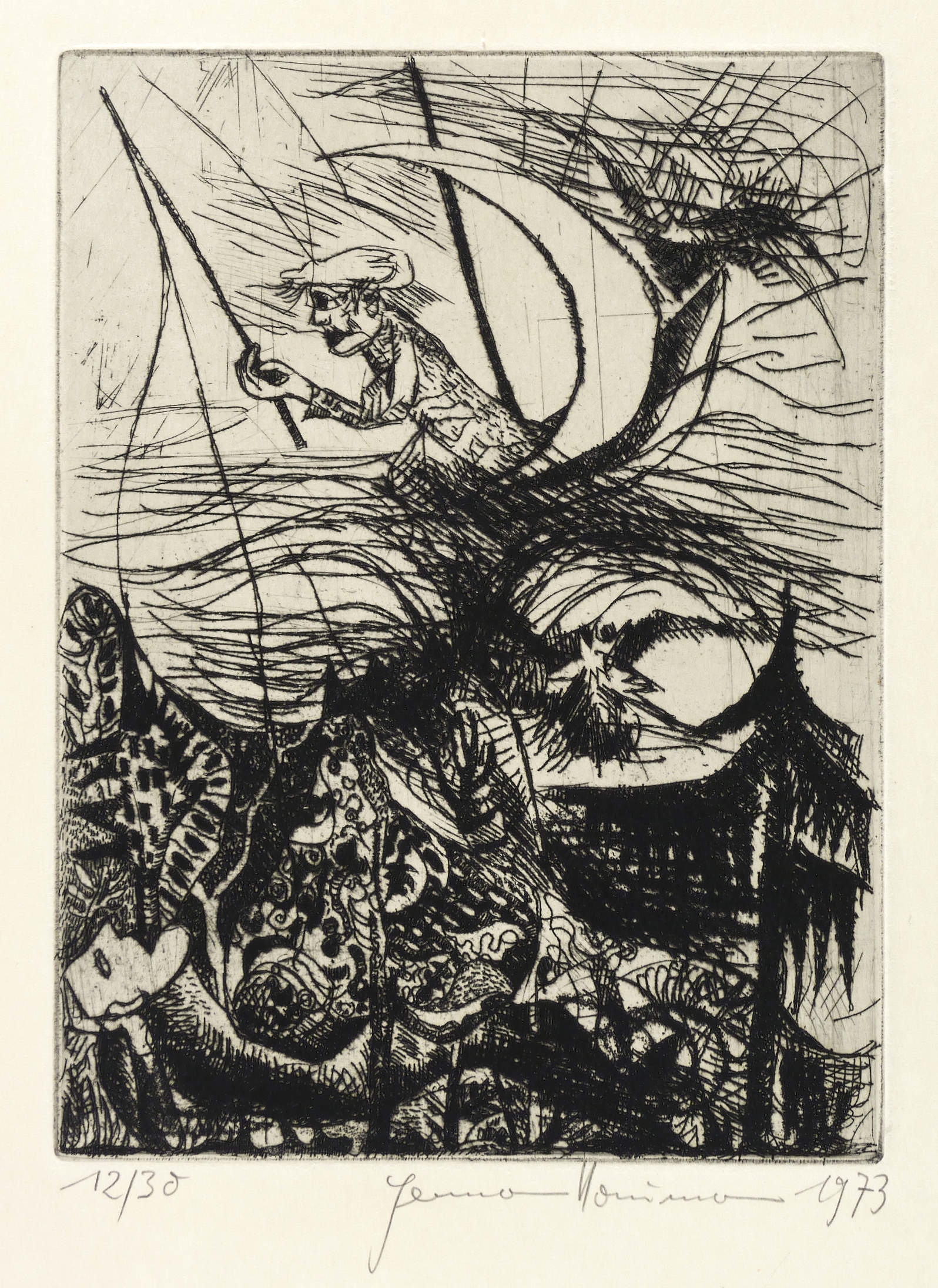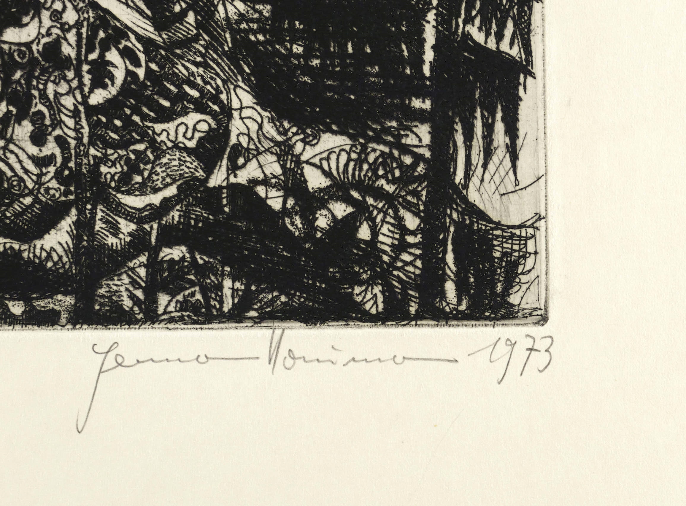 Rechts unten in Bleistift signiert und datiert. Links Auflagenbezeichnung. – Blatt aus der Folge von 10 Radierungen zu den ″Mysterien″ von Knut Hamsun (1973). – Papier leicht gegilbt, an den Rändern etwas bestoßen und knickspurig. Insgesamt guter Zustand.