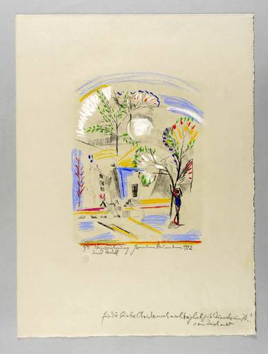 Rechts unten in Bleistift signiert und datiert. Links dazu Auflagen- und Technikbezeichnung. Am unteren Blattrand eigenhändige Widmung. Prägestempel des Druckers Christian Müller. Wasserzeichen. – Papier rechts unten leicht berieben und angeschmutzt. Wenige Knickspuren. Insgesamt aber noch guter Zustand.