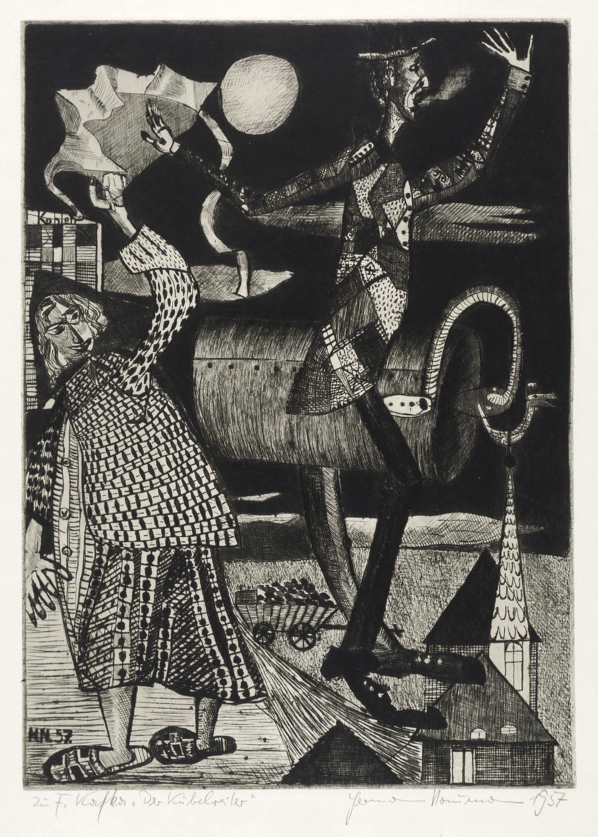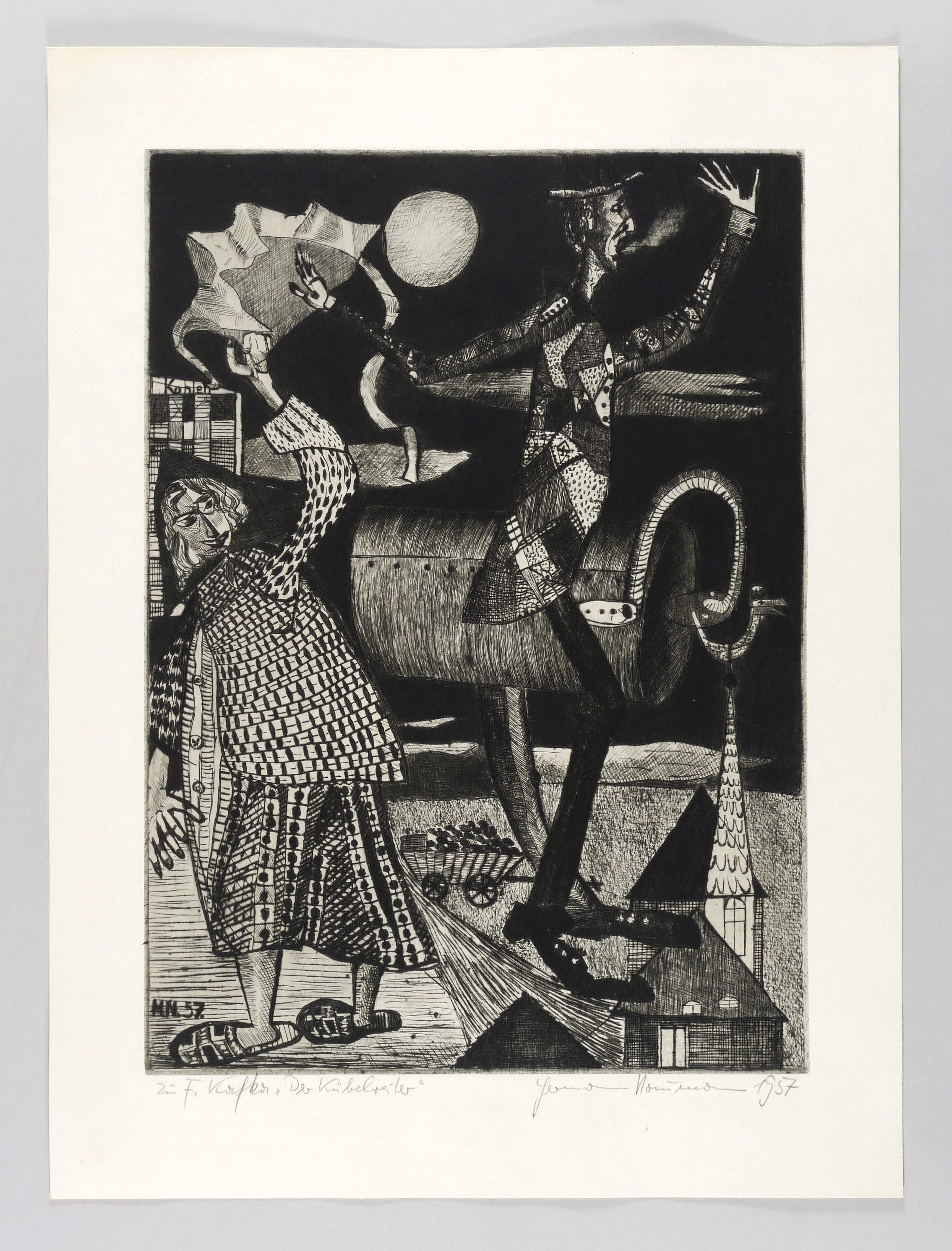 1957. Radierung / Strichätzung & Kaltnadel, mit Plattenton, in Schwarz, auf hellchamois Velinkarton. – Originale Künstlergrafik, von Hermann Naumann. – 49,9 x 36,0 cm (Darstellung / Platte), 62 x 46 cm (Blatt).