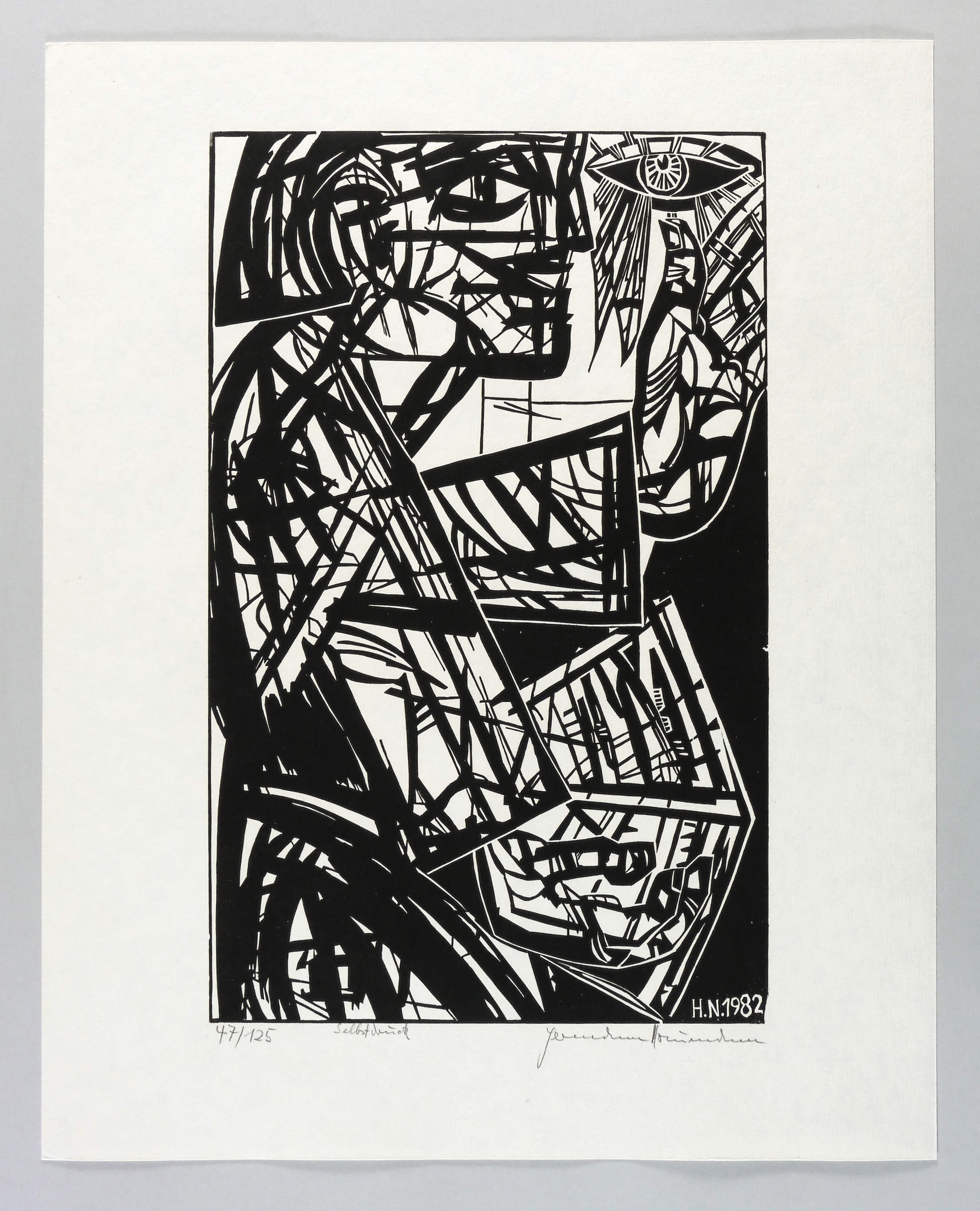 1982. Holzschnitt, in Schwarz, auf wolkigem rauem Büttenpapier. – Originale Künstlergrafik, von Hermann Naumann. – Auflage Exemplar Nr. 47/125. – 40,0 x 25,0 cm (Darstellung / Druckstock), 50 x 40 cm (Blatt).