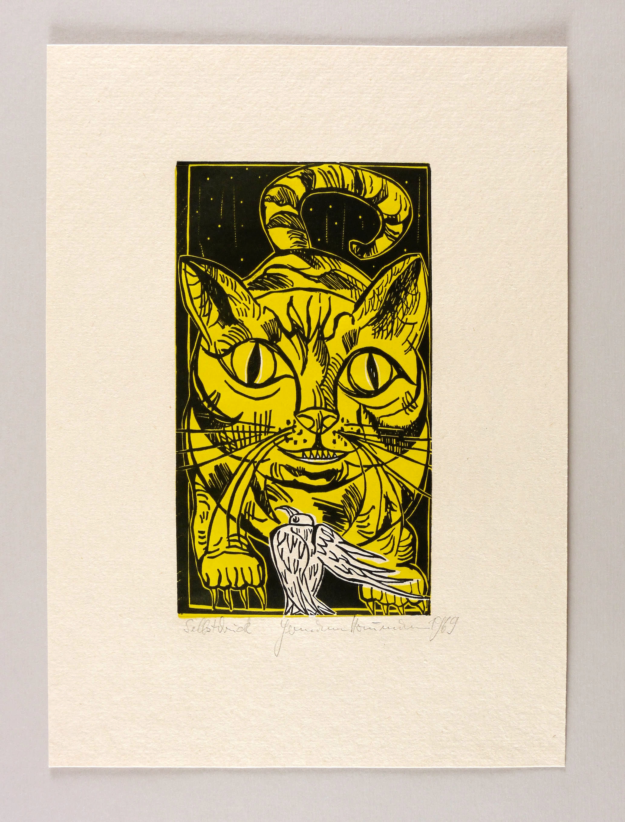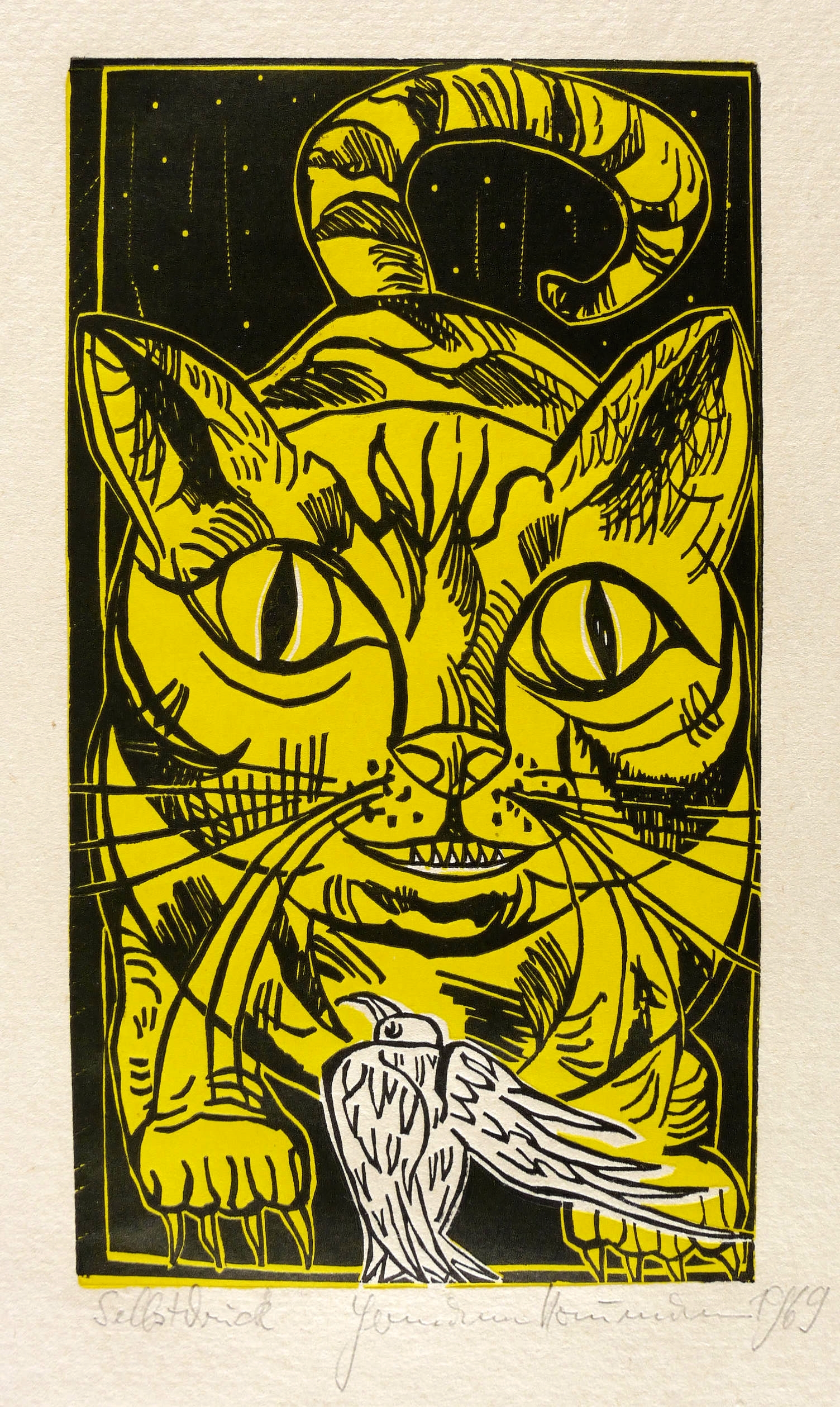1969. Farbholzschnitt, in Gelb & Schwarz, auf wolkigem Büttenkarton. – Originale Künstlergrafik, von Hermann Naumann. – 22,9 x 12,8 cm (Darstellung / Druckstock), 37 x 27 cm (Blatt).