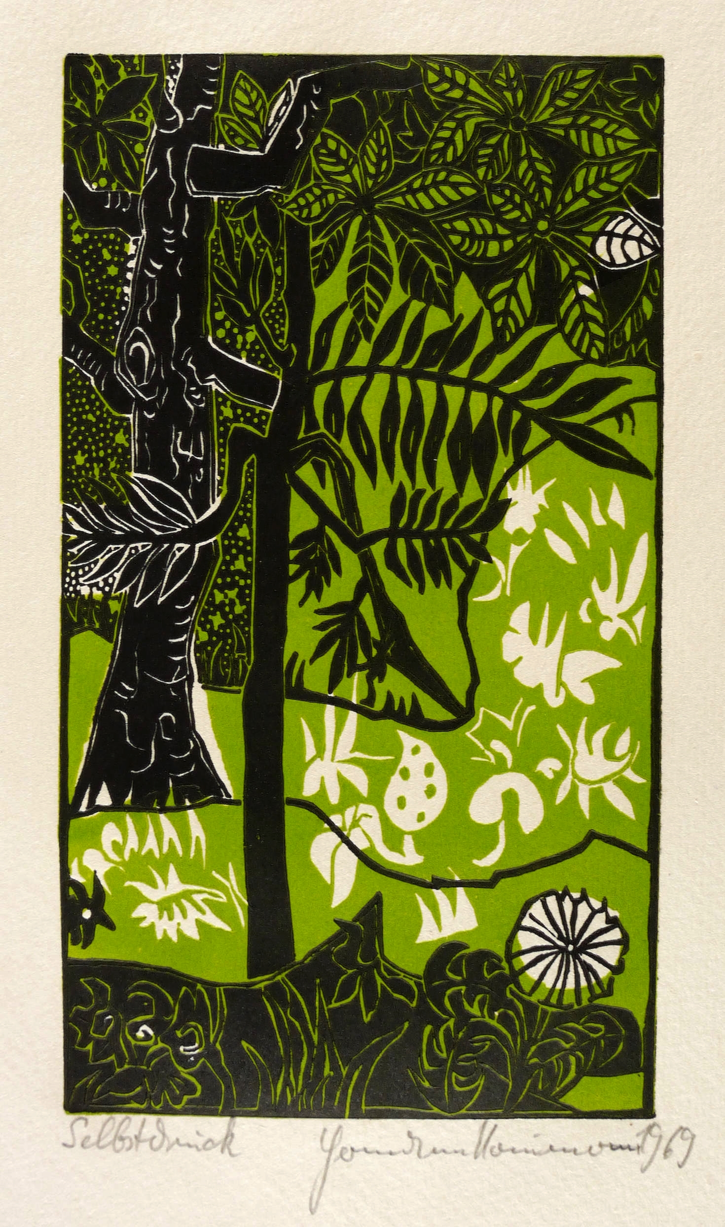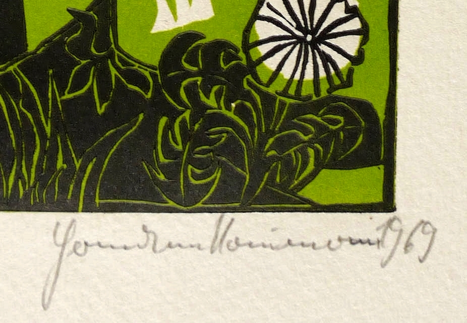 1969. Farbholzschnitt, in Grün & Schwarz, auf wolkigem Büttenkarton. – Originale Künstlergrafik, von Hermann Naumann. – 22,8 x 12,8 cm (Darstellung / Druckstock), 37 x 27 cm (Blatt).